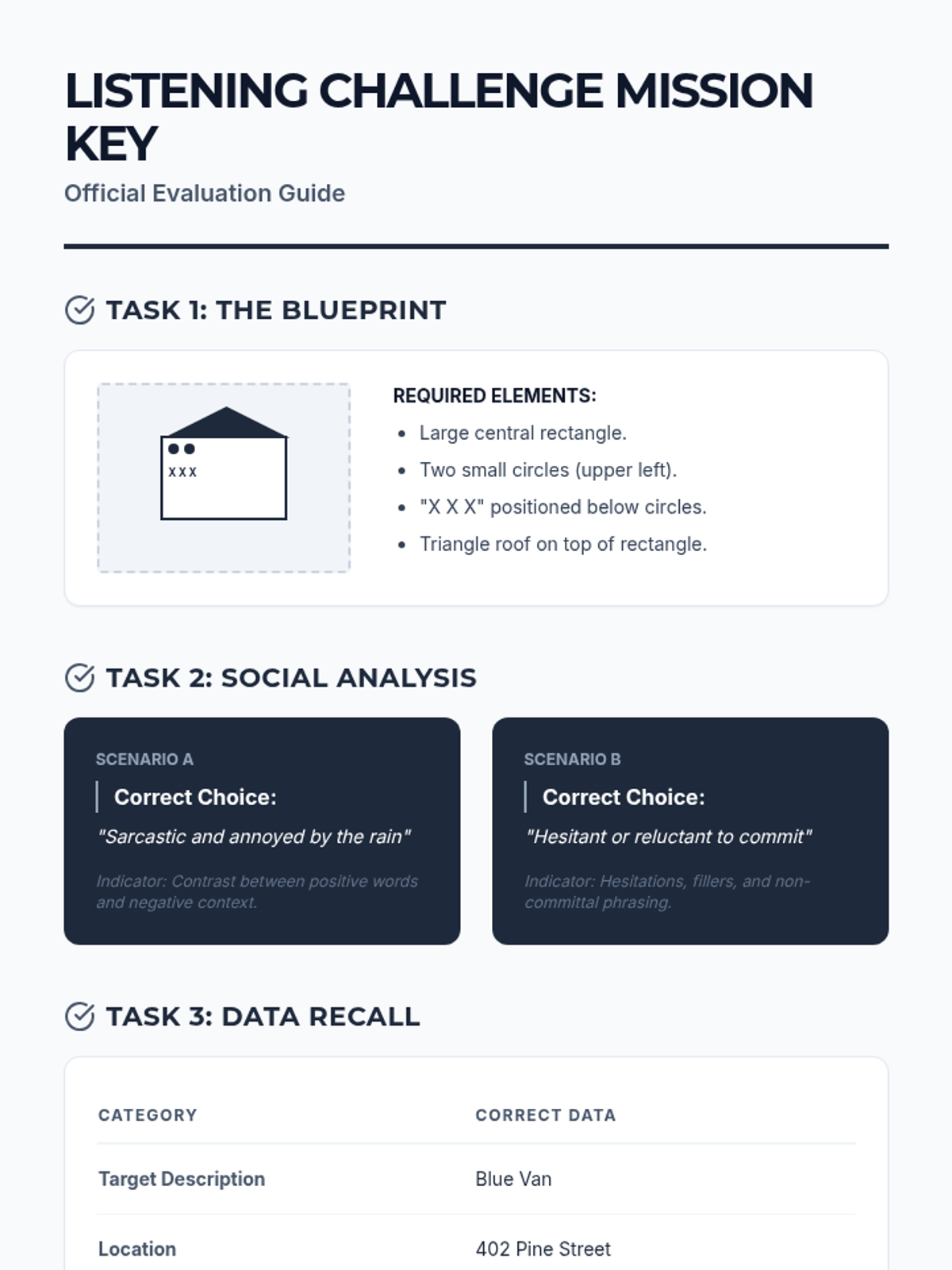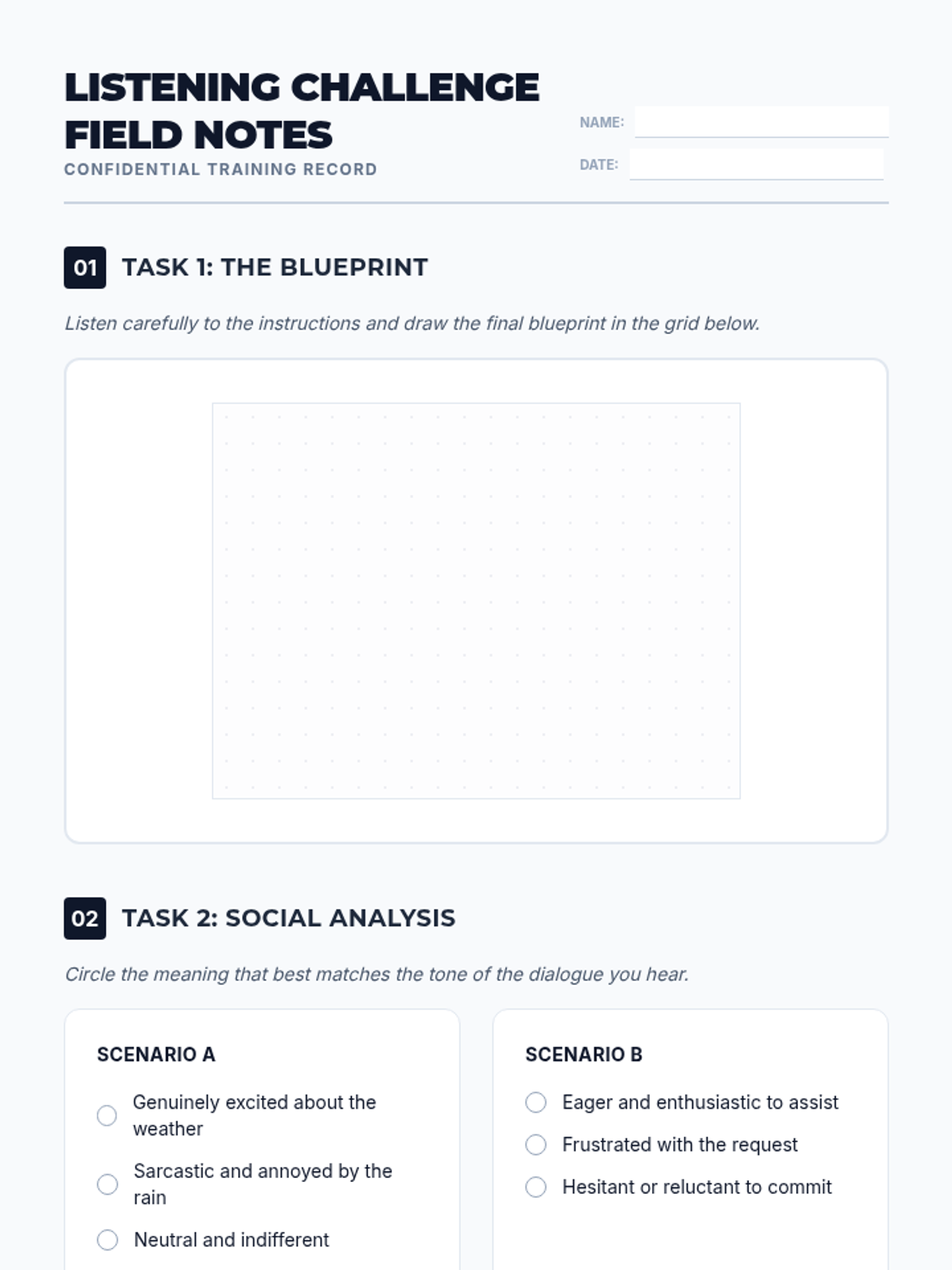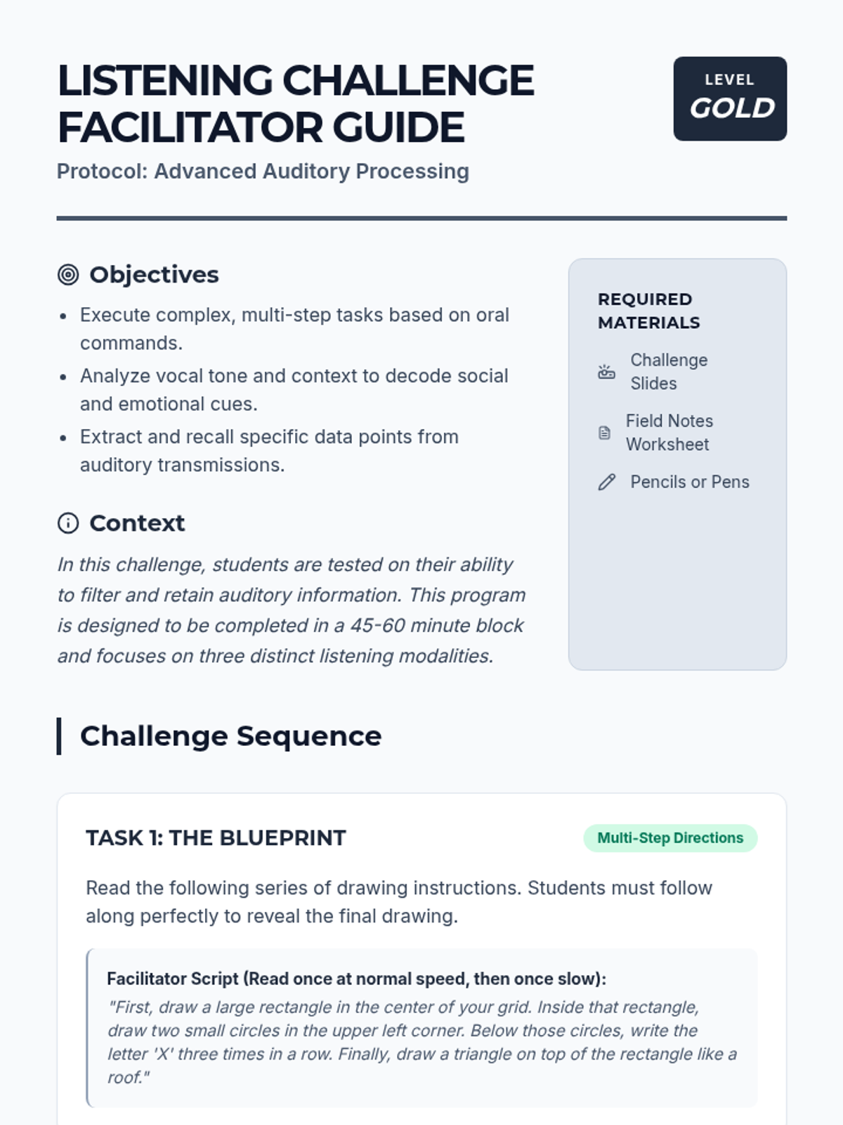 A comprehensive mission-based challenge where students sharpen their ability to follow directions, interpret social cues, and recall auditory information.