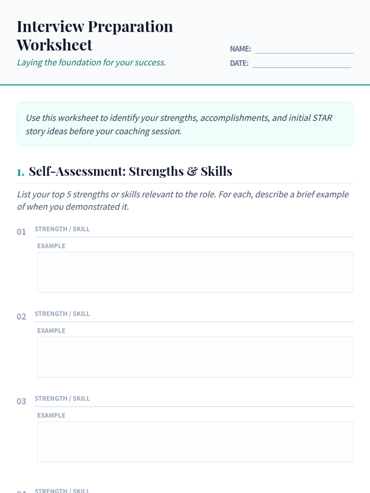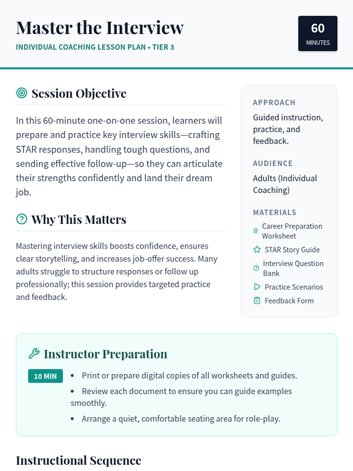 A 60-minute individual coaching session for adults focusing on interview preparation, the STAR method, handling behavioral questions, and professional follow-up techniques.