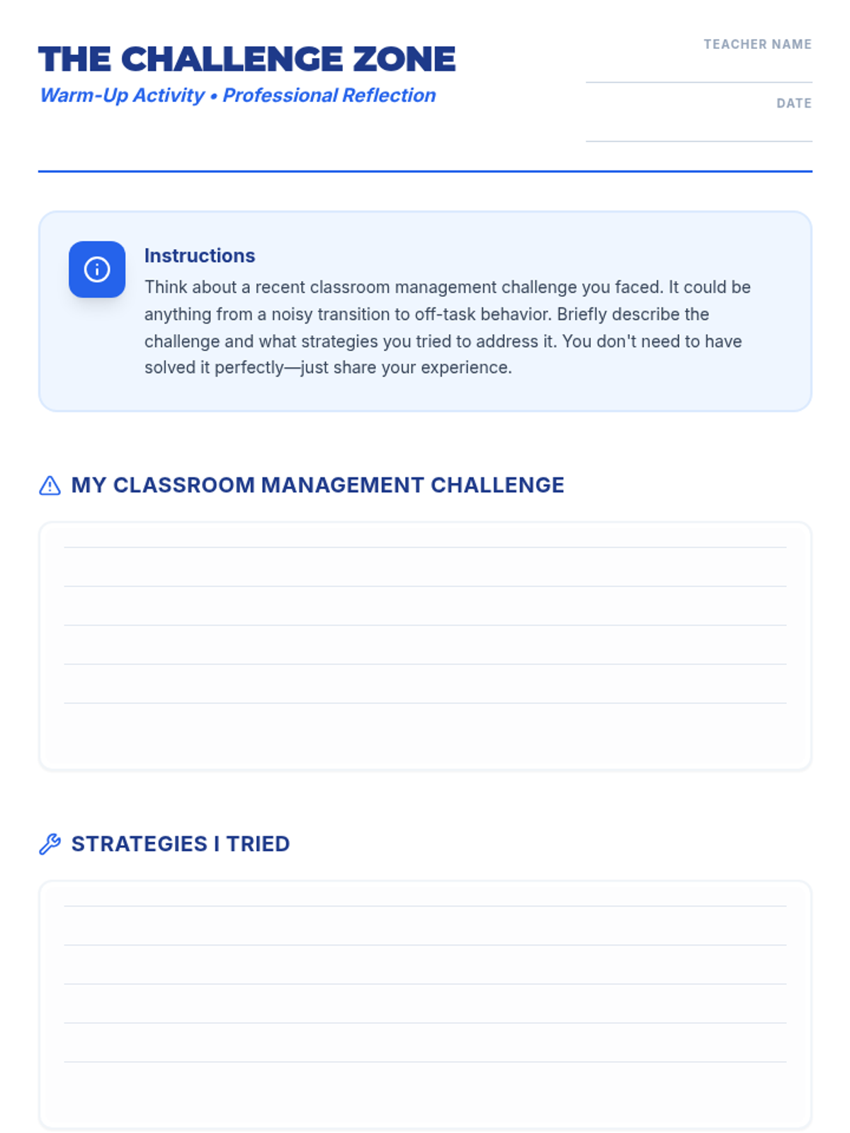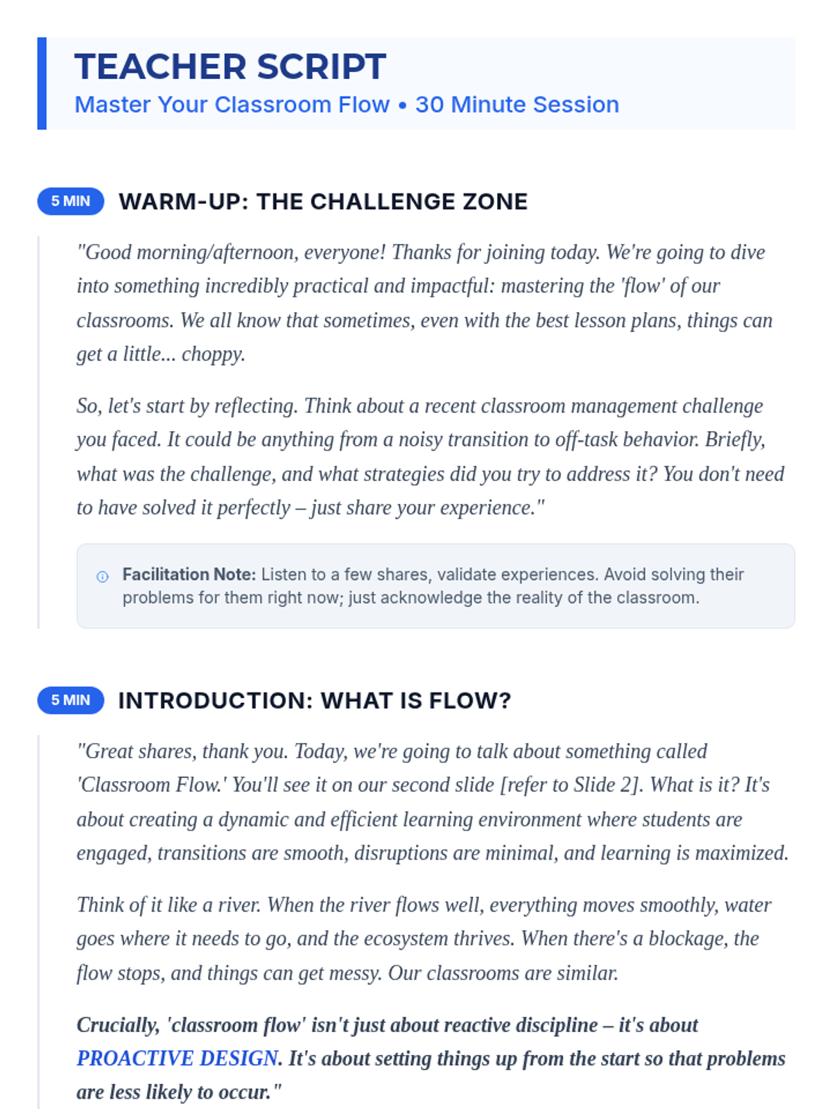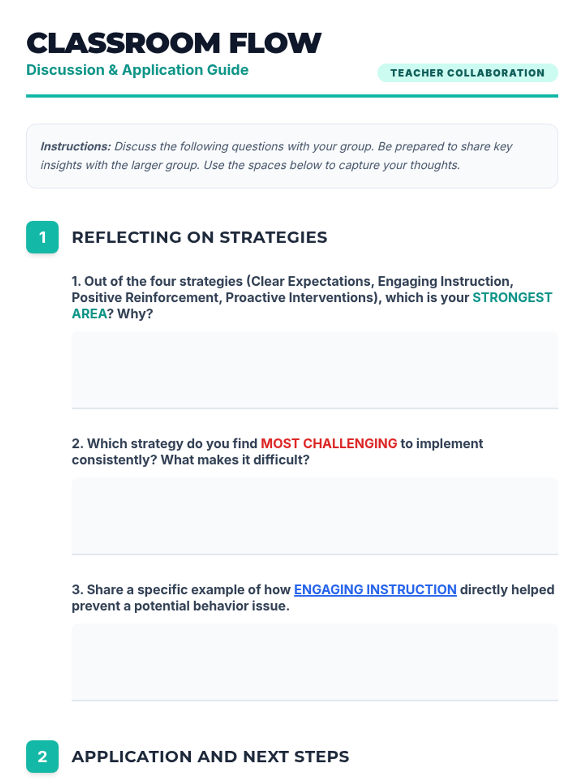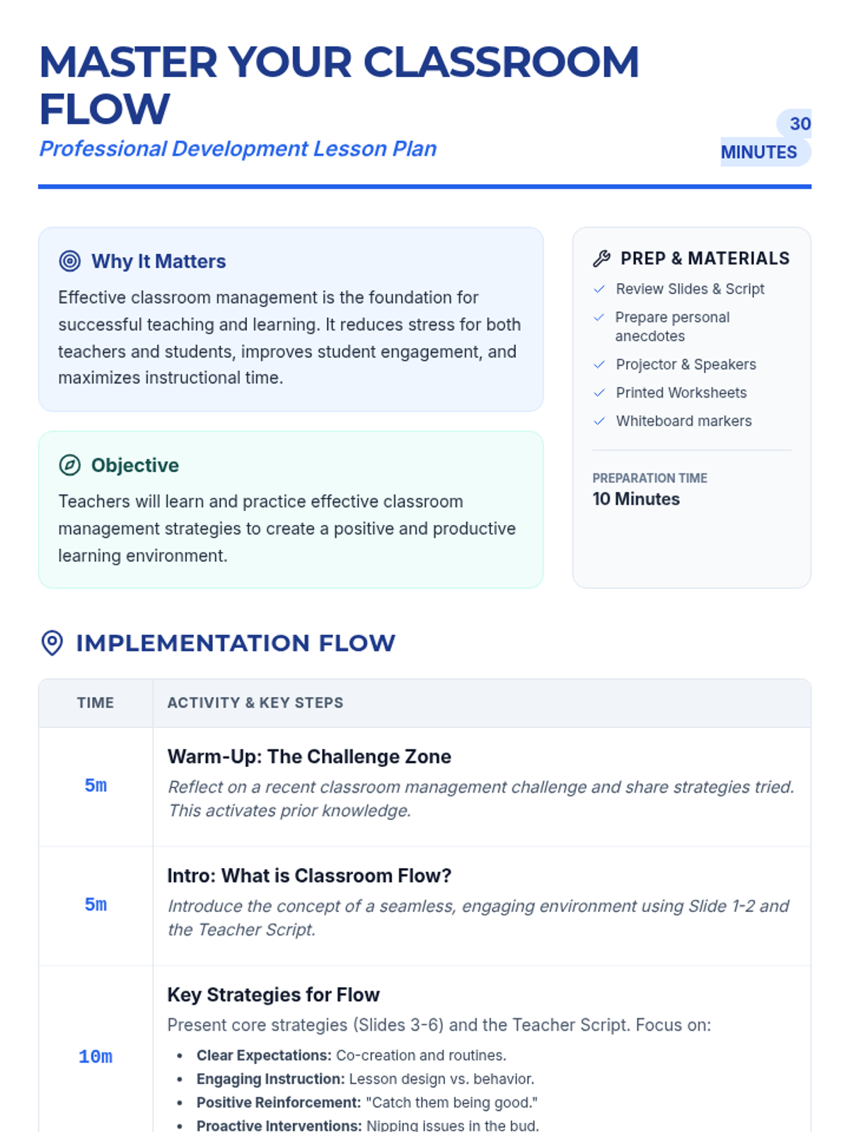 A 30-minute professional development session for teachers focused on proactive classroom management strategies, including clear expectations, engaging instruction, and positive reinforcement.