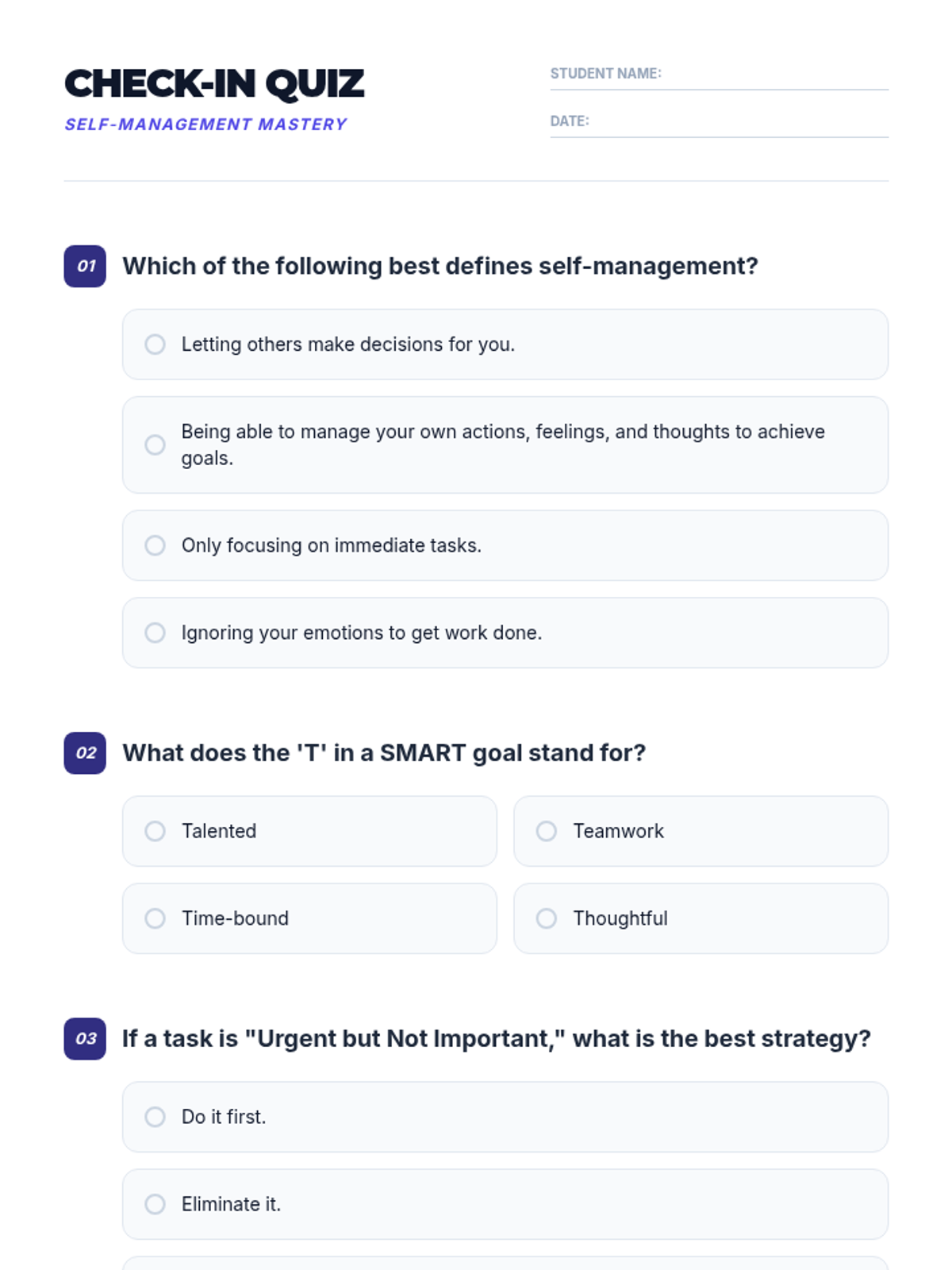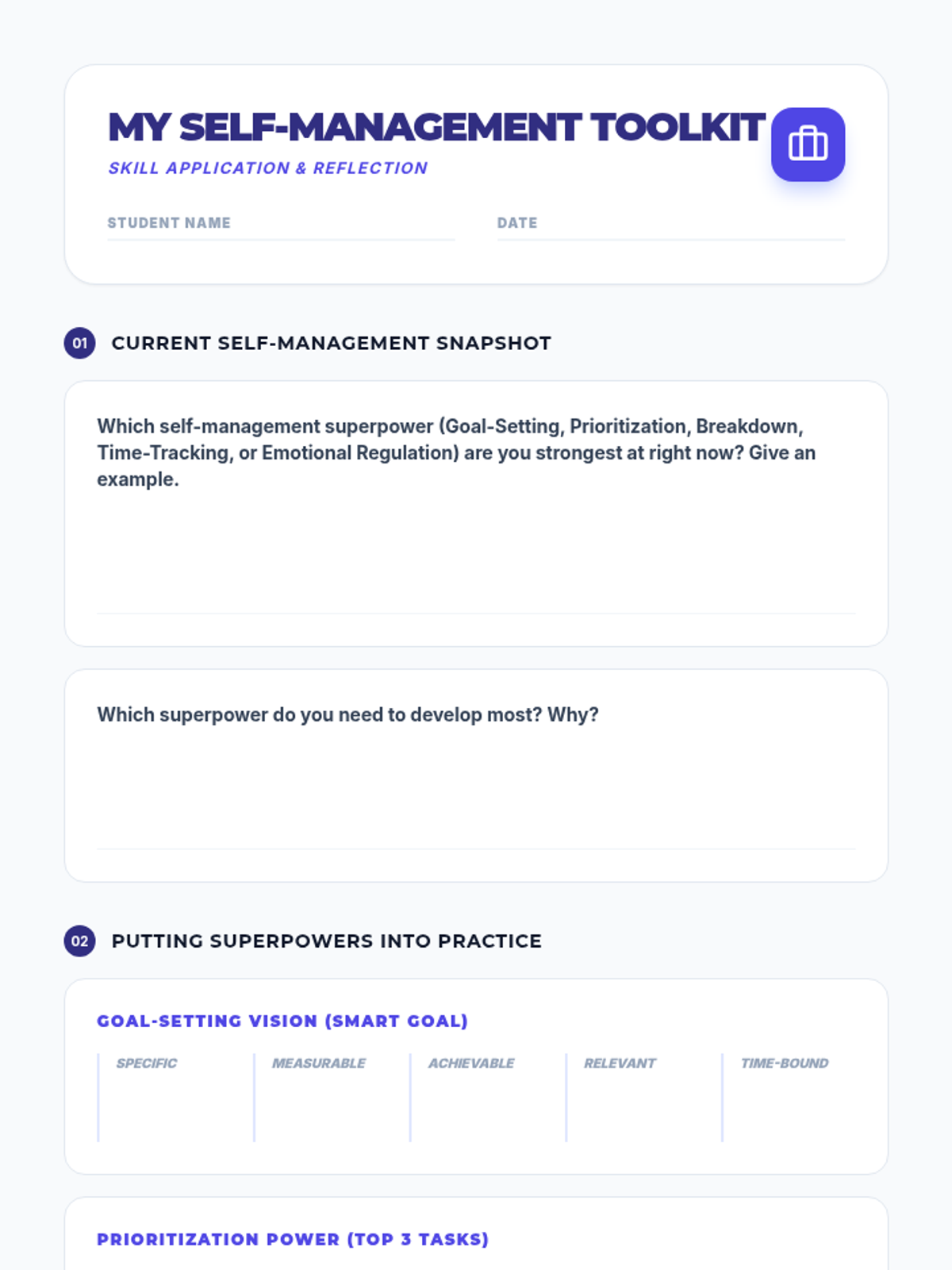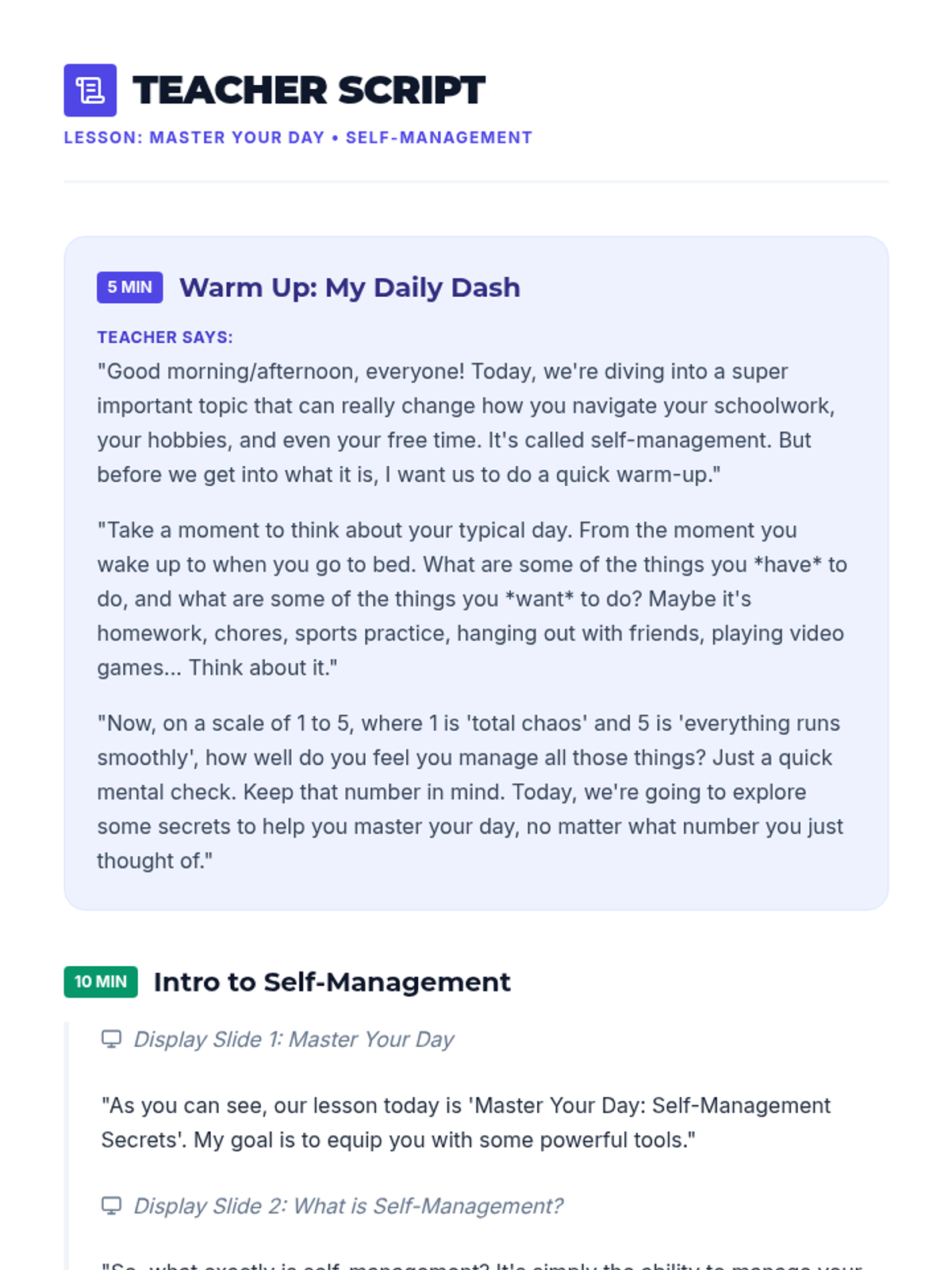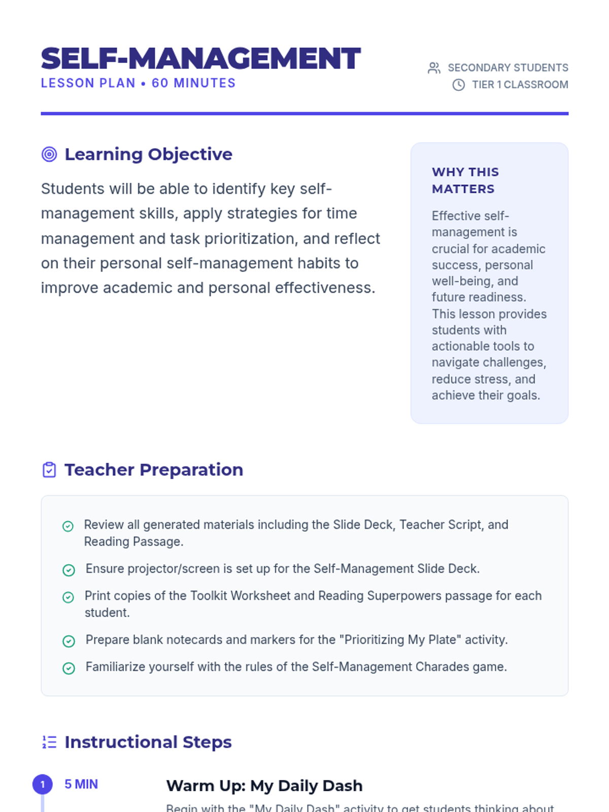 This lesson empowers secondary students with practical self-management strategies, helping them take control of their time, tasks, and well-being. By learning to organize, prioritize, and reflect, students will enhance their academic performance and reduce stress.