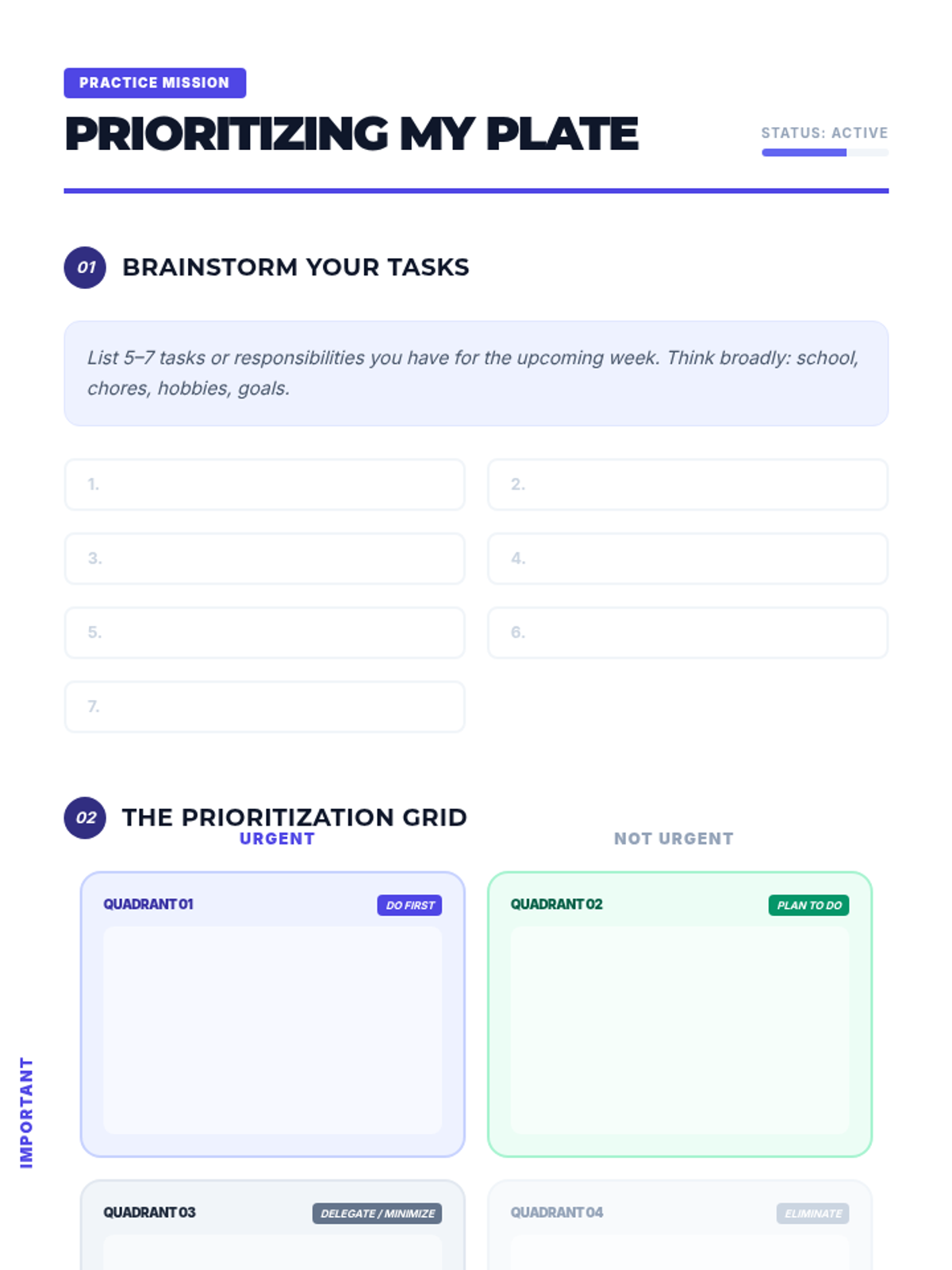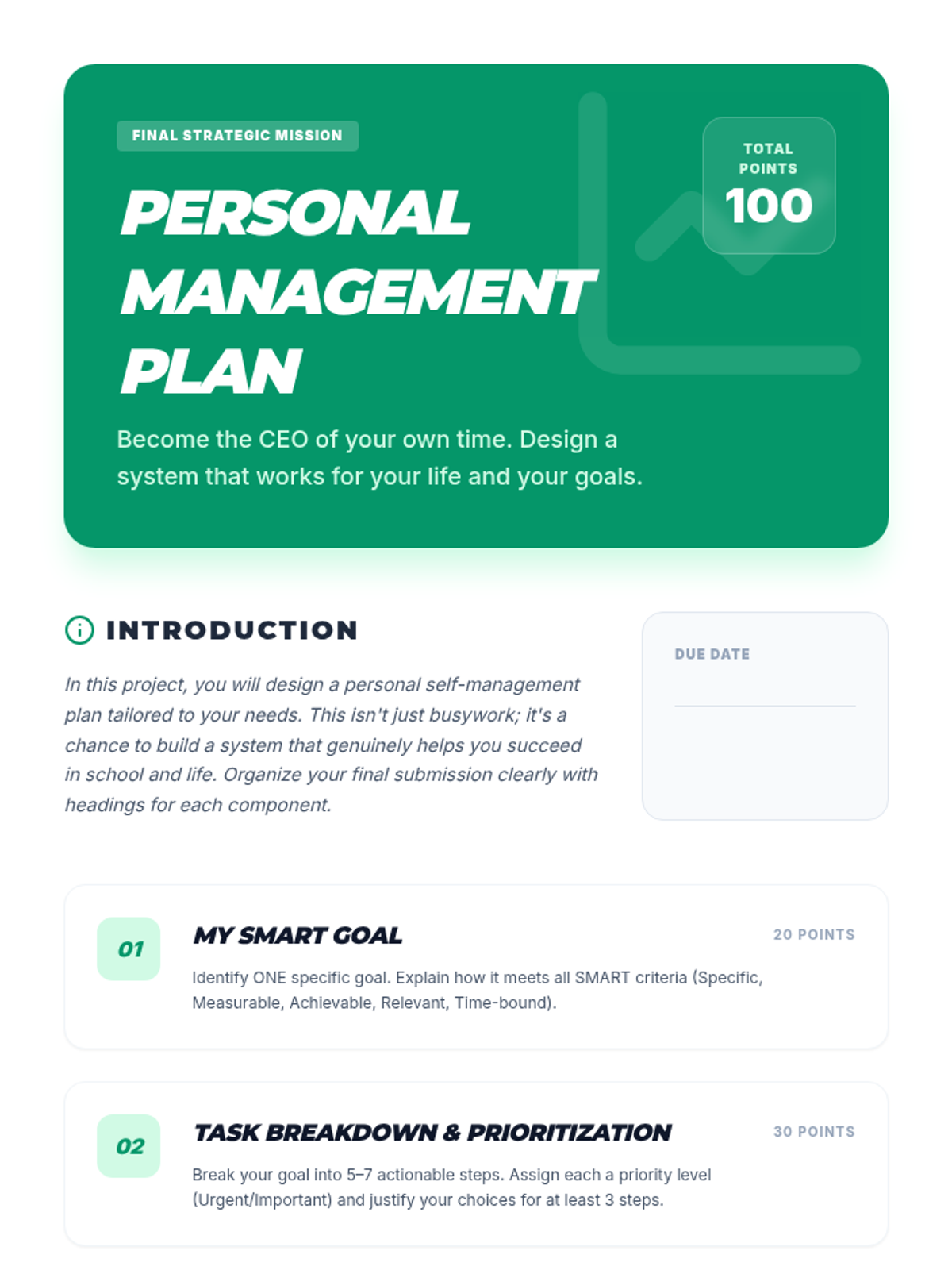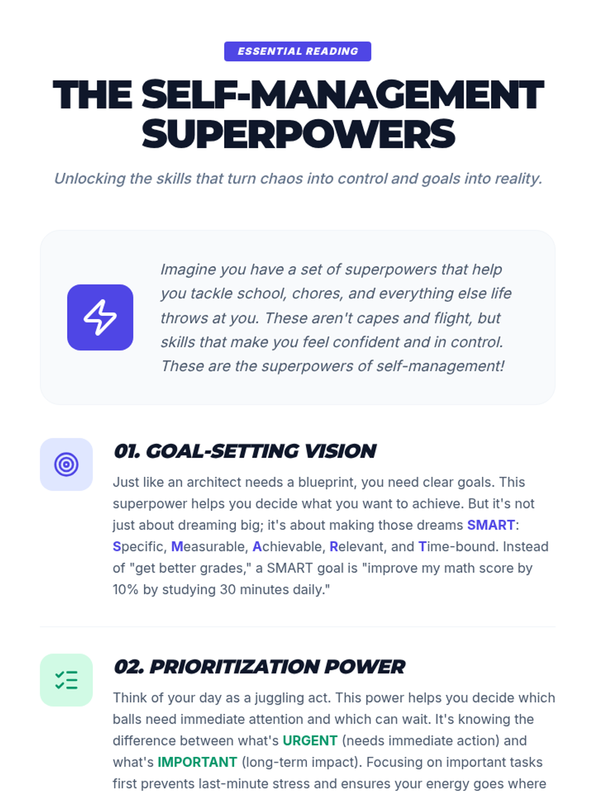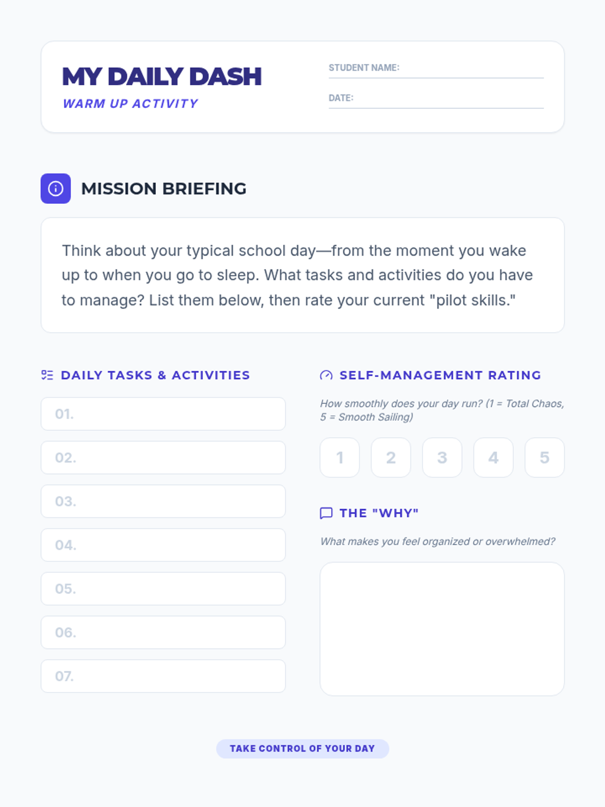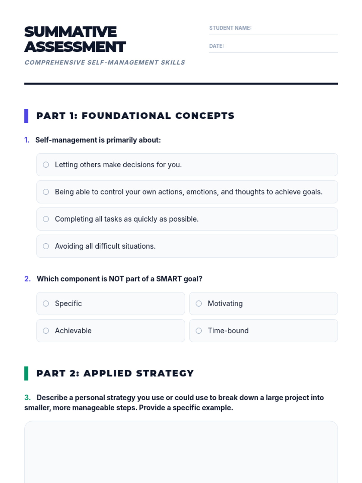 This lesson empowers secondary students with practical self-management strategies, helping them take control of their time, tasks, and well-being. By learning to organize, prioritize, and reflect, students will enhance their academic performance and reduce stress.
