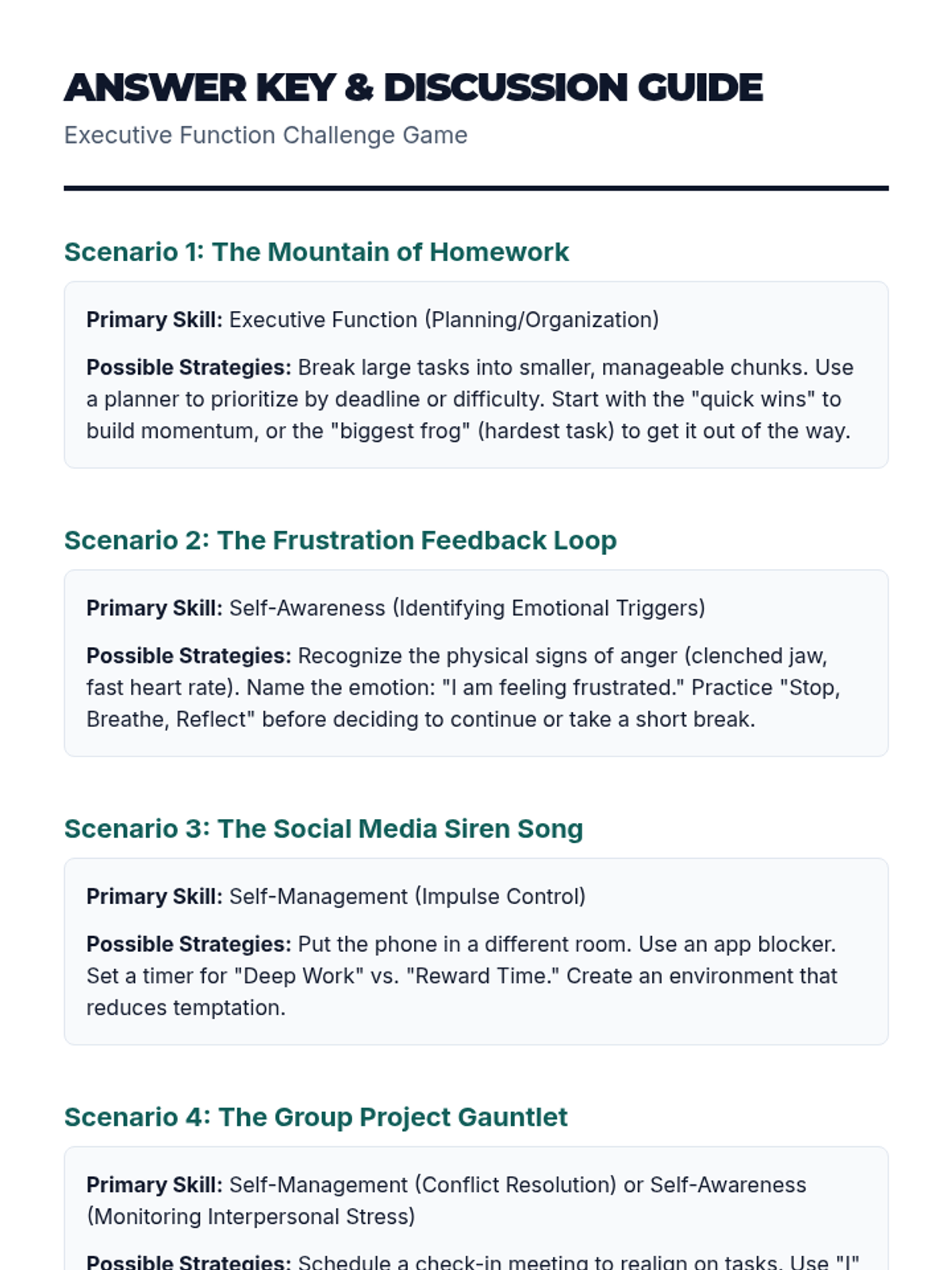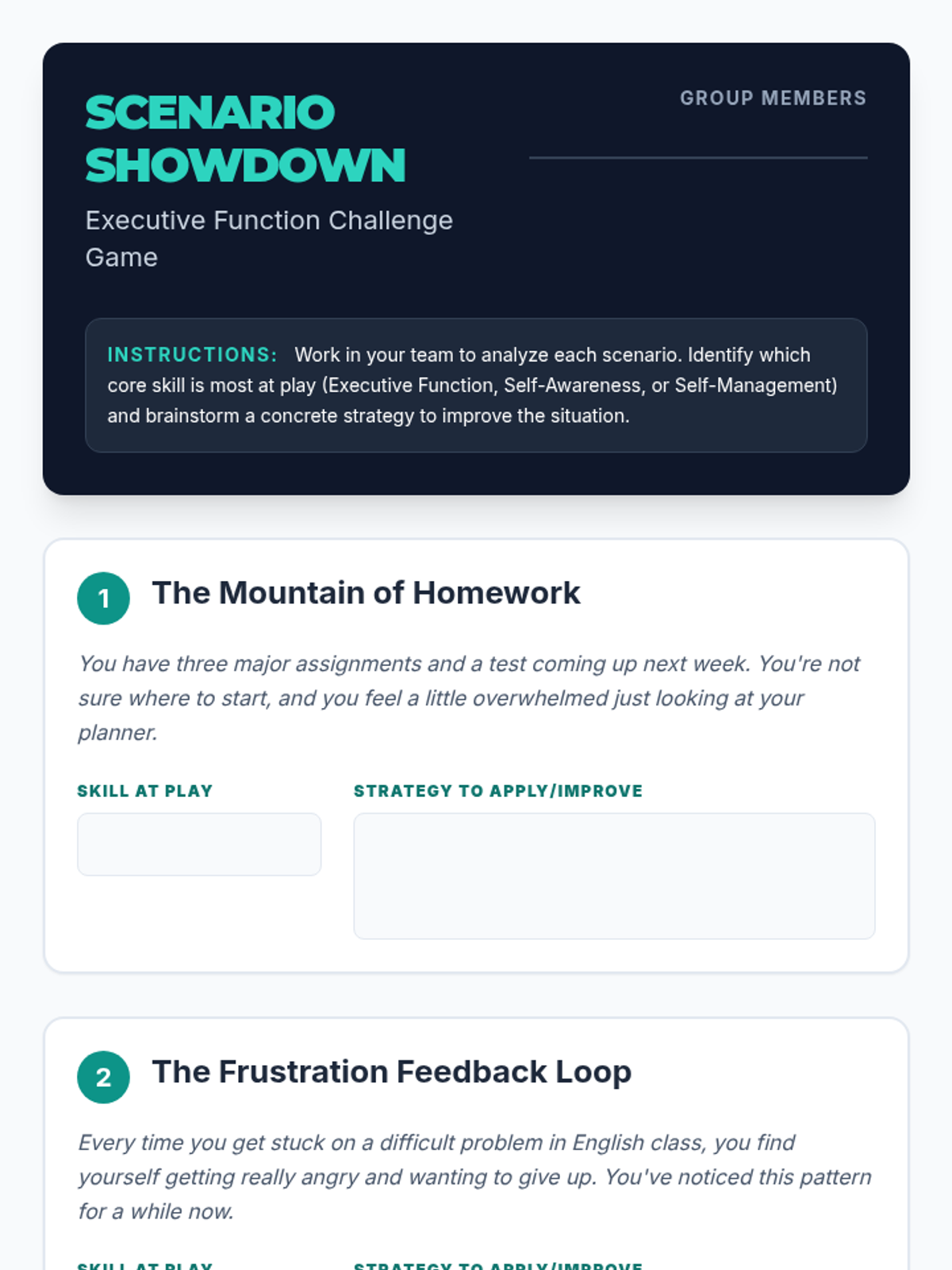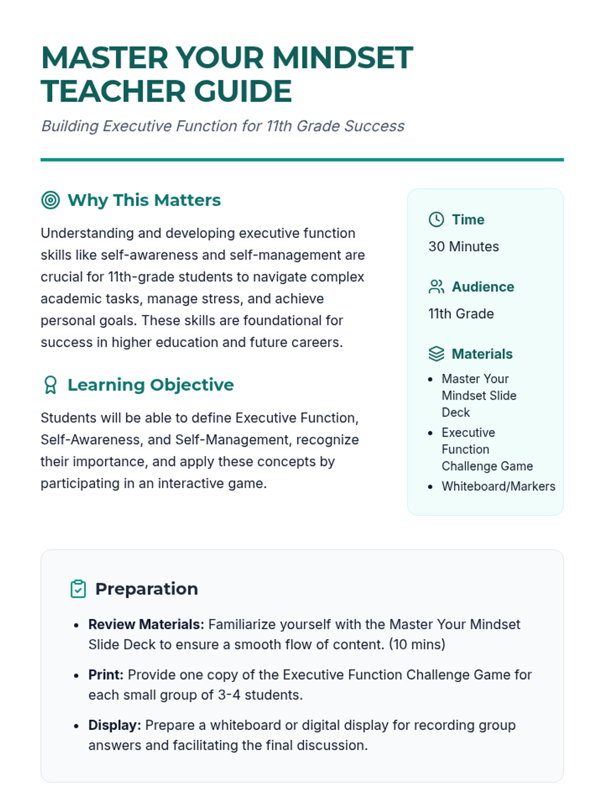 An interactive 30-minute lesson for 11th-grade students focusing on Executive Function, Self-Awareness, and Self-Management through direct instruction and scenario-based problem solving.