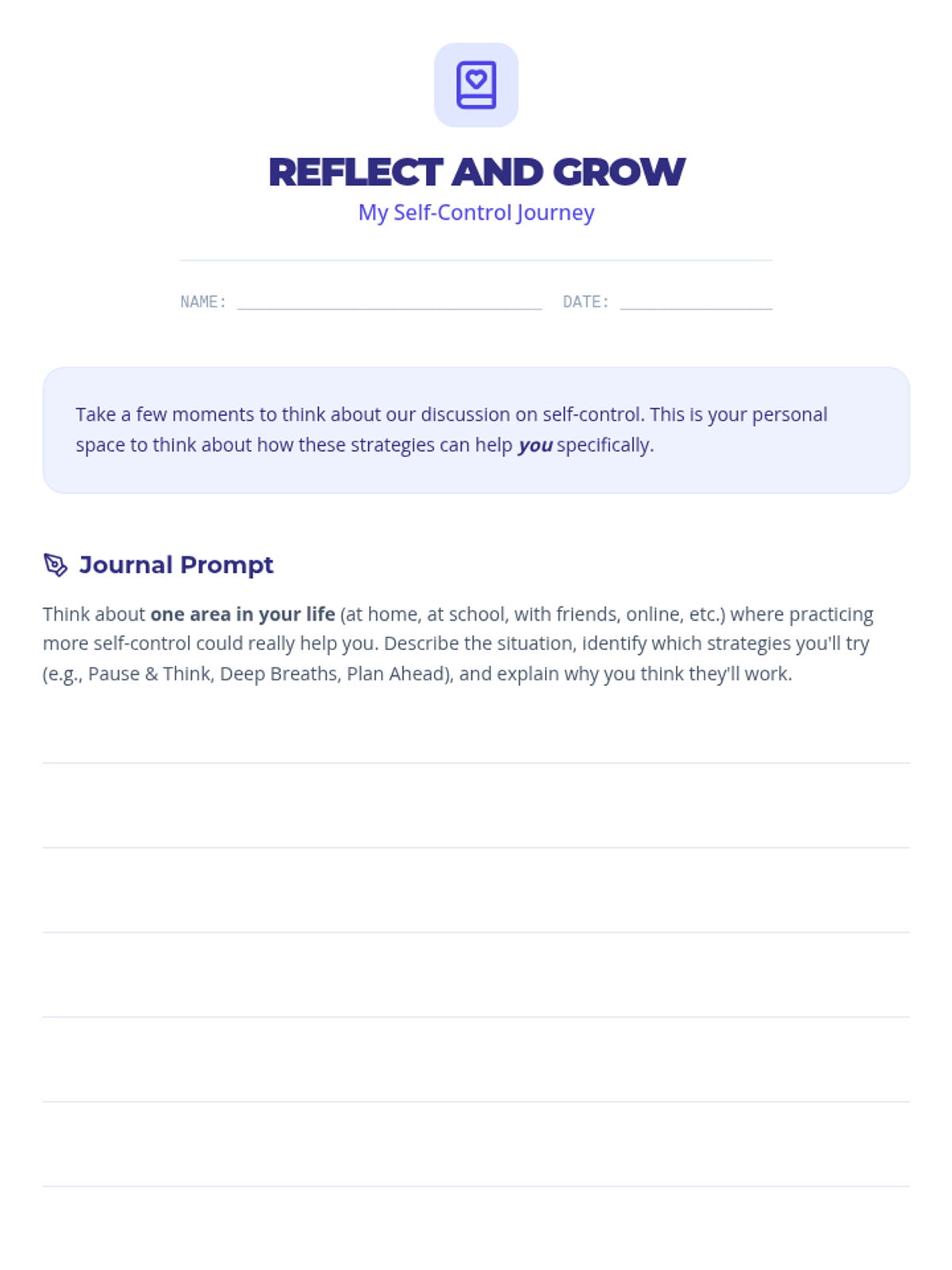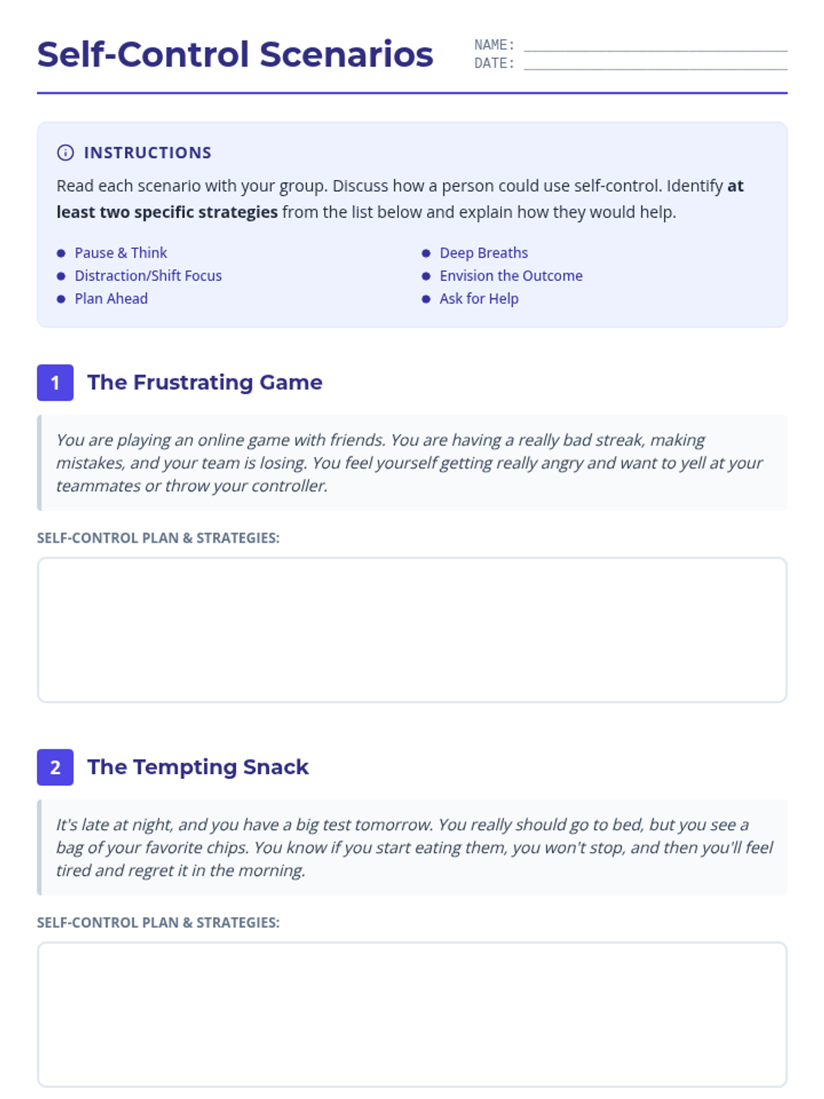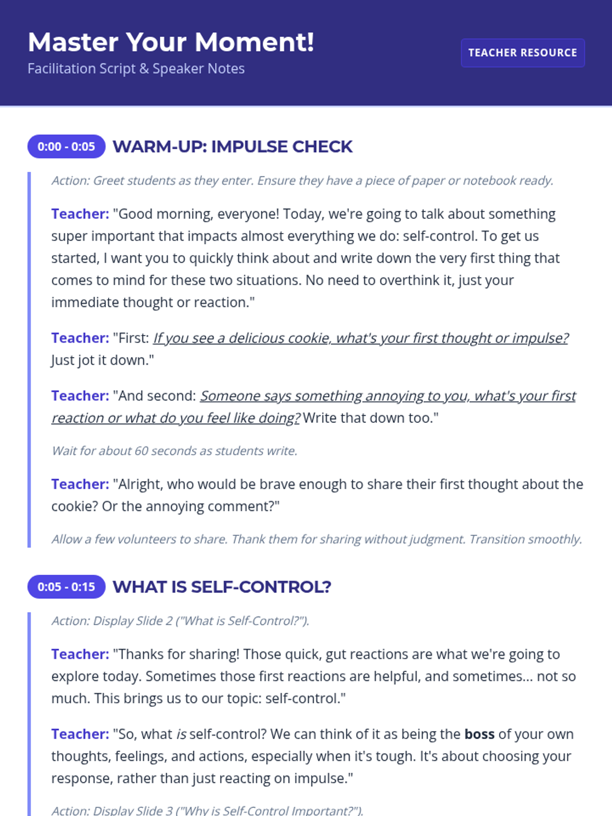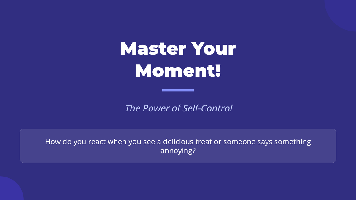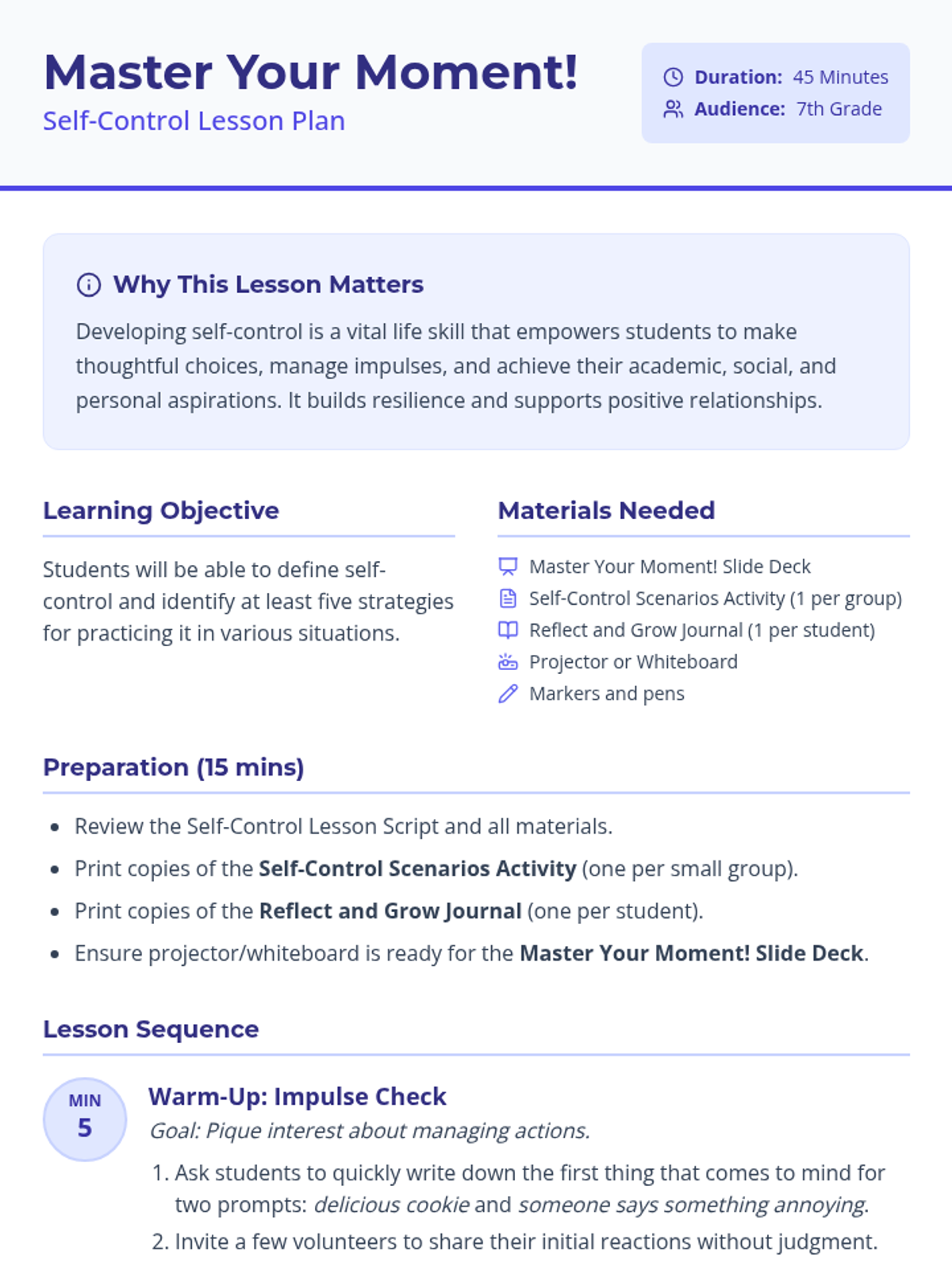 A single-session 45-minute lesson for 7th-grade students on defining and practicing self-control through interactive discussion, group scenarios, and personal reflection.