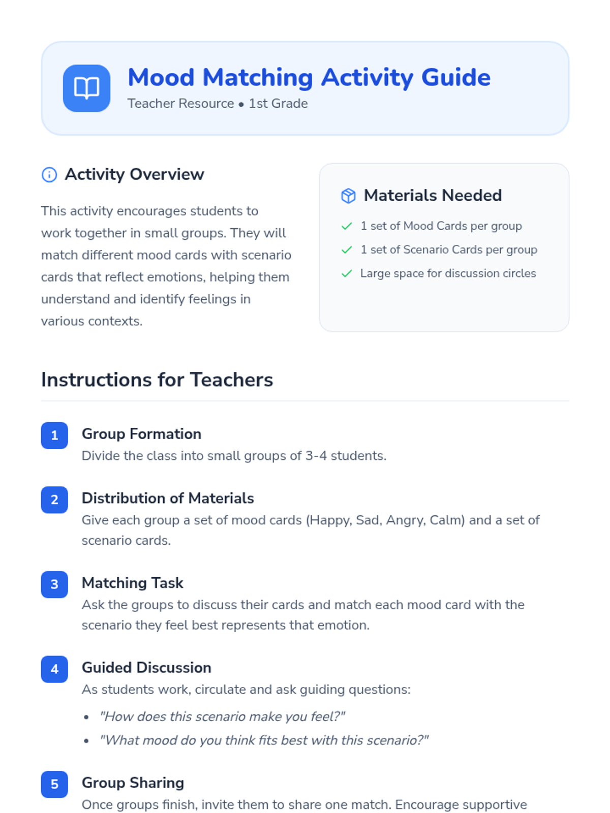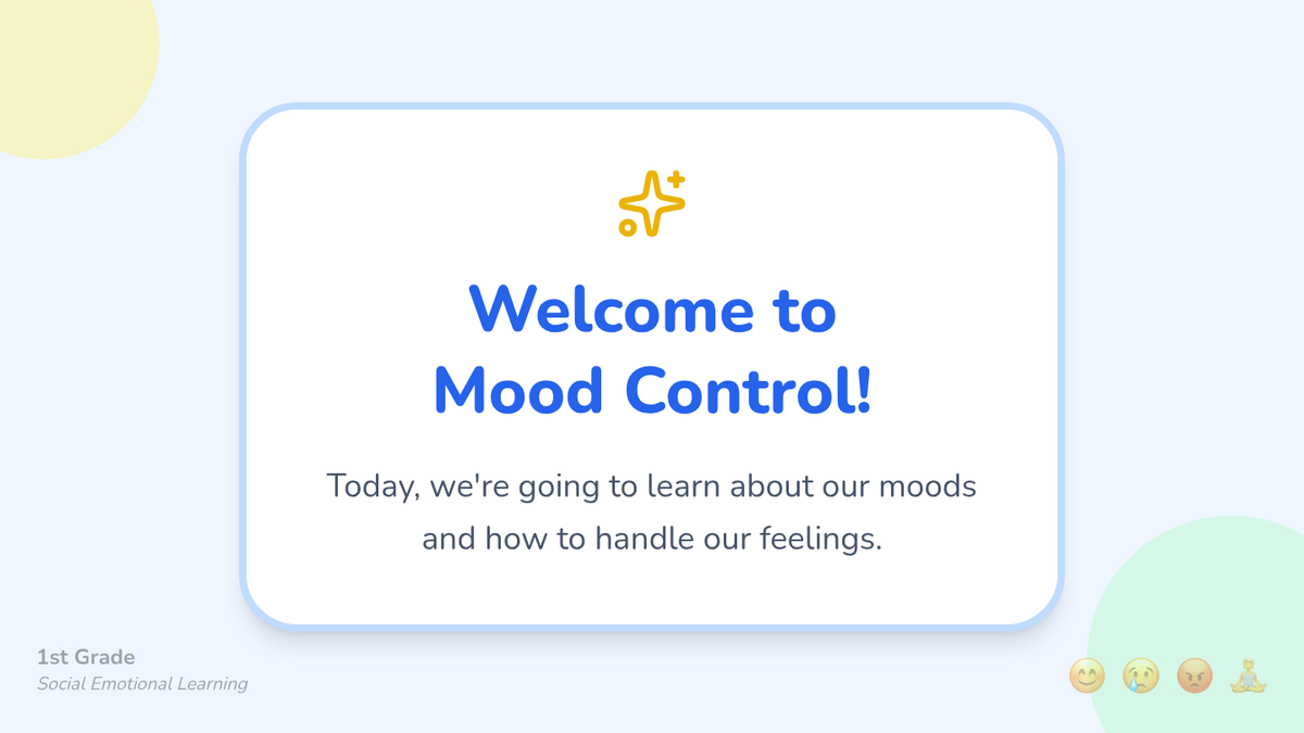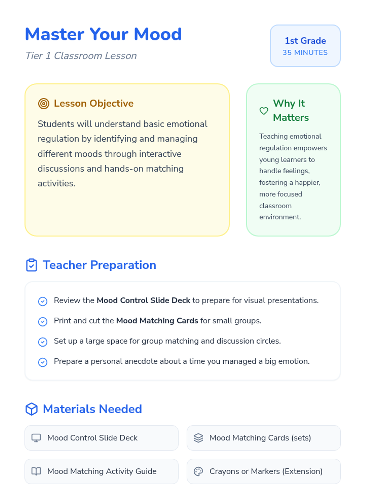 A 35-minute lesson for 1st grade students focusing on identifying emotions and learning simple regulation strategies like deep breathing. students will engage with a visual slide deck and a hands-on matching activity.