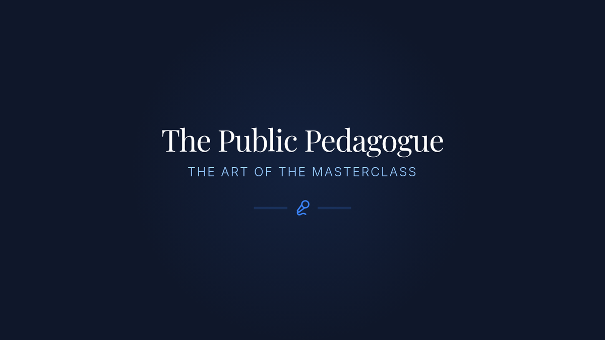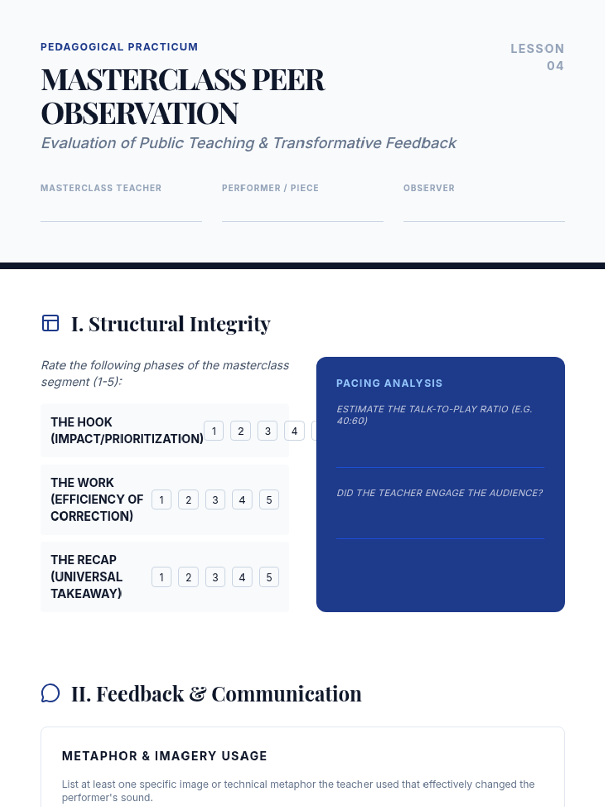 Students learn the art of public teaching, focusing on concise, transformative feedback and managing audience engagement in a masterclass setting.