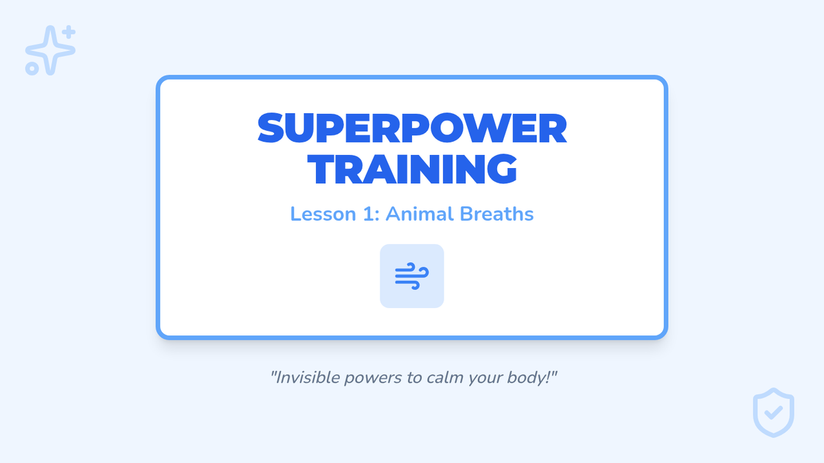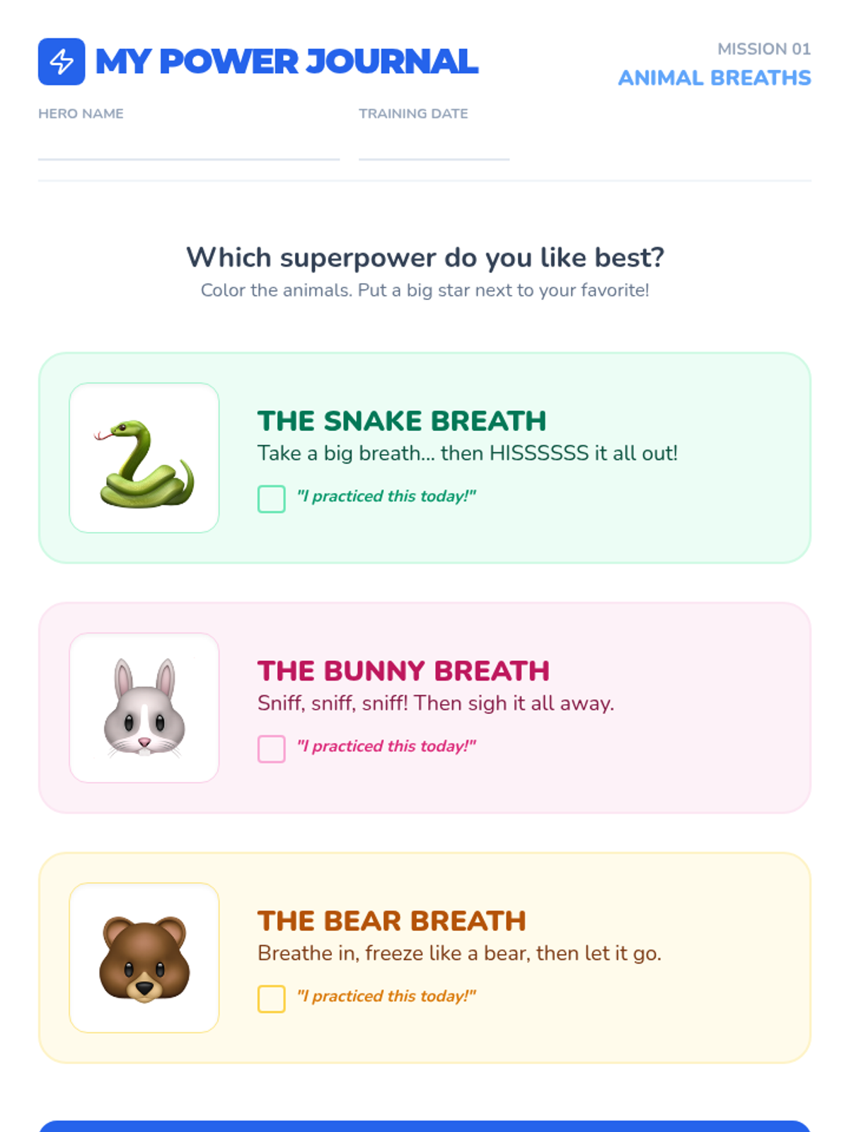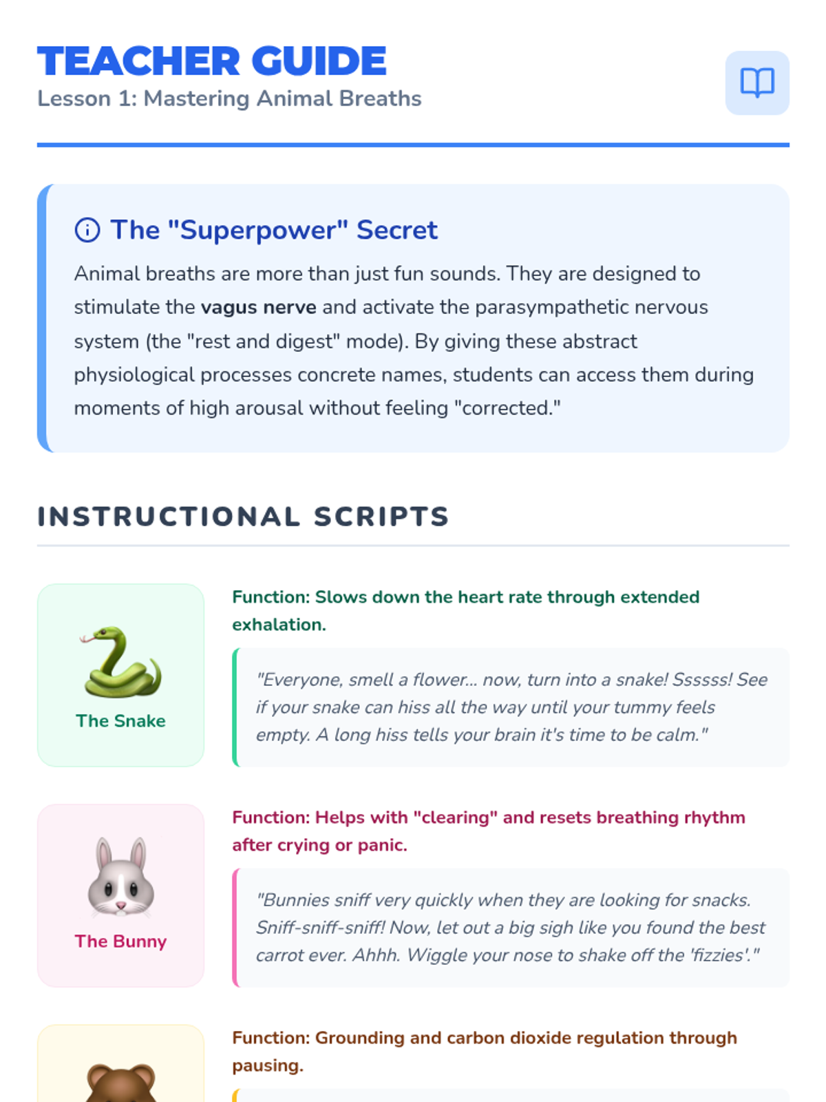 Students learn three animal-themed breathing techniques (Snake, Bunny, Bear) to connect abstract breath control to concrete, fun avatars.