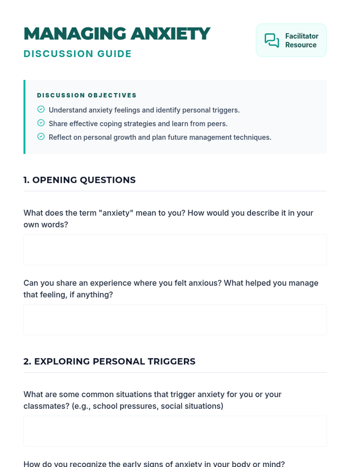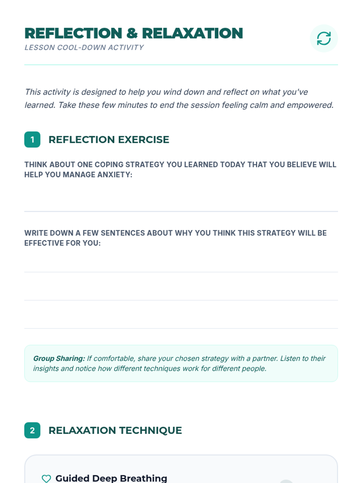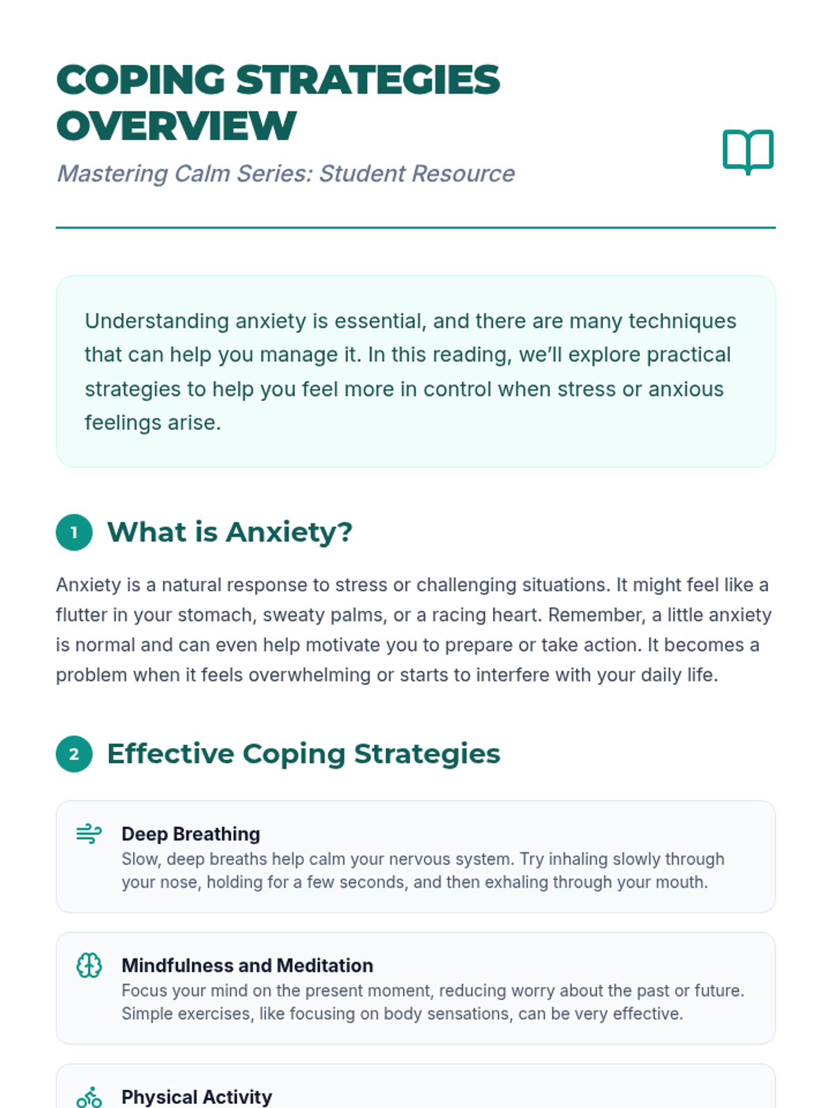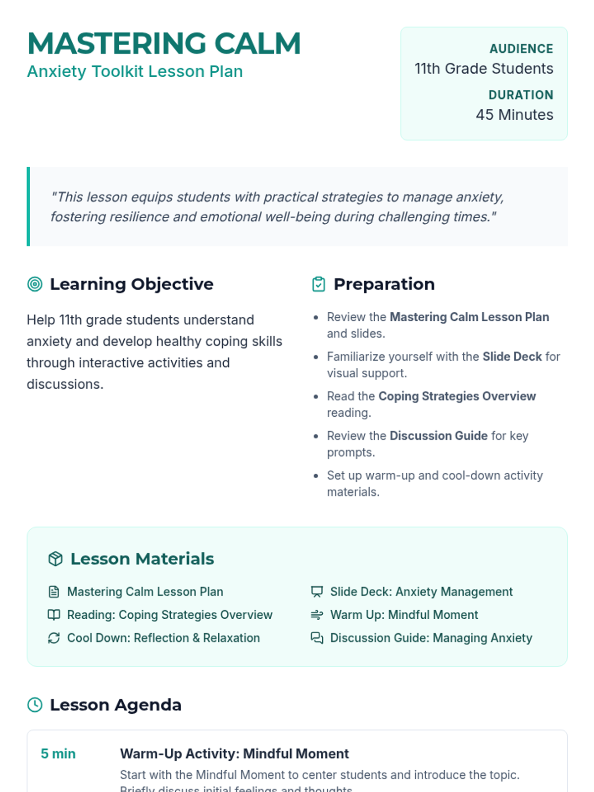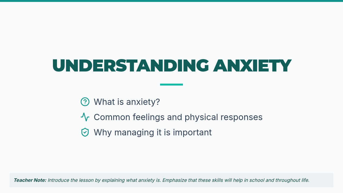 A 45-minute lesson for 11th-grade students focused on understanding anxiety, identifying triggers, and developing a practical toolkit of healthy coping strategies for school and the workplace.
