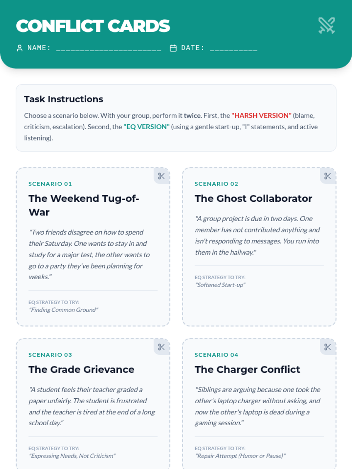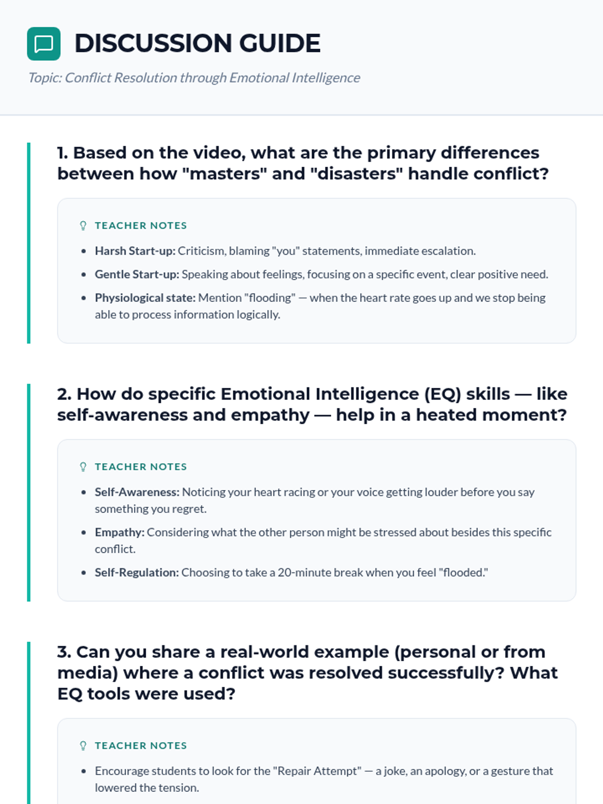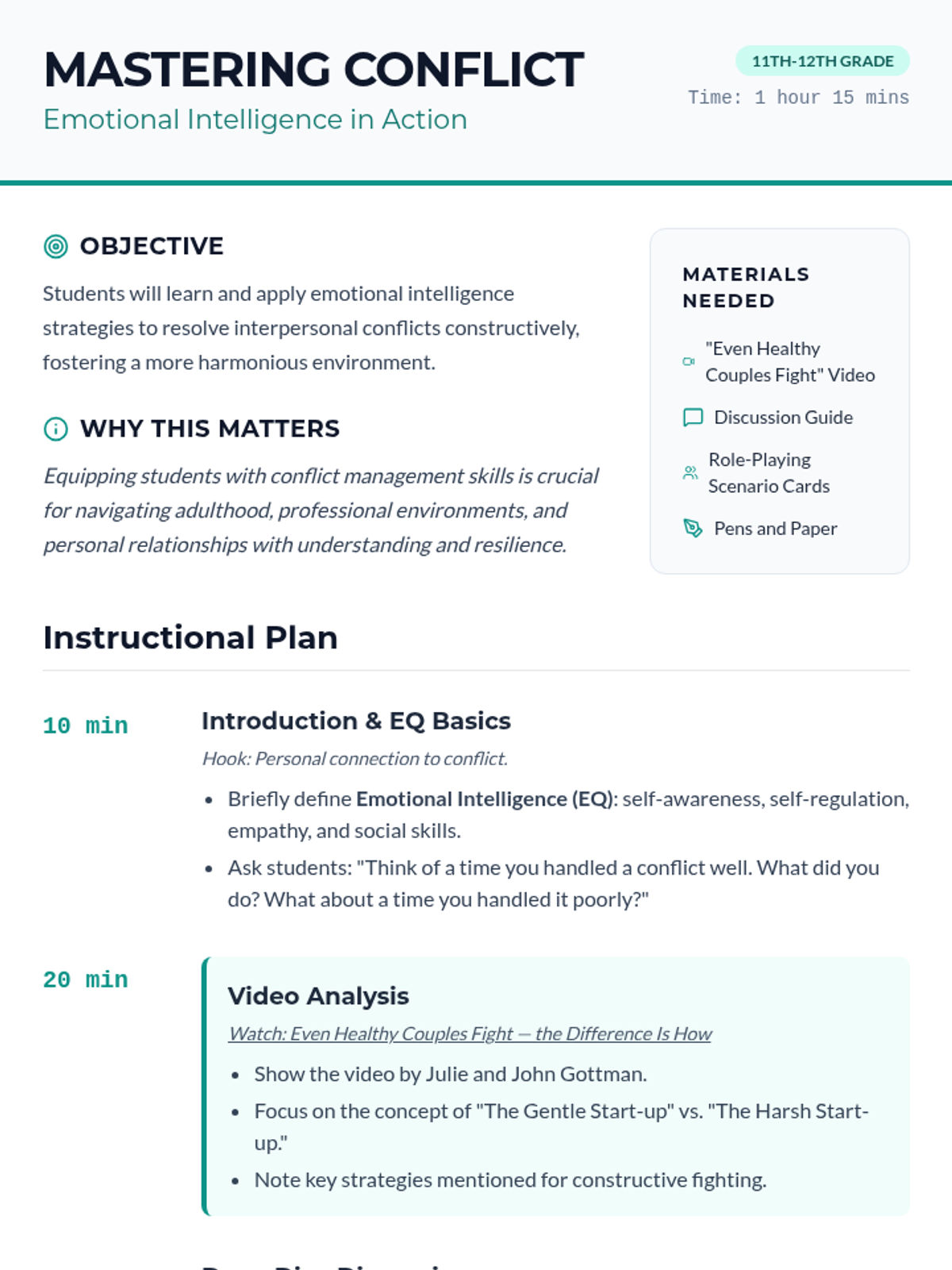 A comprehensive lesson for 11th and 12th graders on using emotional intelligence to resolve conflicts effectively, featuring video analysis and role-playing exercises.