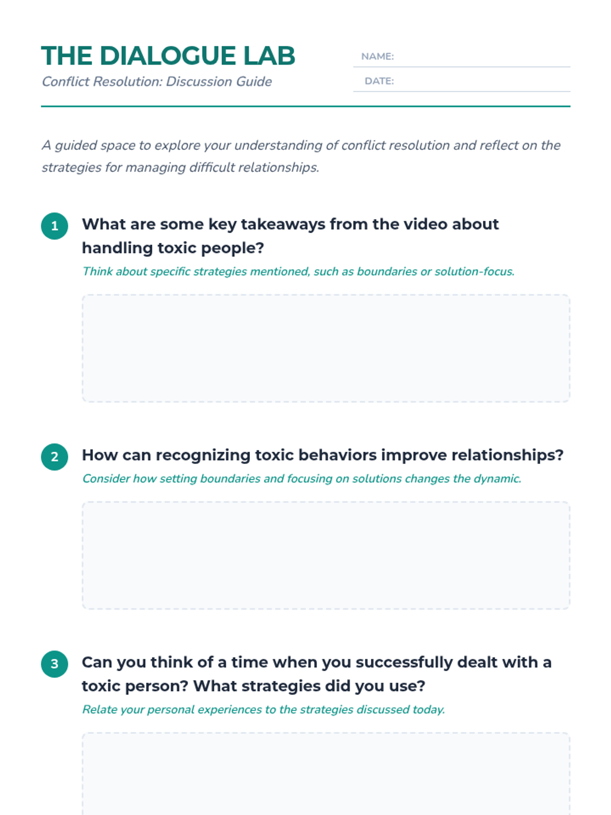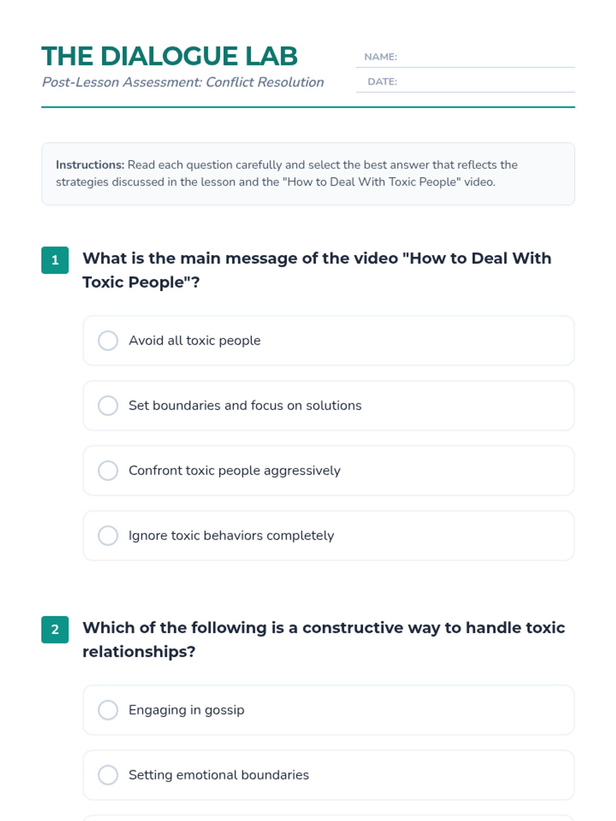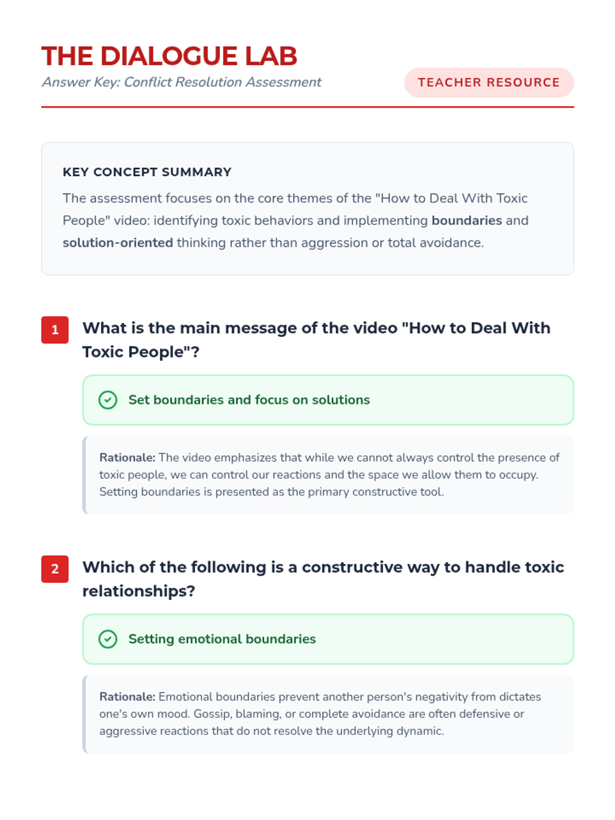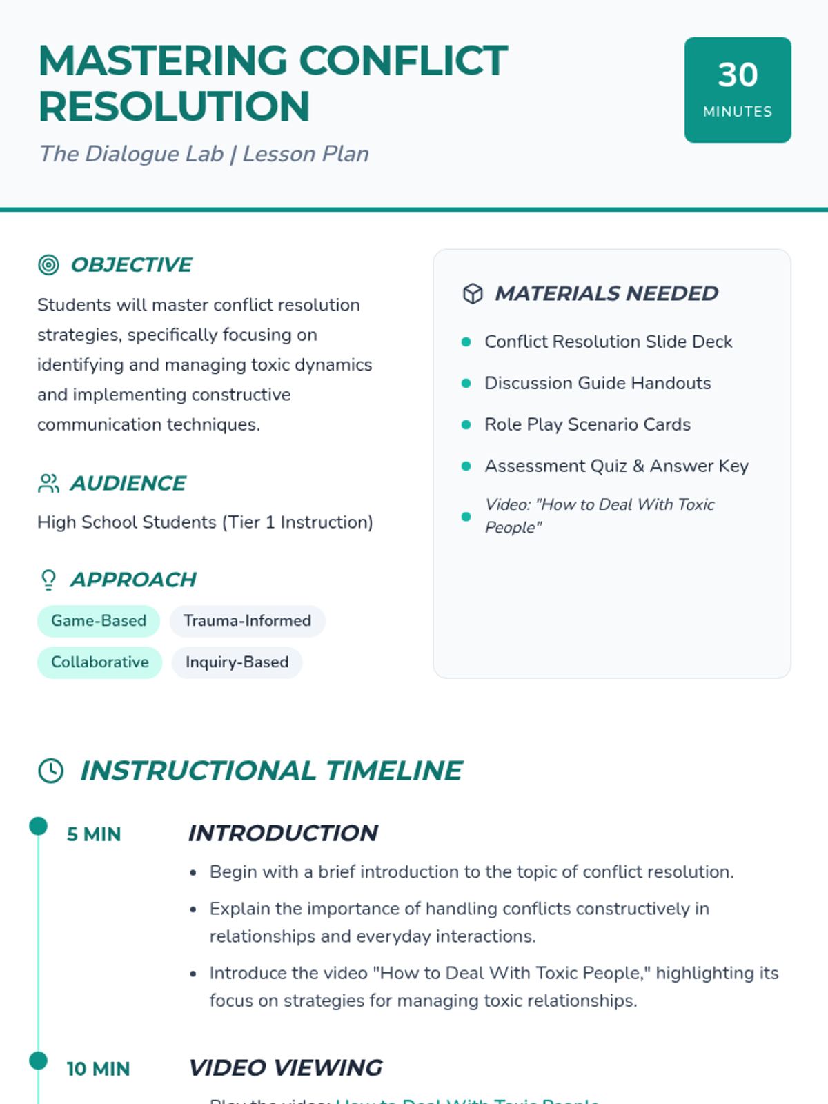 A comprehensive 30-minute lesson designed for high school students to master conflict resolution. Students will explore strategies for managing toxic dynamics, participate in role-playing activities, and develop practical communication skills for fostering healthy relationships.