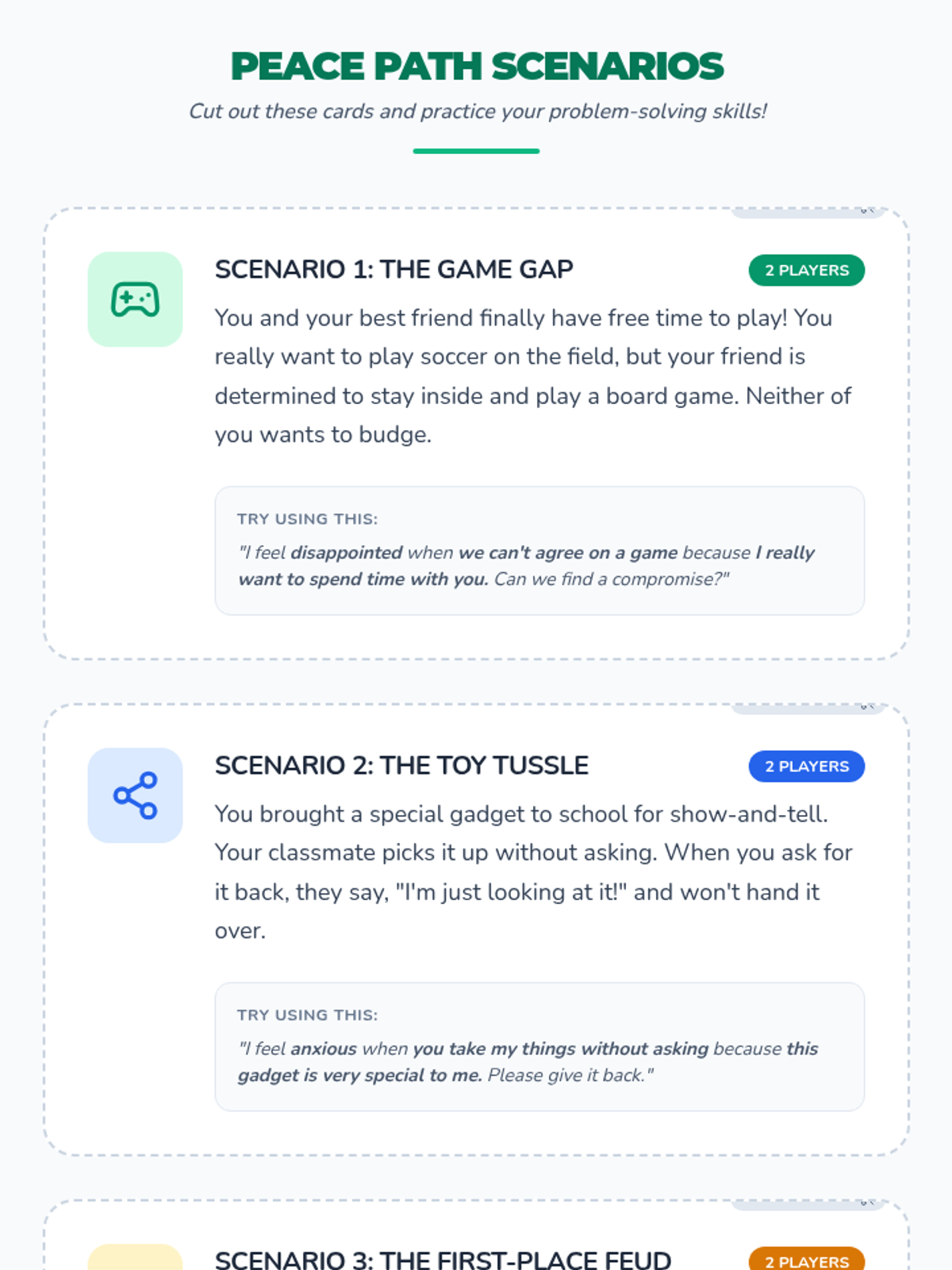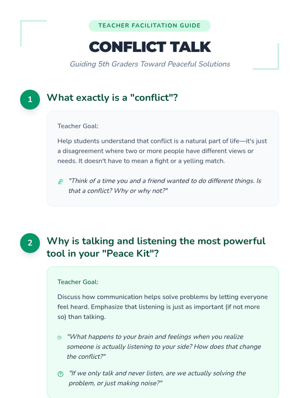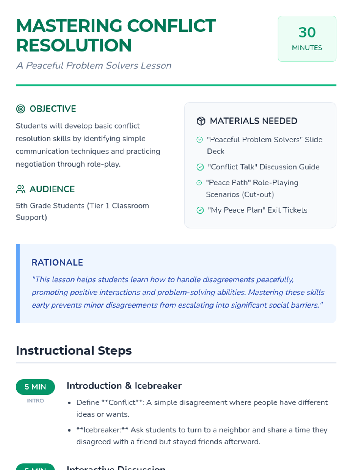 This lesson introduces 5th-grade students to basic conflict resolution skills through simple communication and negotiation techniques, featuring a hands-on role-playing activity.