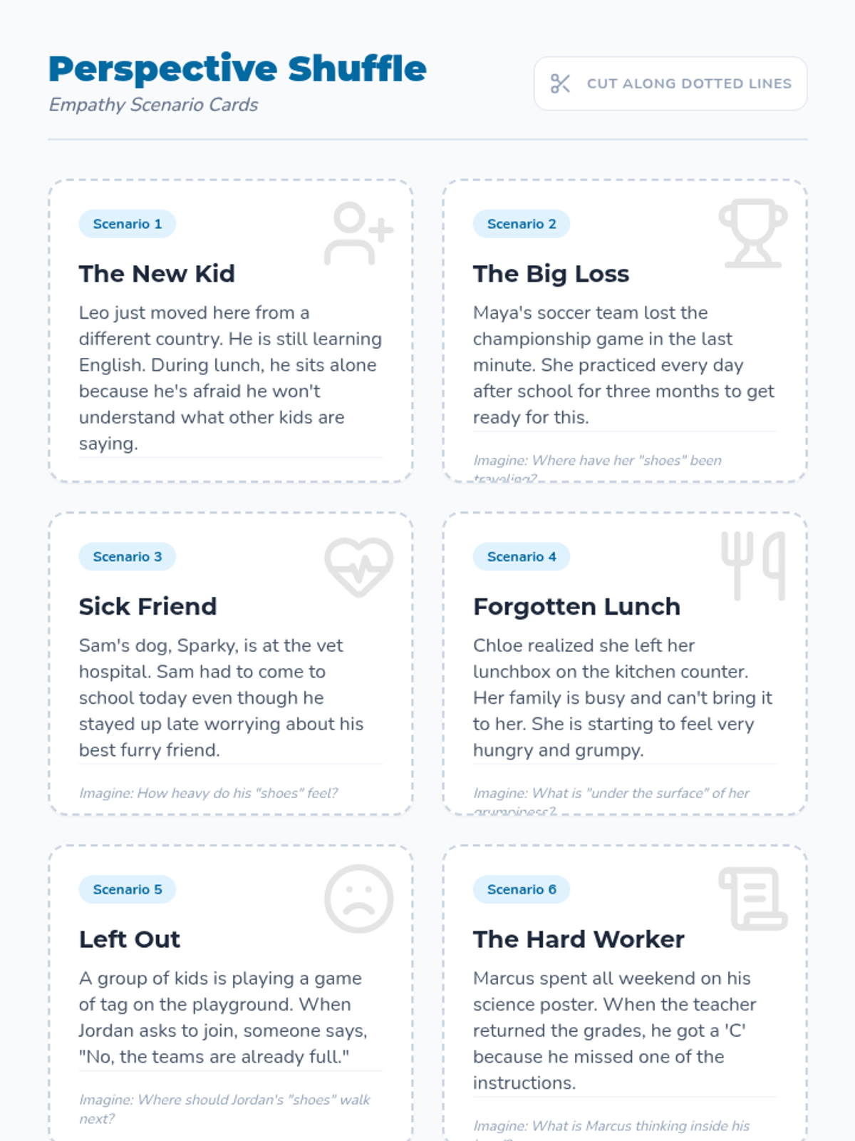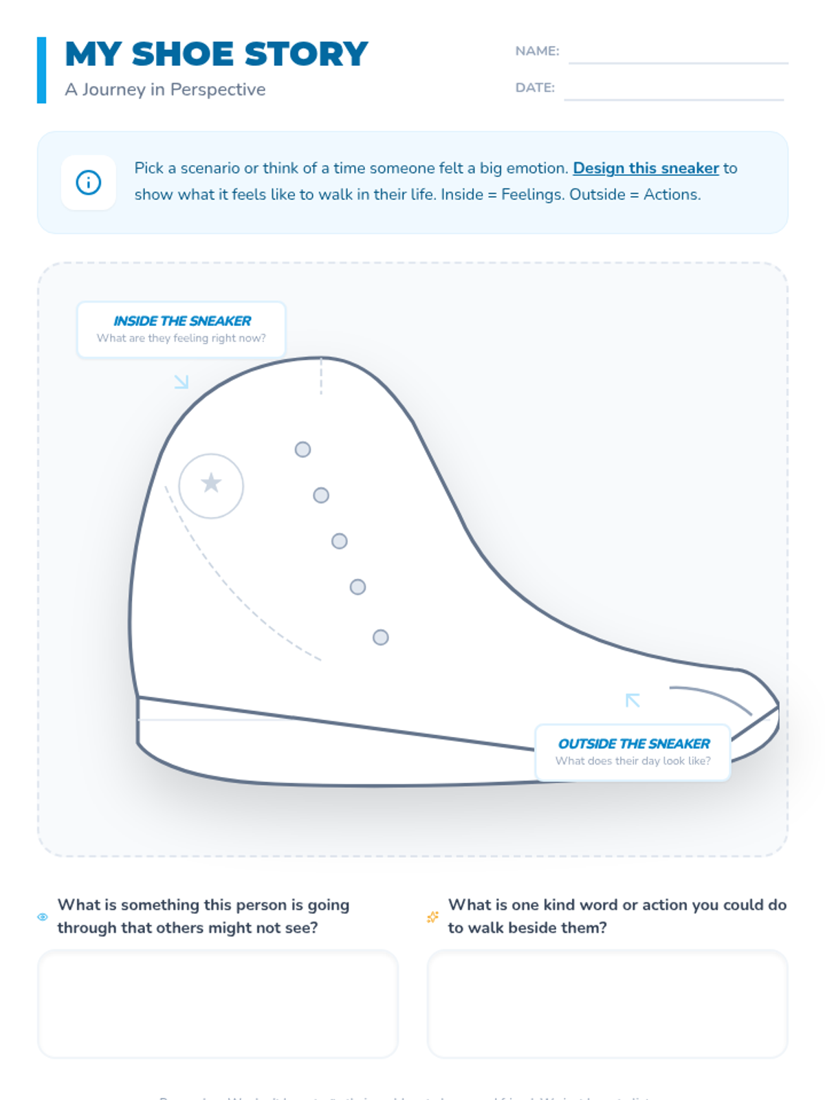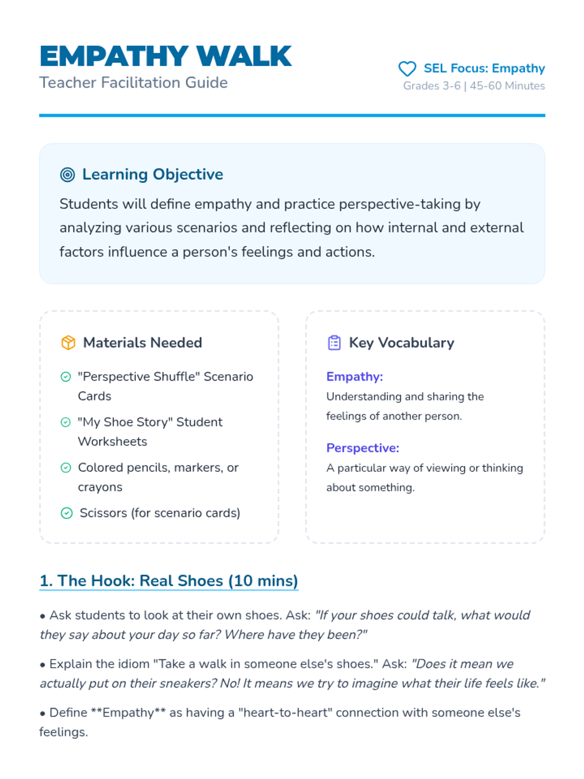 A Social Emotional Learning lesson focused on empathy and perspective-taking. Students explore different life scenarios and reflect on how others might feel by 'walking in their shoes' through discussion and creative expression.