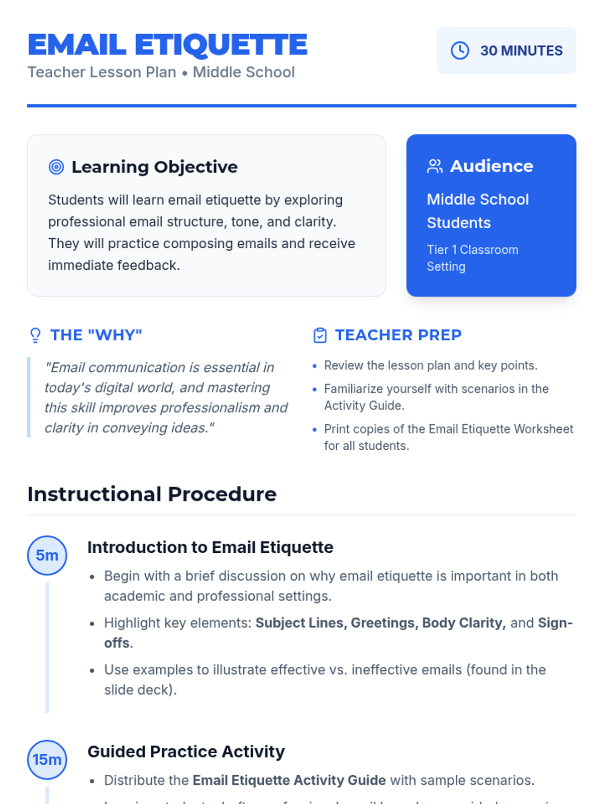 A comprehensive 30-minute lesson teaching middle schoolers the essentials of professional email communication, including structure, tone, and etiquette.