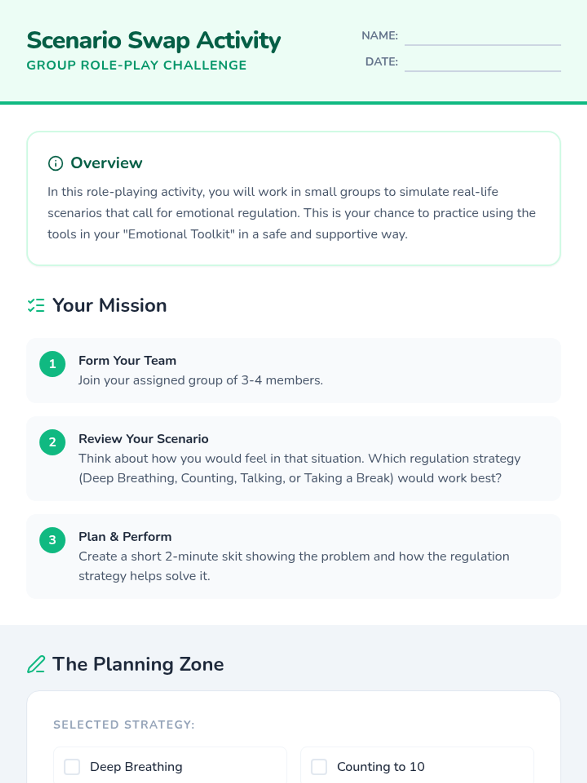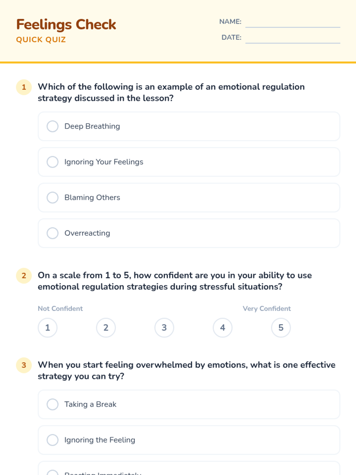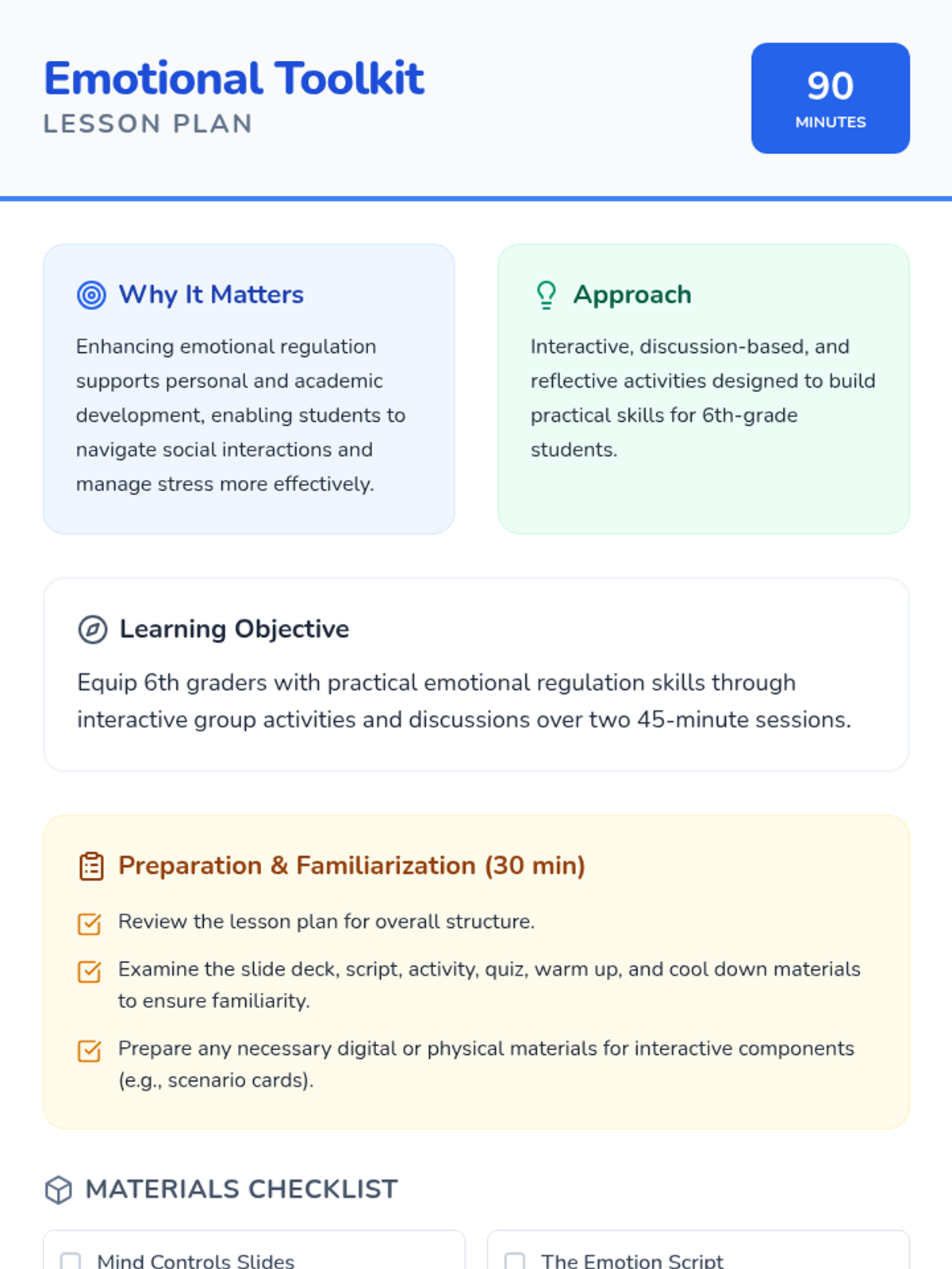 A two-session lesson for 6th graders to develop emotional regulation skills through interactive scenarios, reflection, and practical strategies. Students will learn to identify emotions and apply calming techniques like deep breathing and counting to ten.