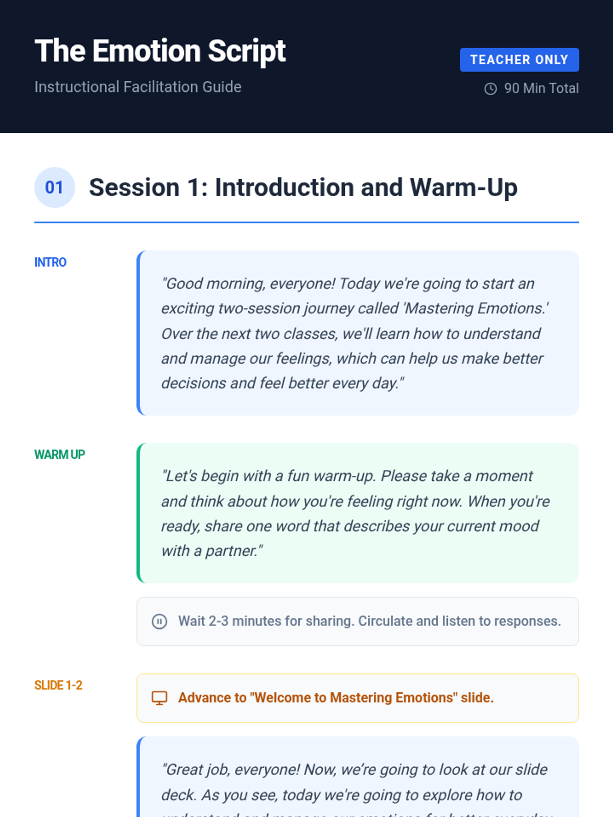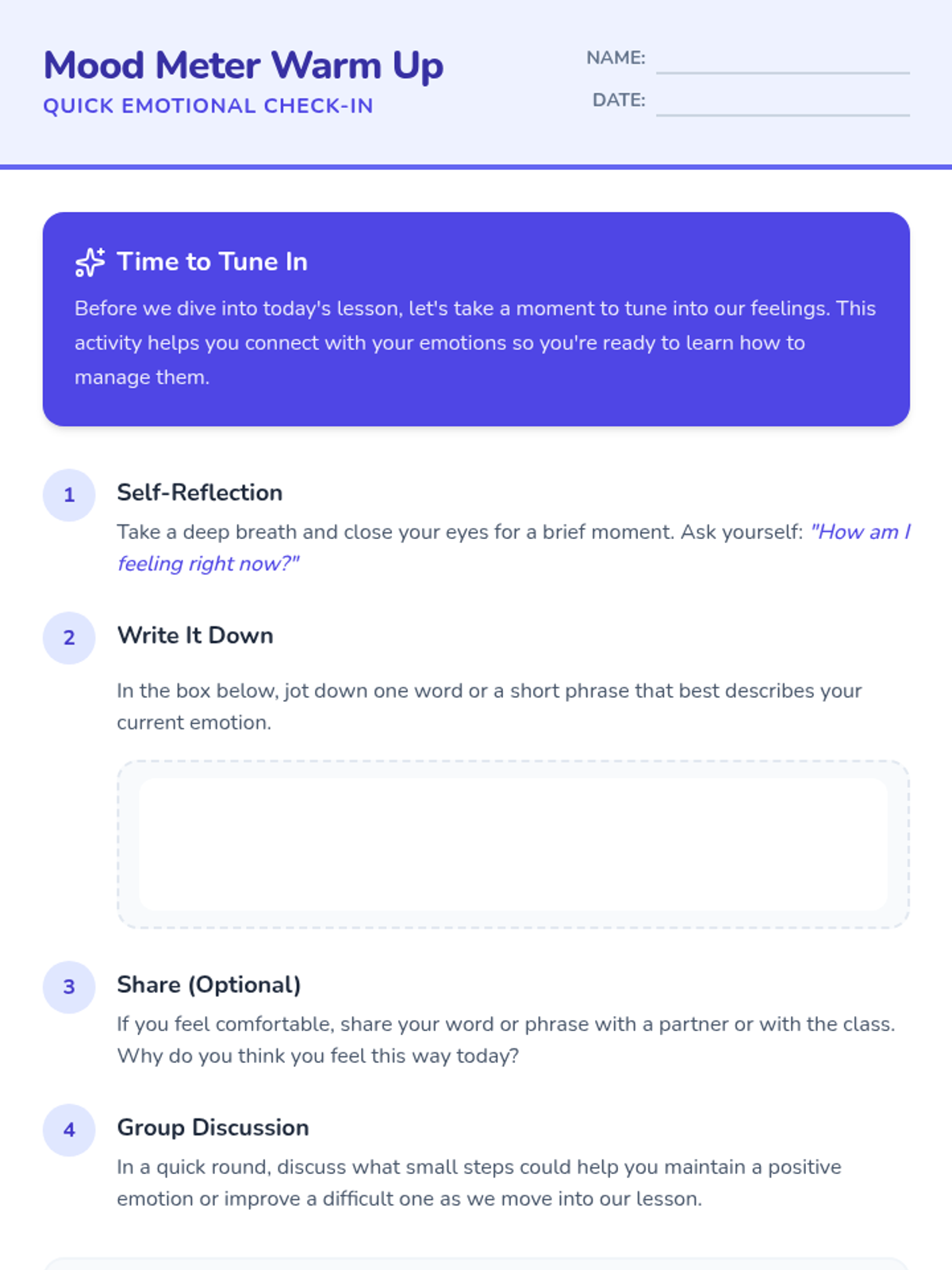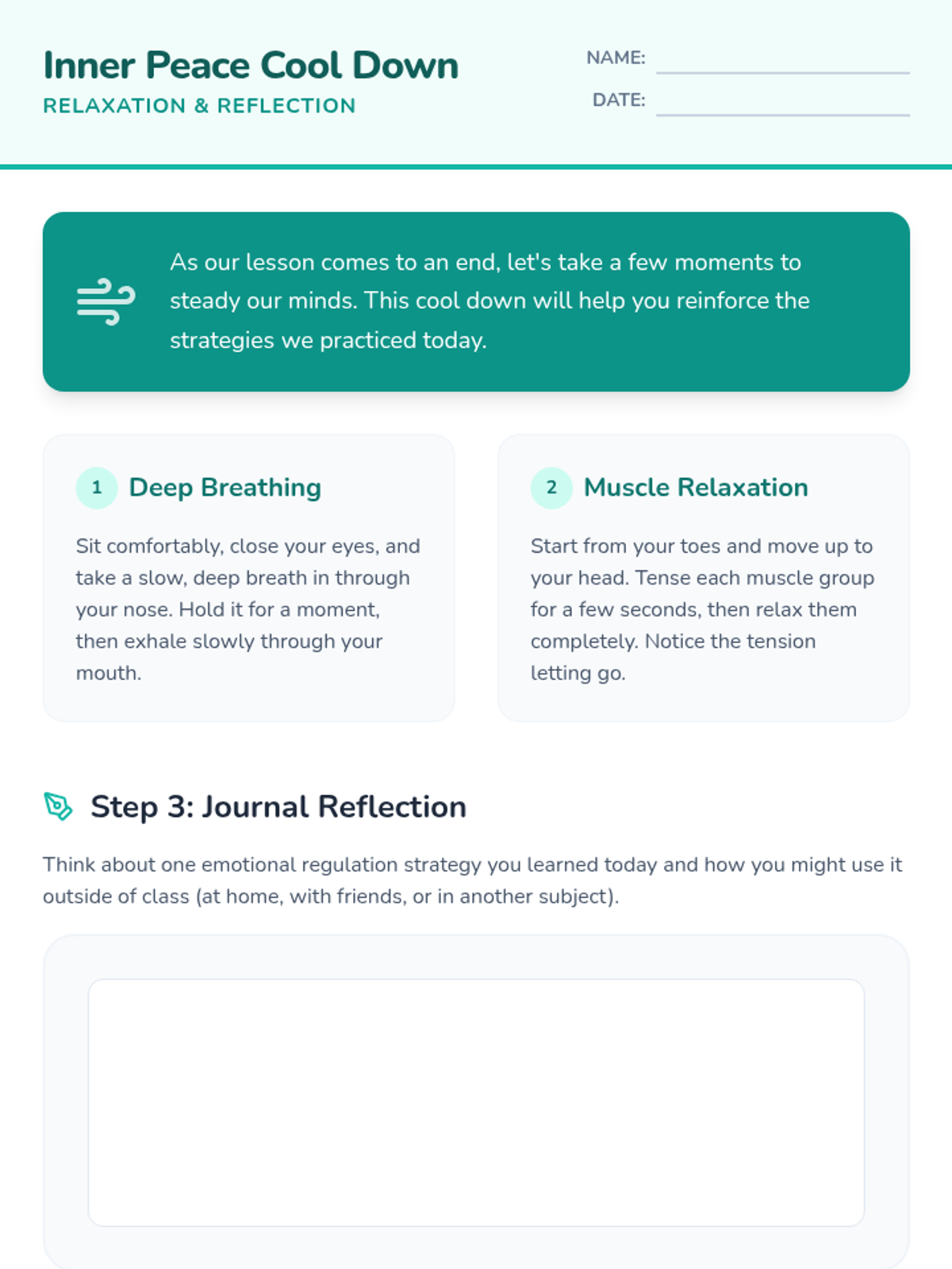 A two-session lesson for 6th graders to develop emotional regulation skills through interactive scenarios, reflection, and practical strategies. Students will learn to identify emotions and apply calming techniques like deep breathing and counting to ten.
