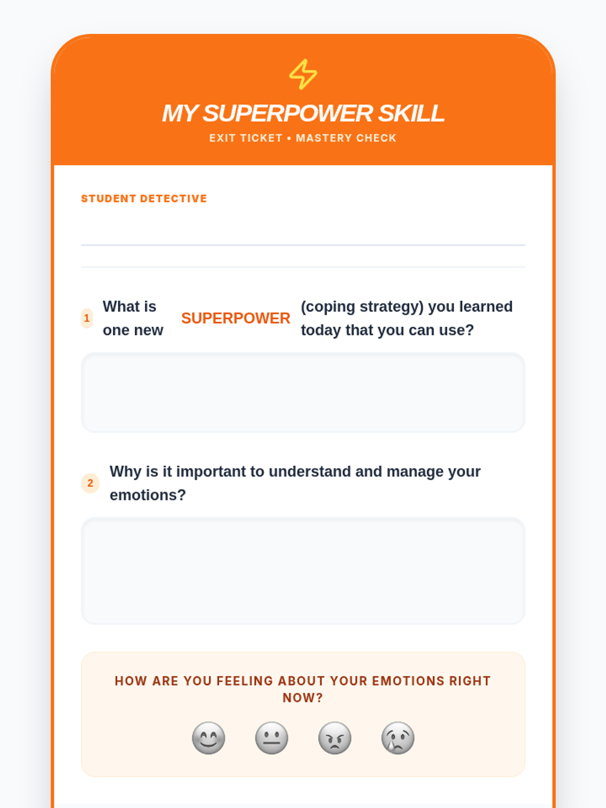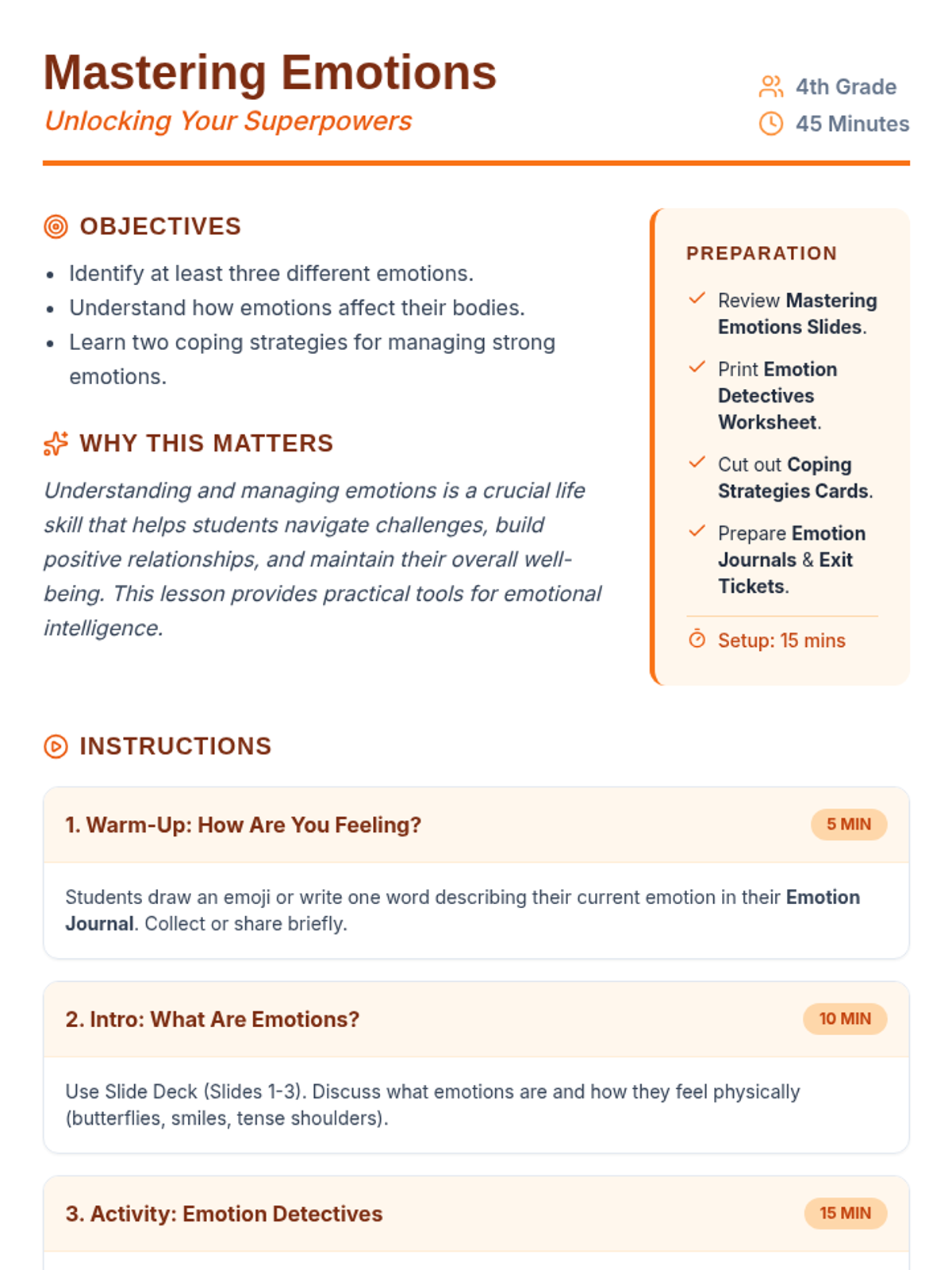 A lesson designed for elementary students to help them identify, understand, and manage their emotions using healthy coping strategies.