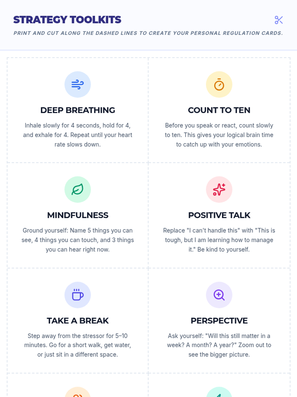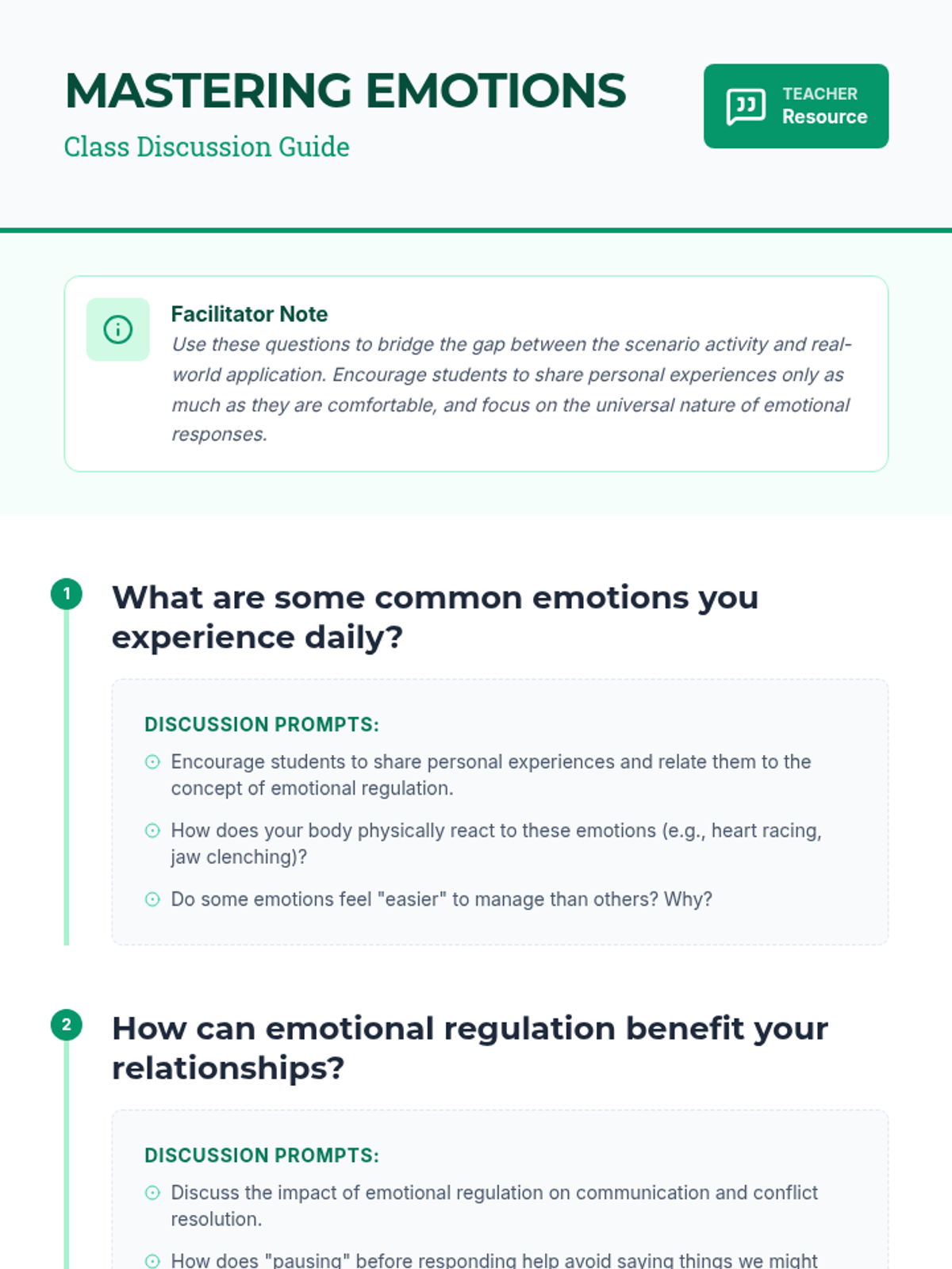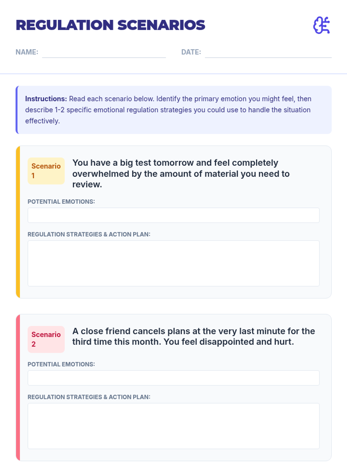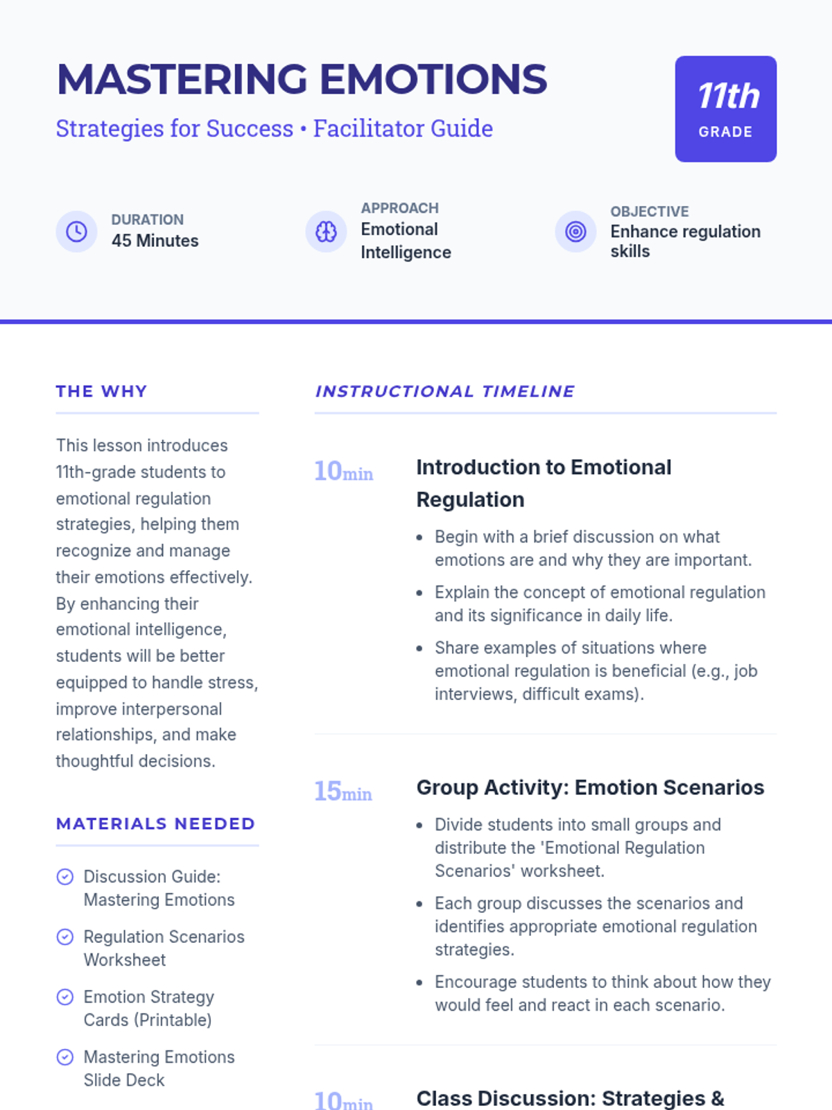 A comprehensive Social-Emotional Learning lesson for 11th graders focusing on identifying and managing emotions through practical regulation strategies. Students explore scenarios, engage in discussions, and build a personal toolkit for emotional intelligence.