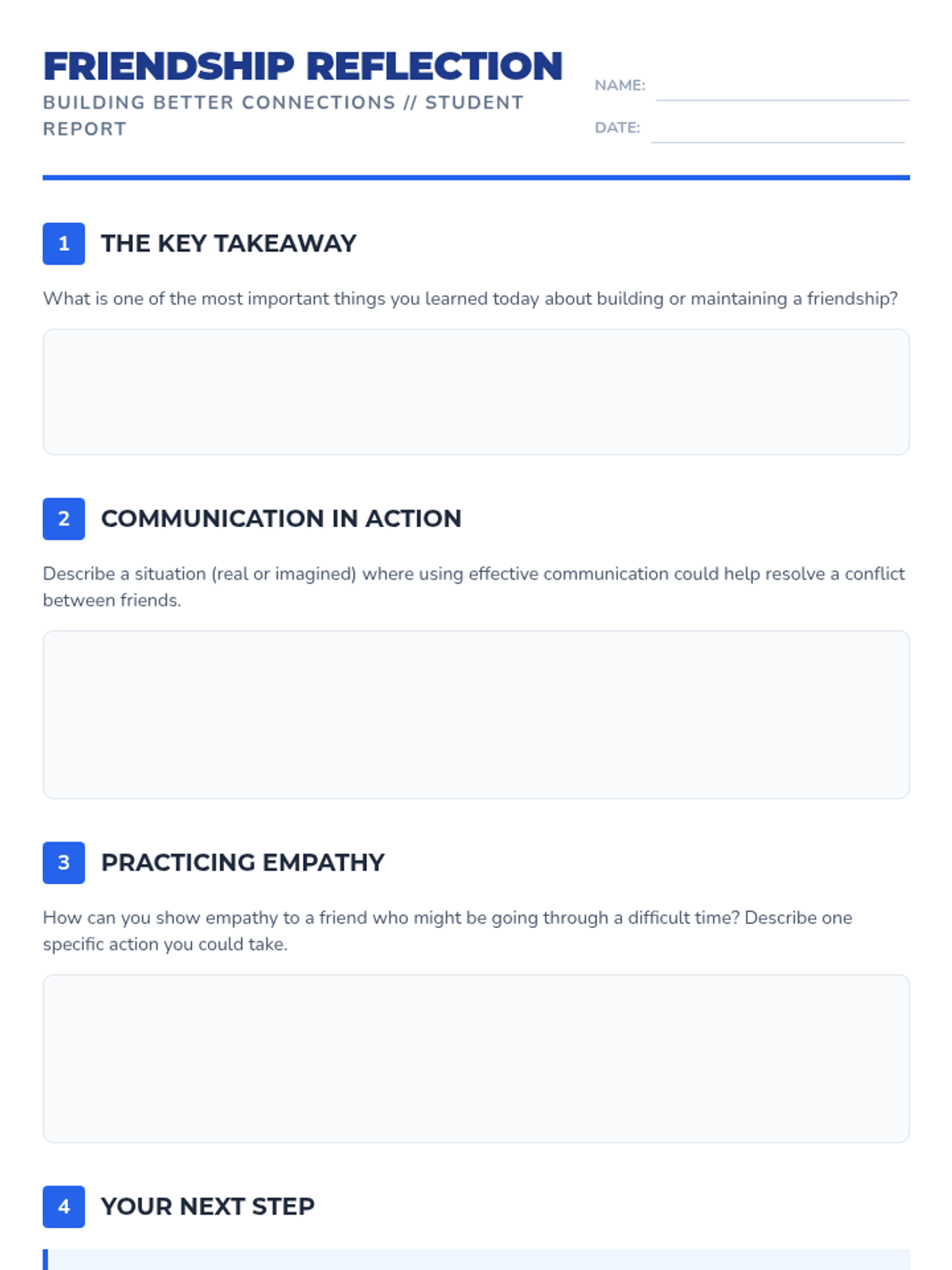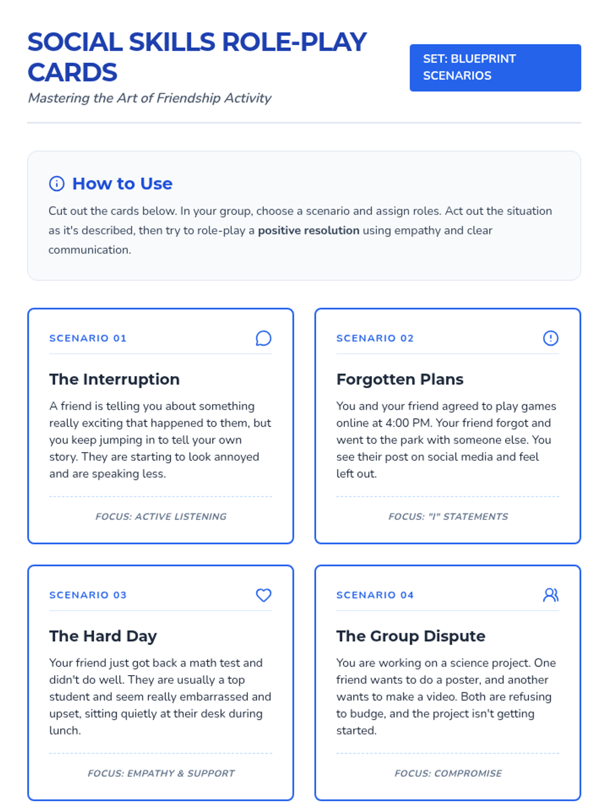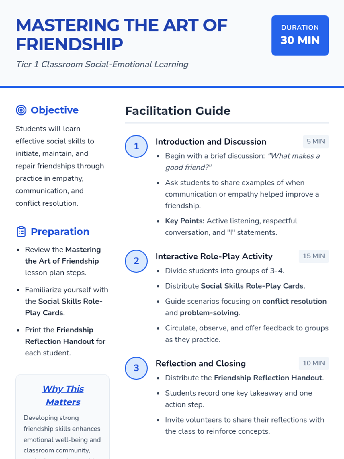 A 30-minute lesson for 7th graders focusing on essential social skills: communication, empathy, and conflict resolution to build and maintain strong friendships.