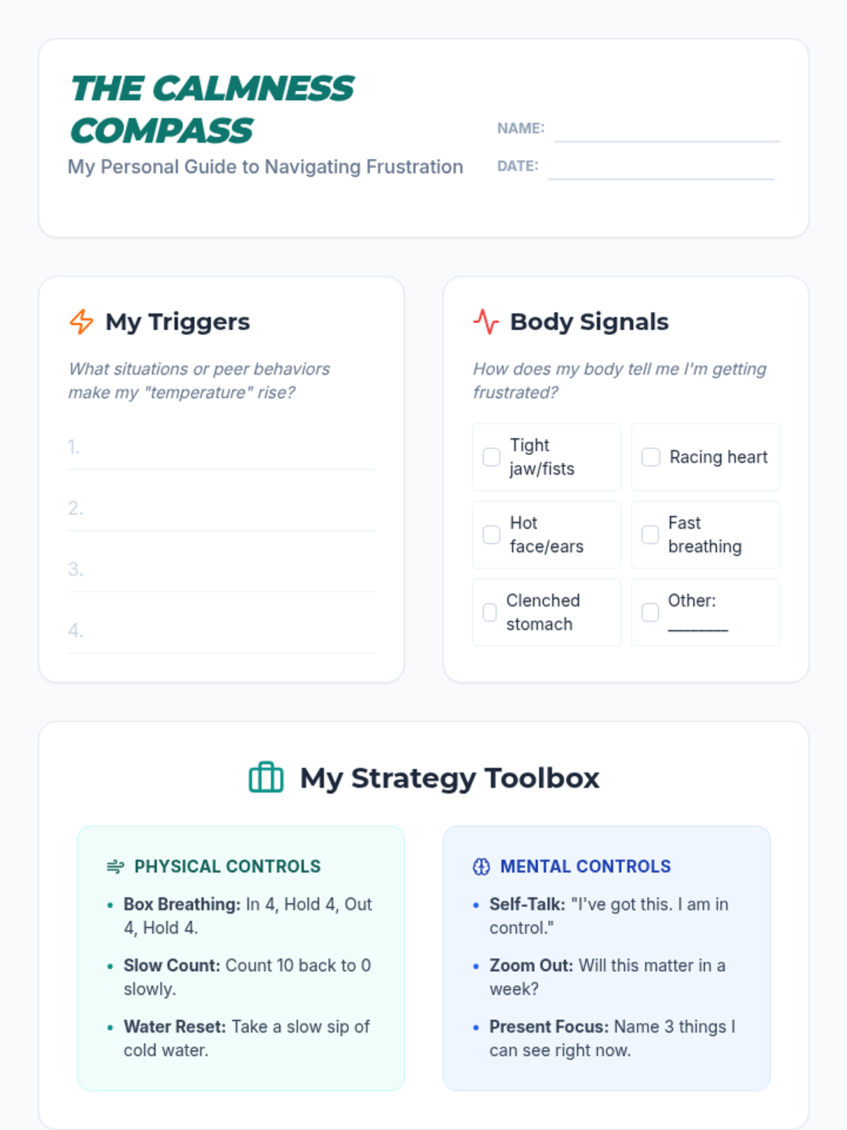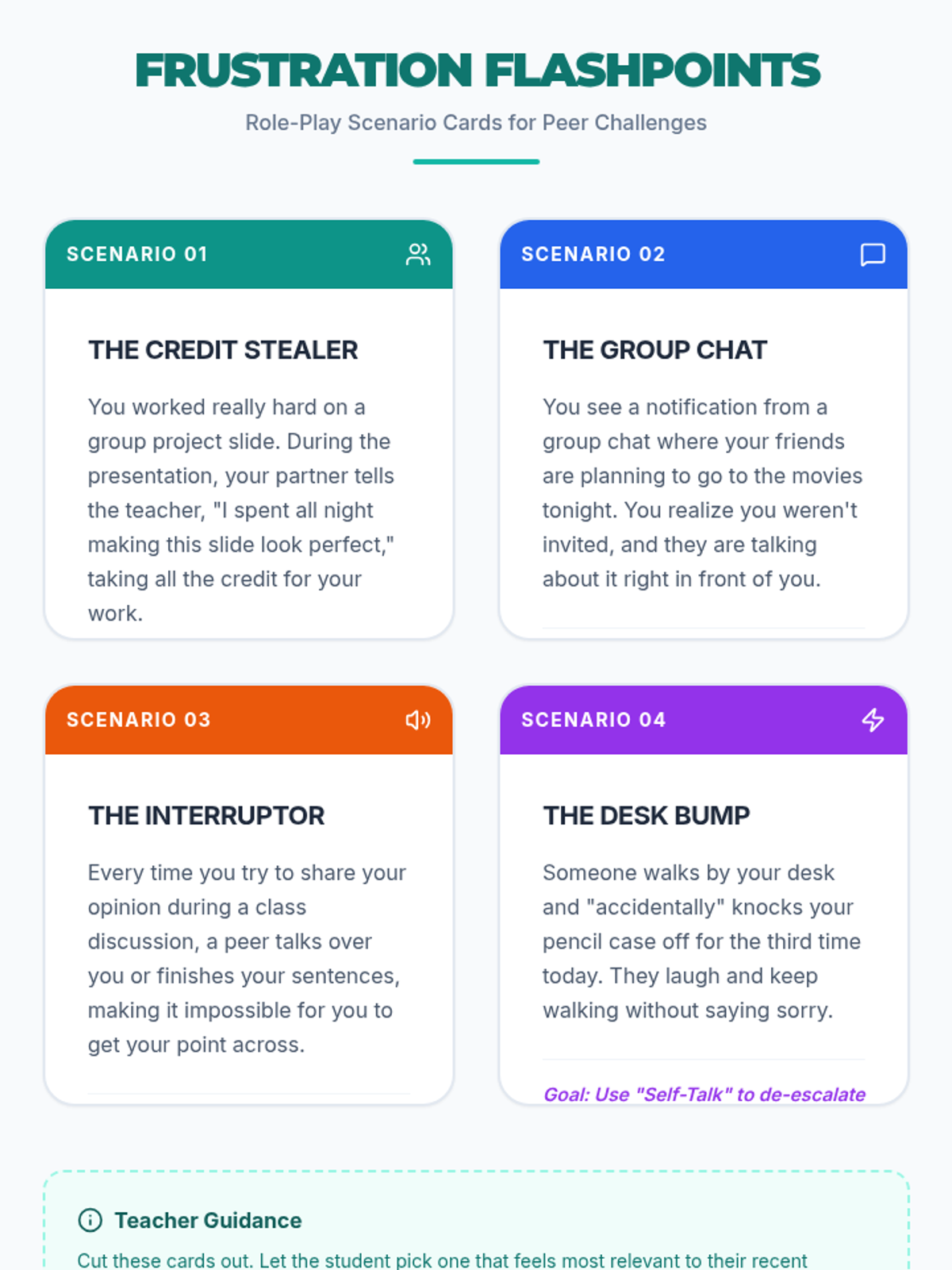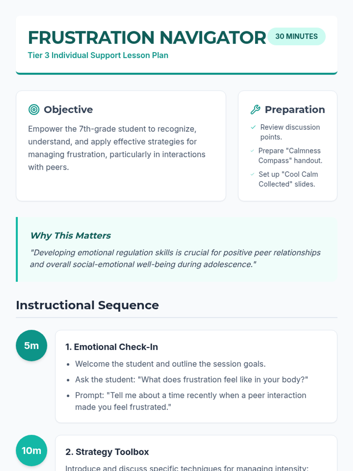 A Tier 3 individual support lesson for 7th graders focusing on identifying frustration triggers and applying emotional regulation strategies in peer interactions.