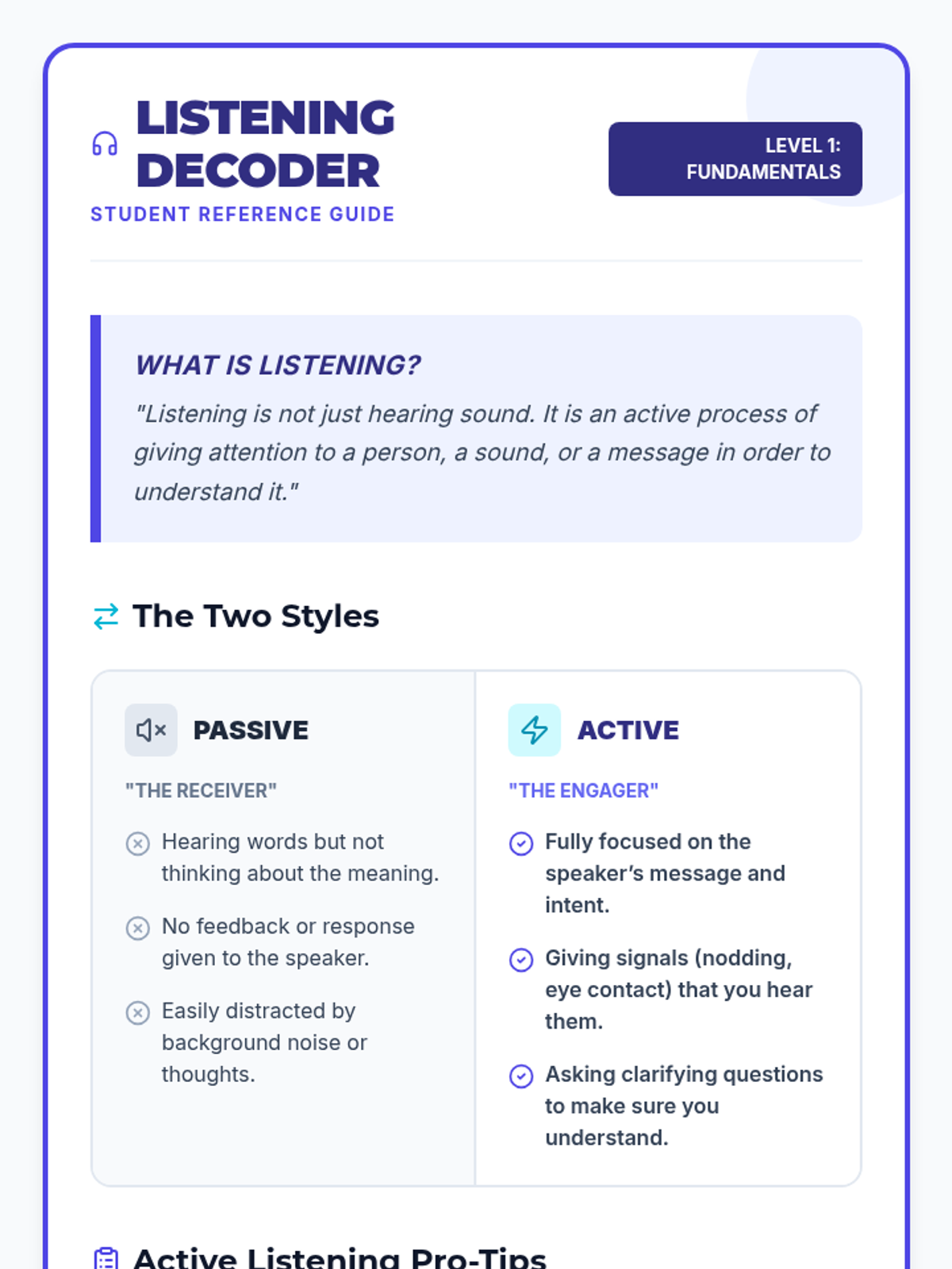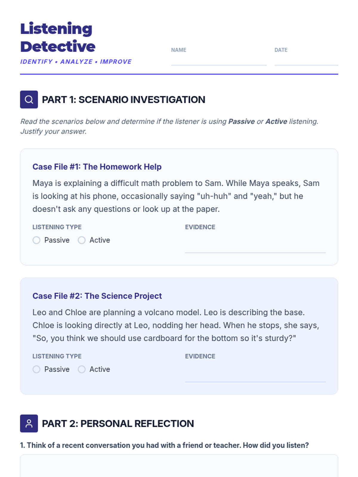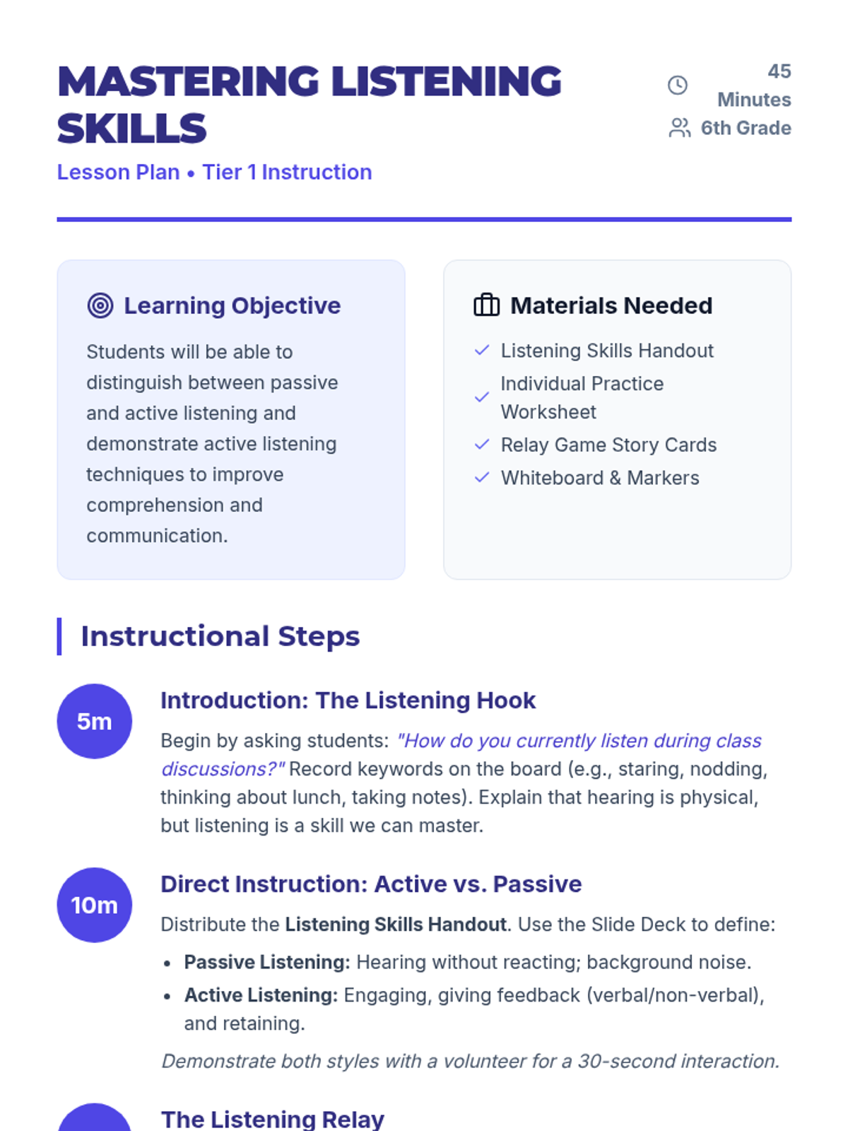A comprehensive 45-minute lesson for 6th-grade students exploring the differences between passive and active listening through interactive games and reflection.
