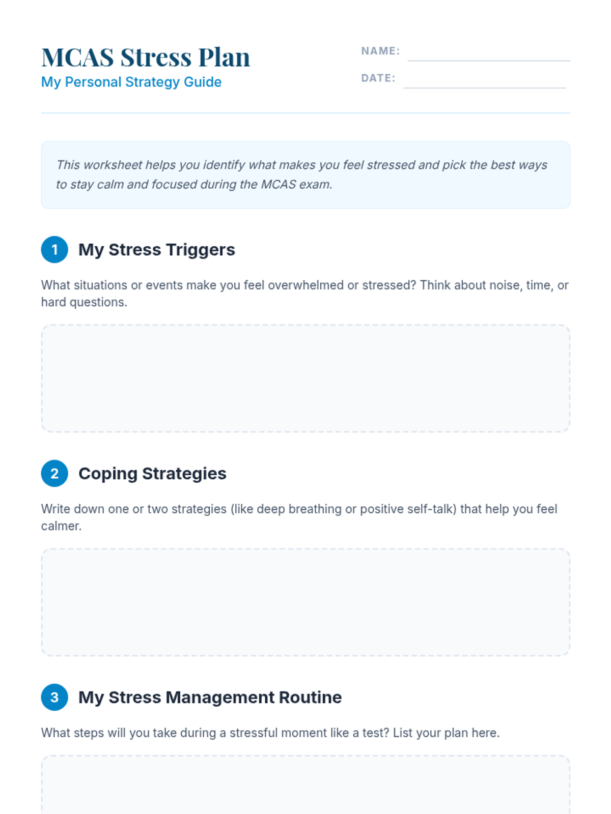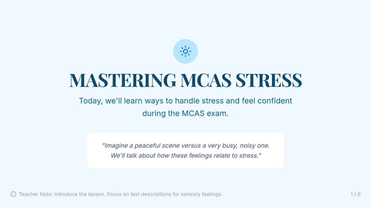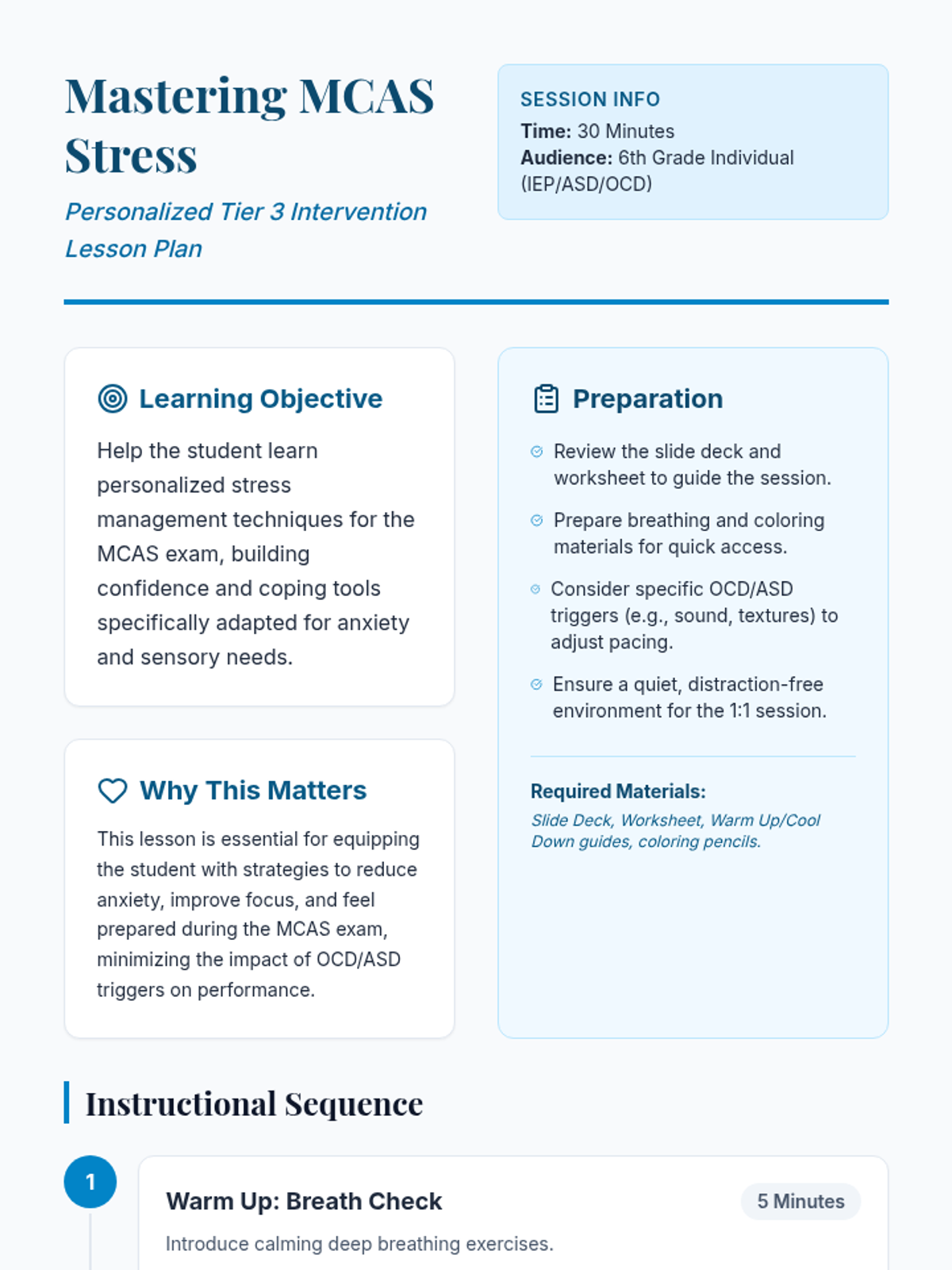 A personalized Tier 3 lesson for a 6th-grade student with OCD, ASD, and anxiety, focusing on practical stress management strategies and coping techniques specifically tailored for the MCAS exam environment.