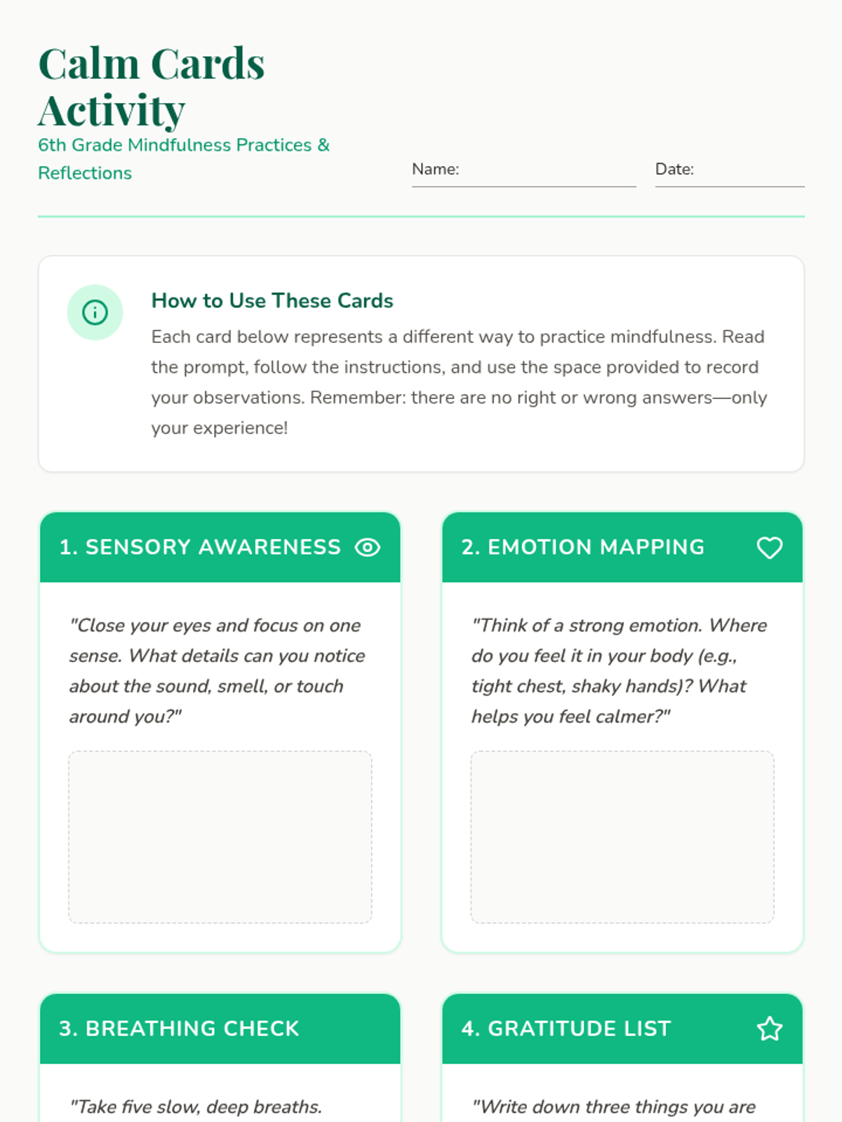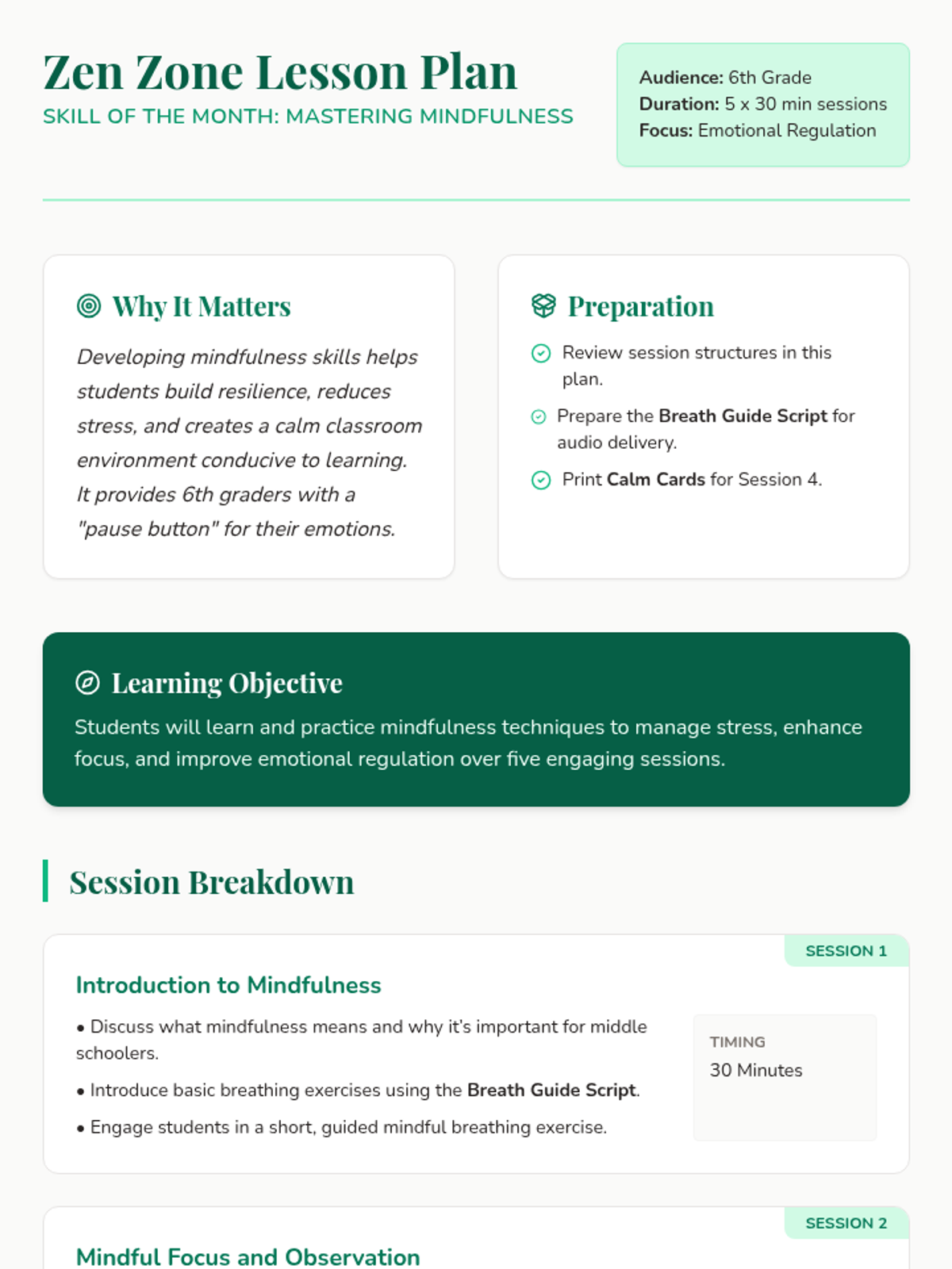 A 5-session sequence for 6th graders to develop mindfulness, manage stress, and improve emotional regulation through practical techniques.