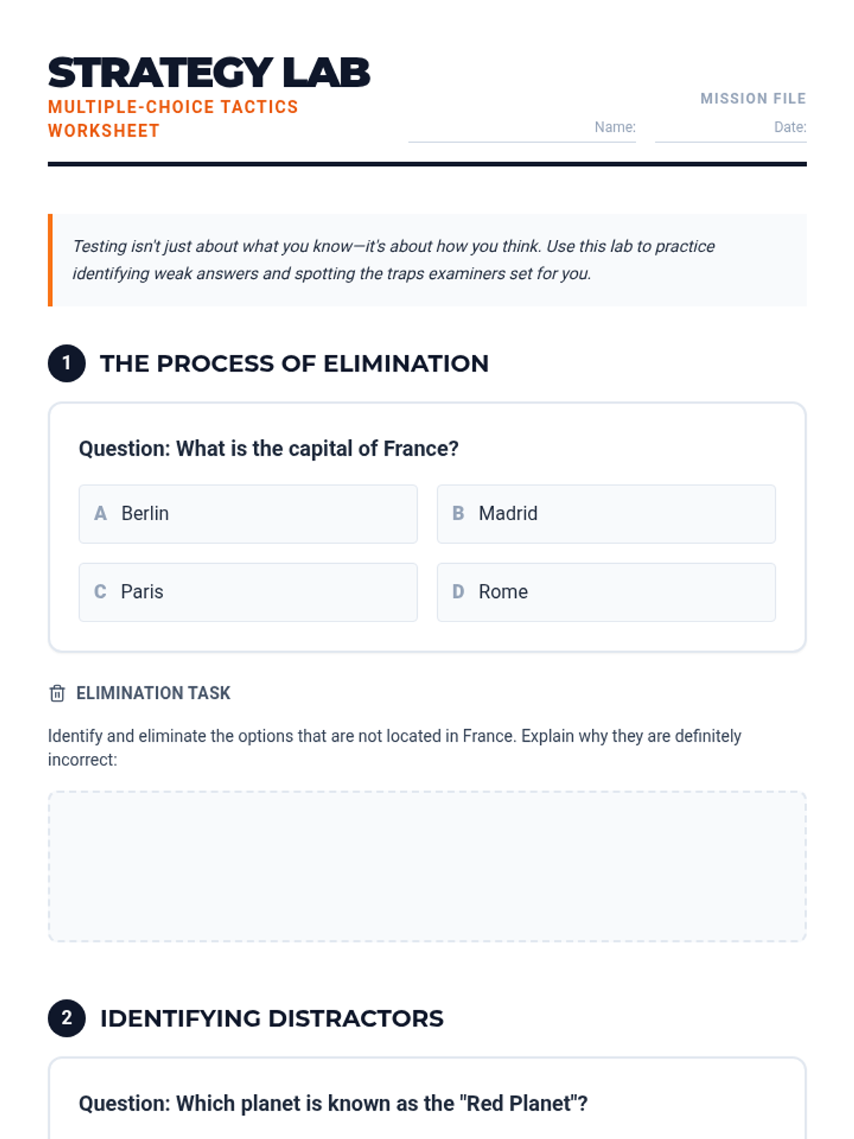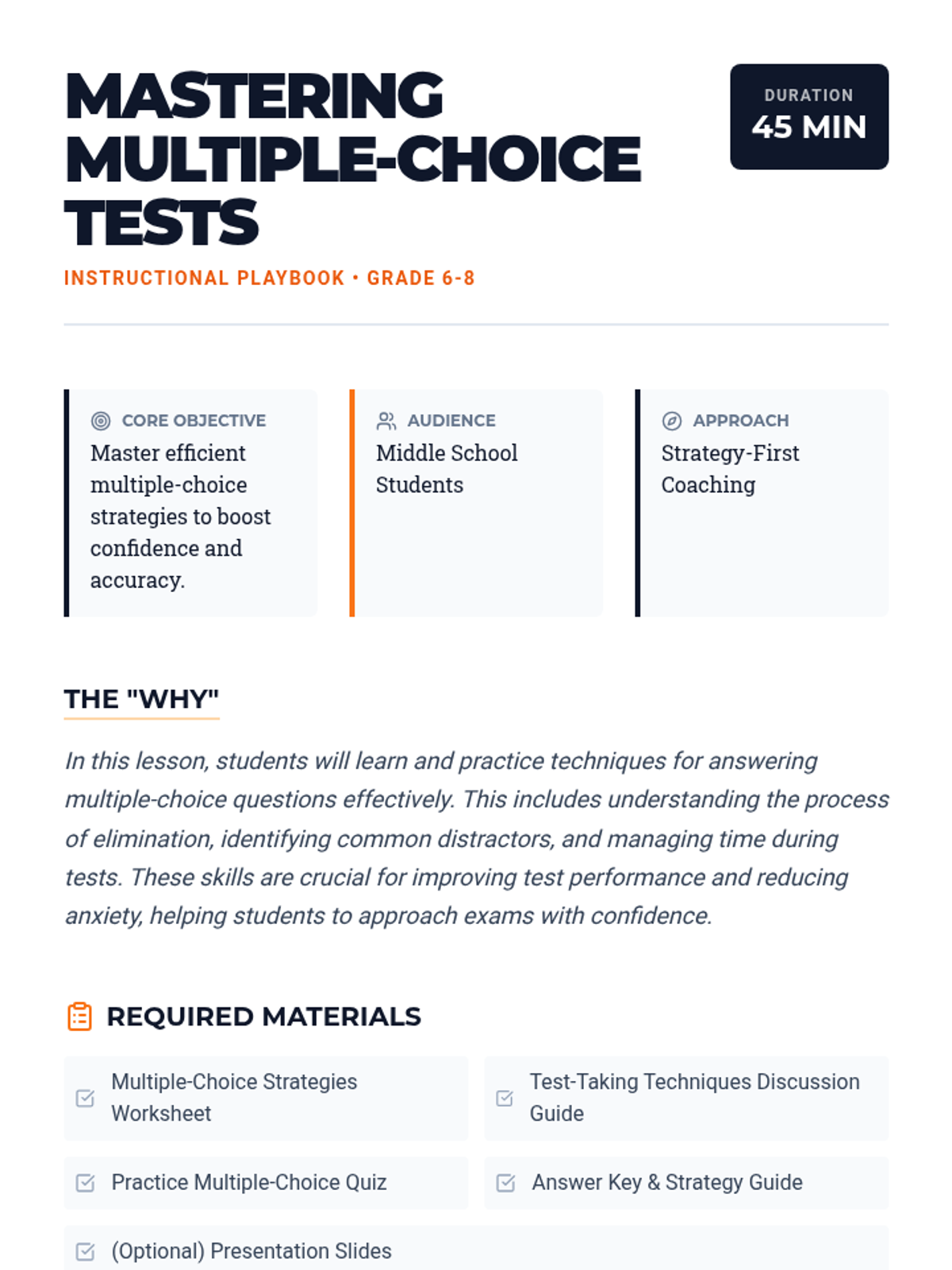 A comprehensive lesson for middle school students to master multiple-choice test strategies, including the process of elimination, identifying distractors, and effective pacing.
