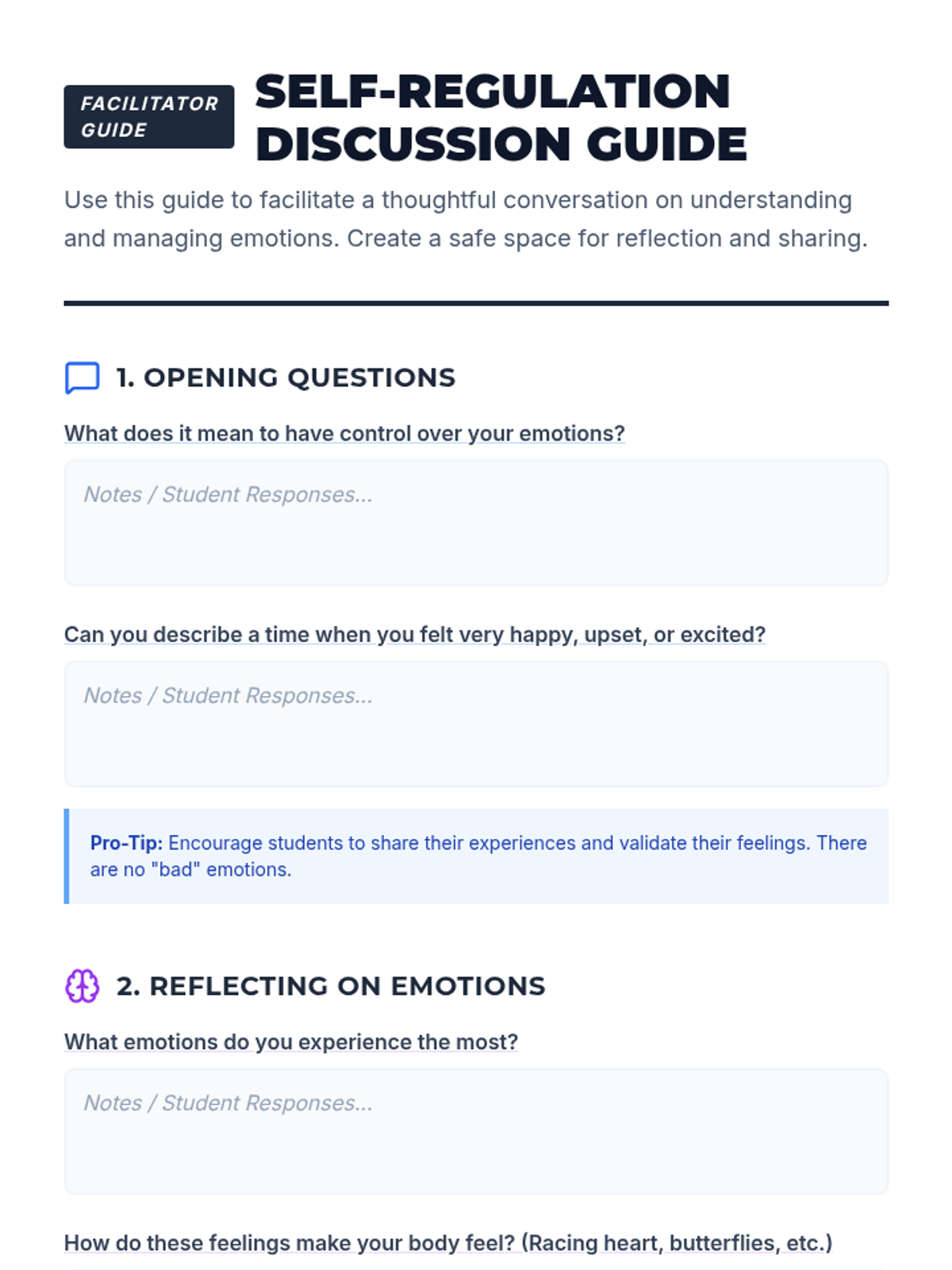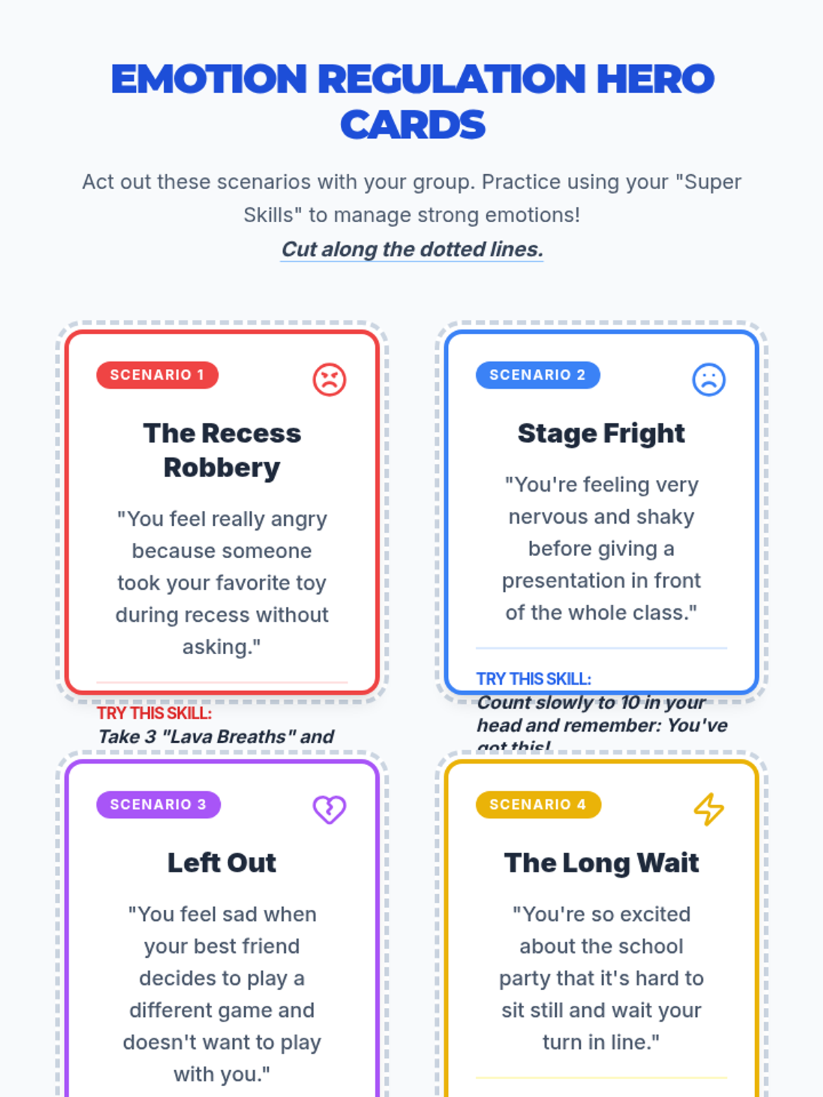 A fun, interactive lesson where 3rd graders practice identifying and applying self-regulation strategies through a board game and BINGO. Students will learn to recognize emotional triggers and choose appropriate 'calm-down' tools.