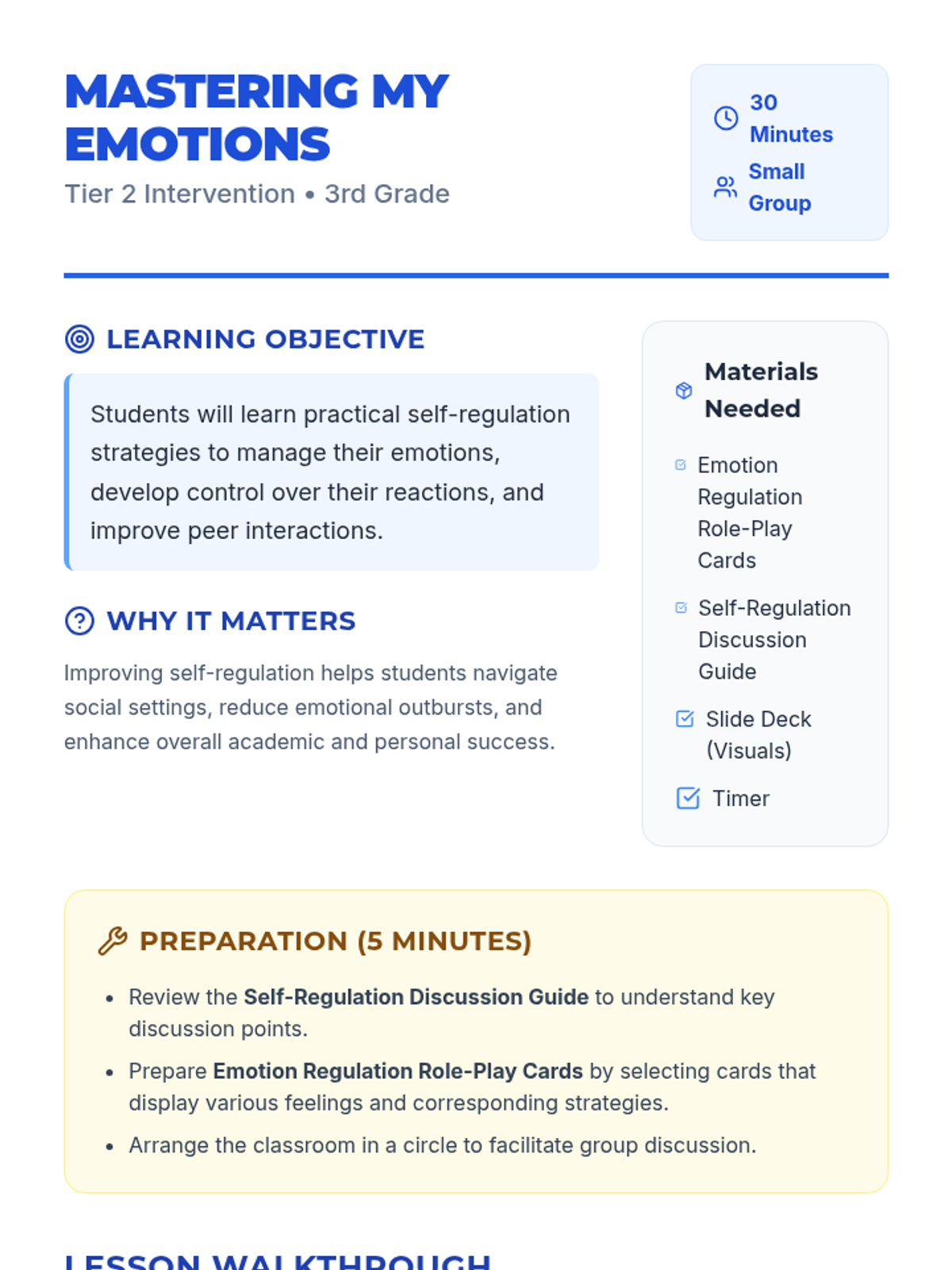 A 30-minute Tier 2 intervention lesson designed for 3rd-grade students to develop self-regulation skills, manage strong emotions, and improve social interactions through interactive discussion and role-play.