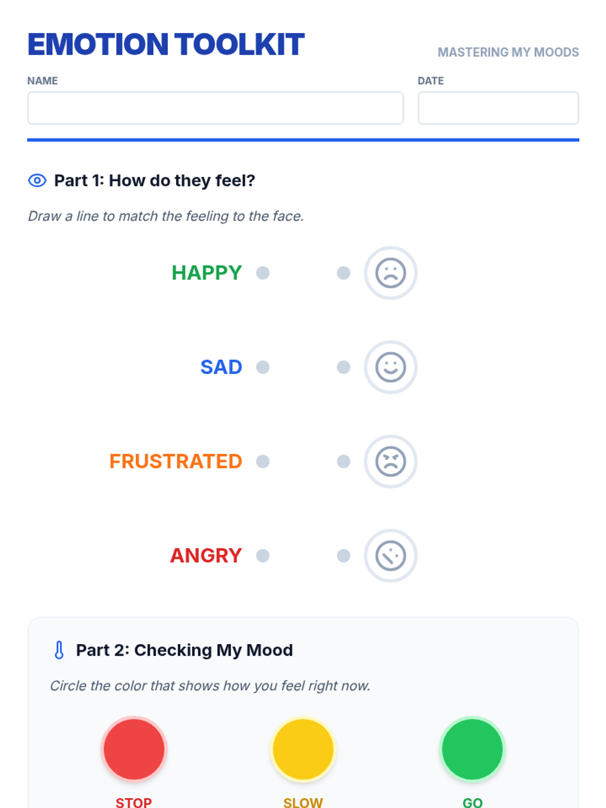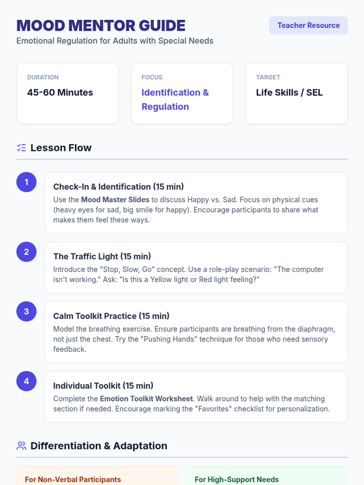 A comprehensive lesson for adults with special needs focused on identifying emotions (happy, sad, angry, frustrated) and implementing practical relaxation and coping strategies.