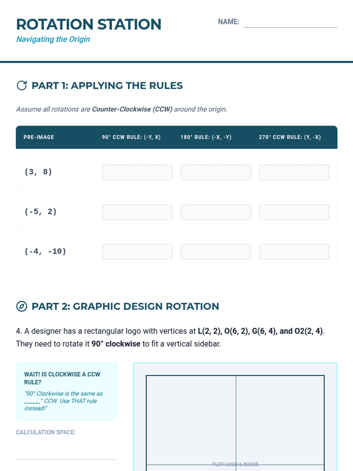 Students learn the specific coordinate rules for 90, 180, and 270-degree rotations around the origin.