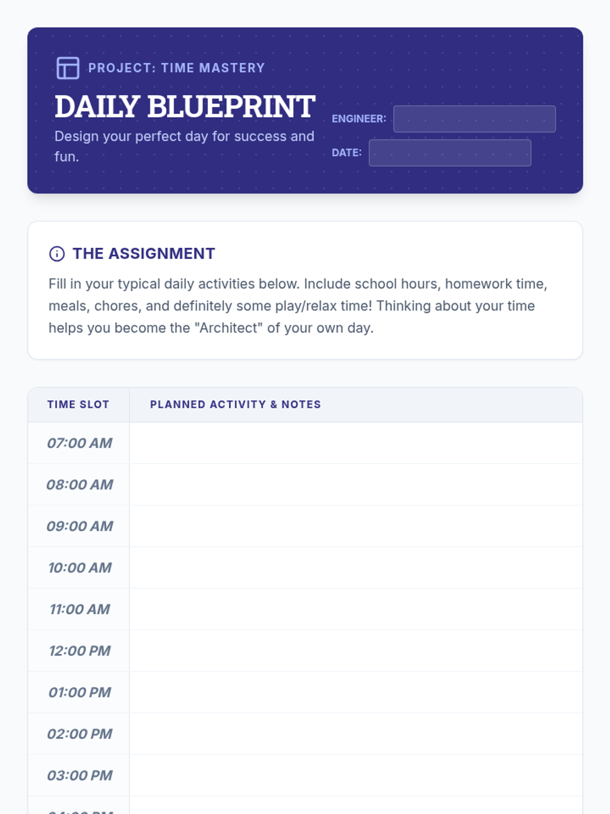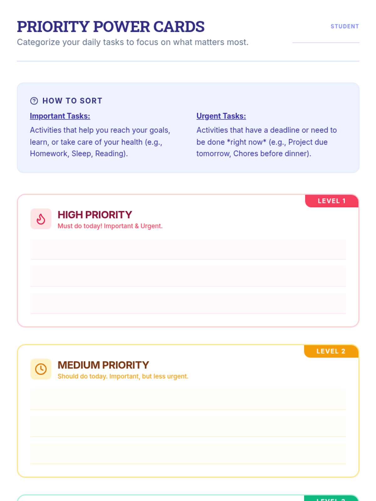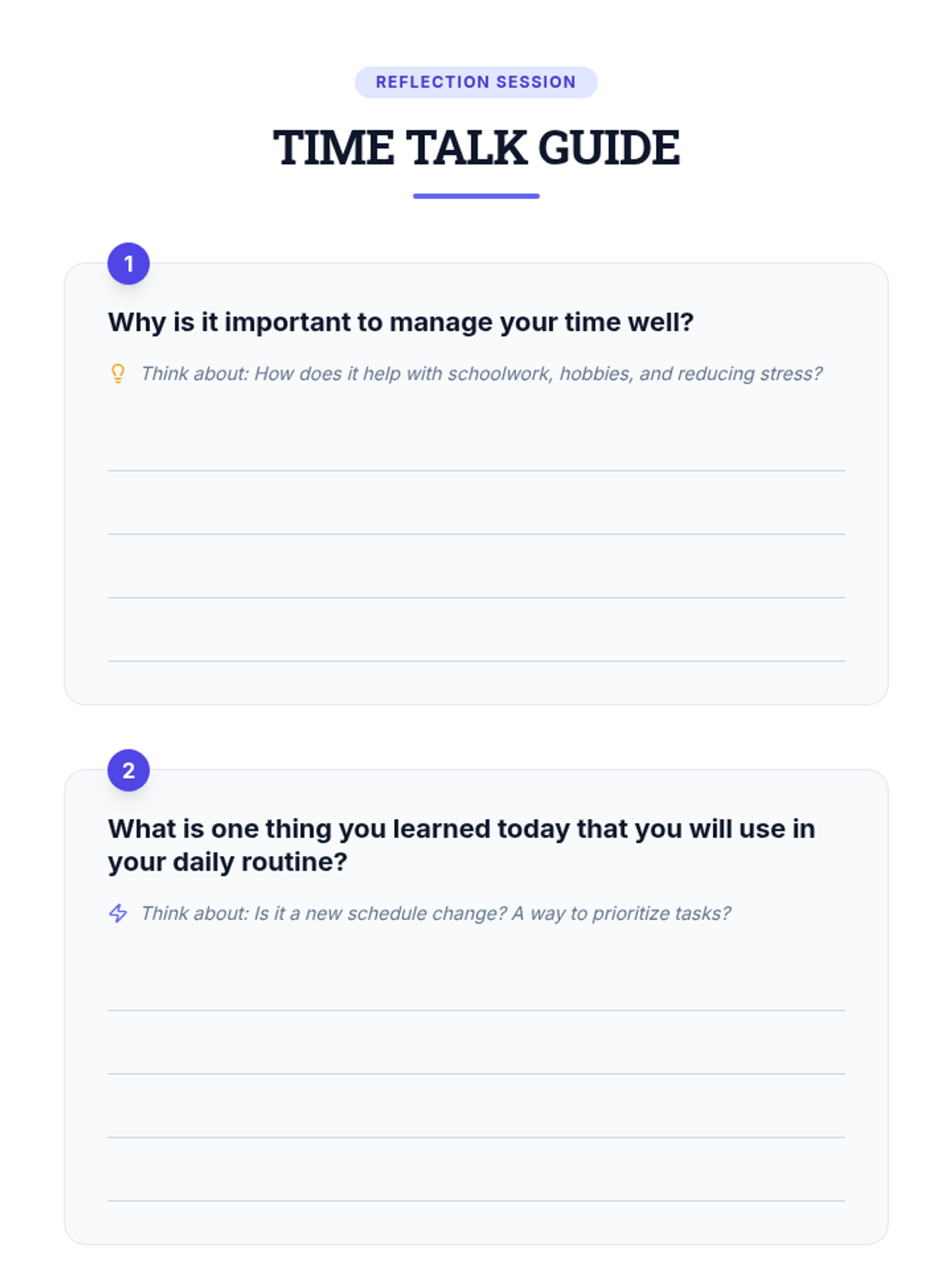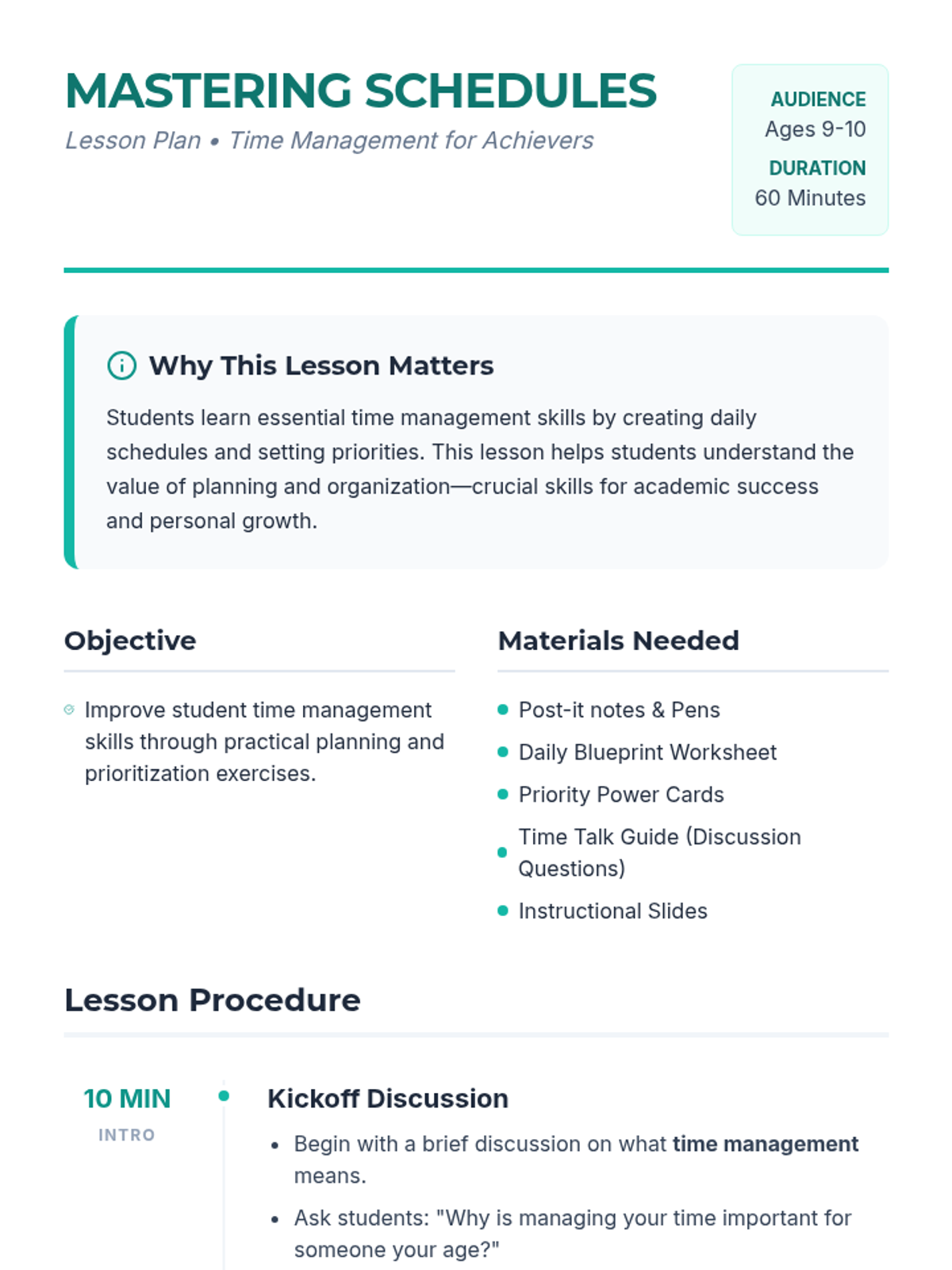 A lesson designed for students aged 9-10 to learn the fundamentals of time management, including creating daily schedules and prioritizing tasks to improve academic and personal organization.