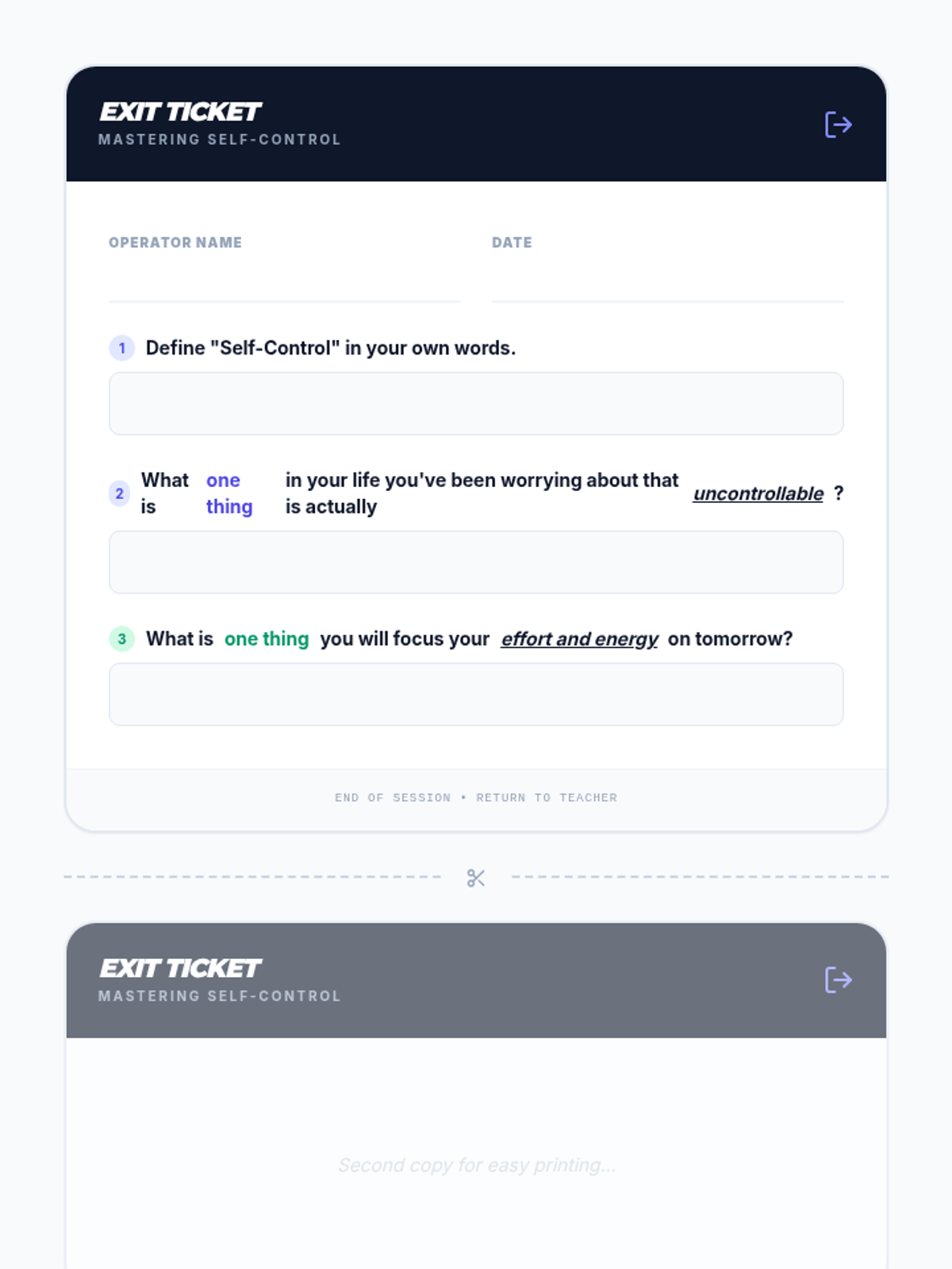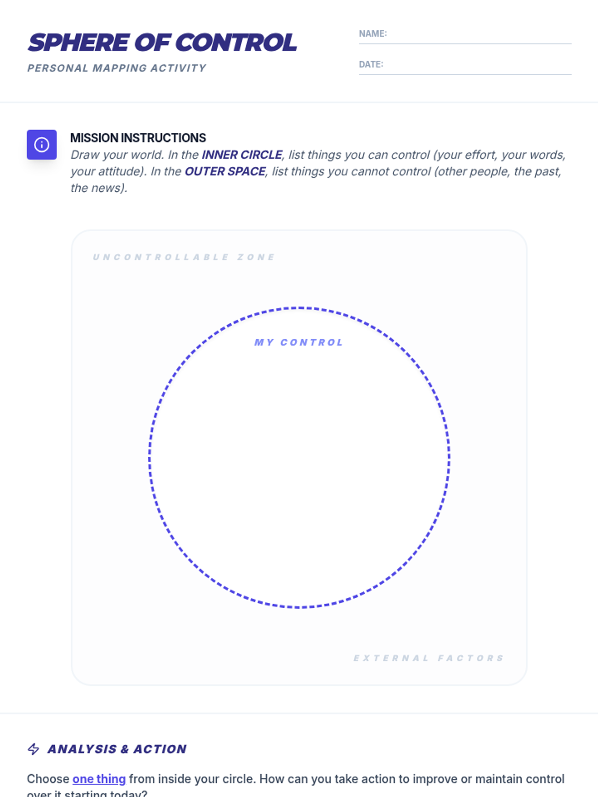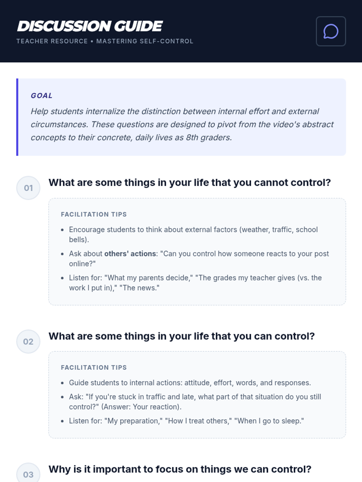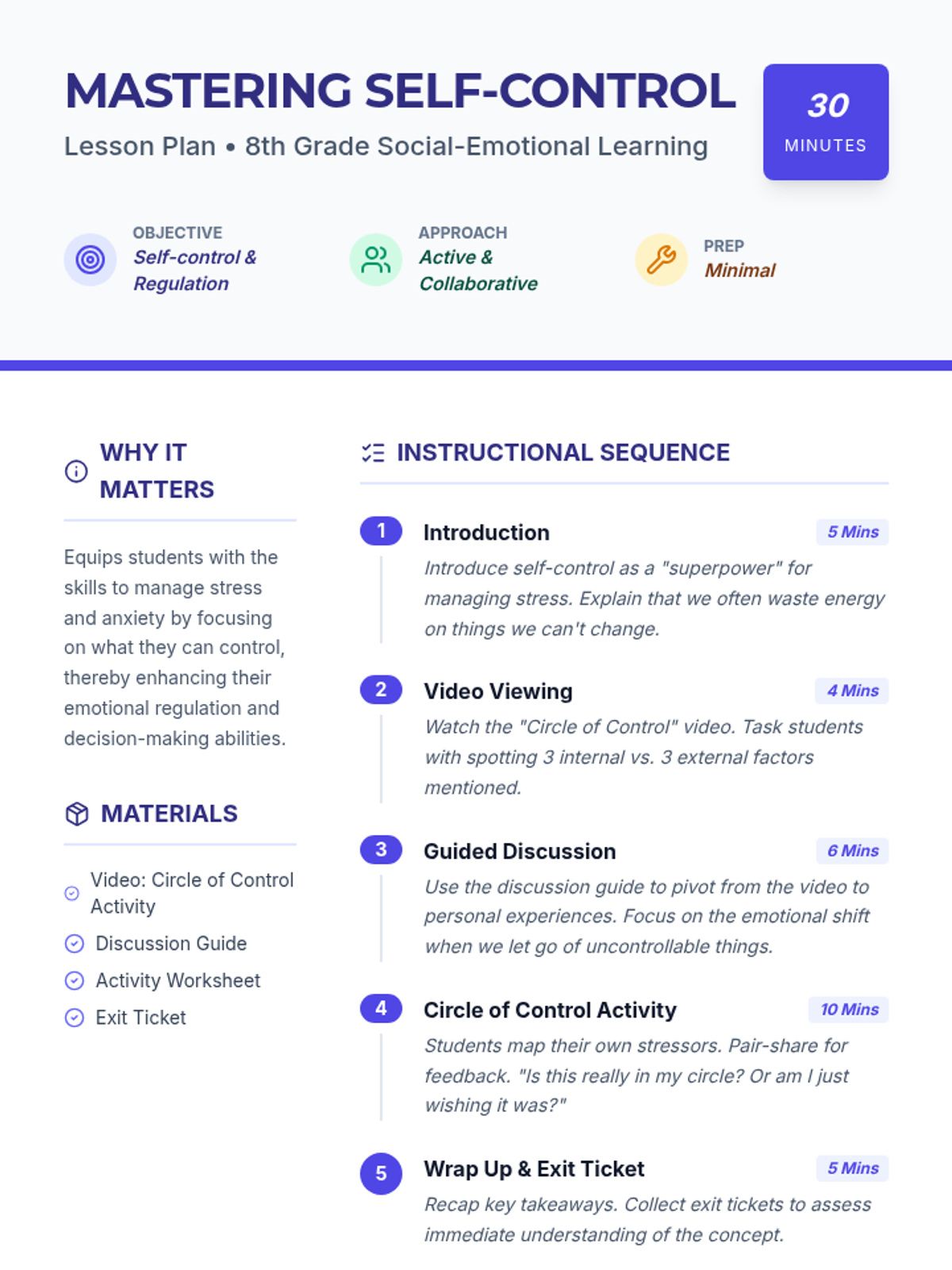 This lesson focuses on teaching 8th graders the concept of self-control through active and collaborative learning strategies, helping them manage stress by identifying what they can and cannot control.