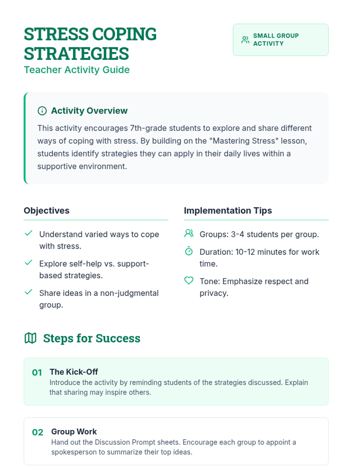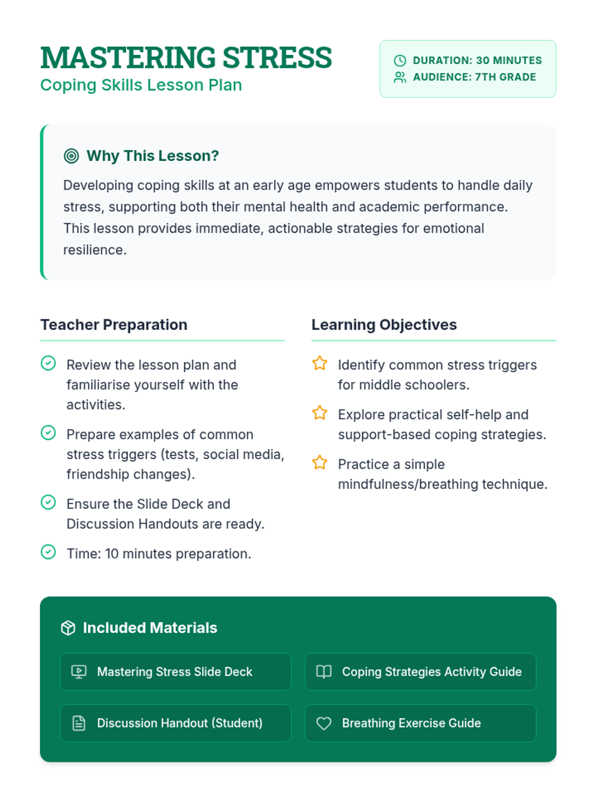 A 30-minute Tier 1 classroom lesson for 7th graders focused on identifying stress triggers and developing practical coping strategies to build emotional resilience.