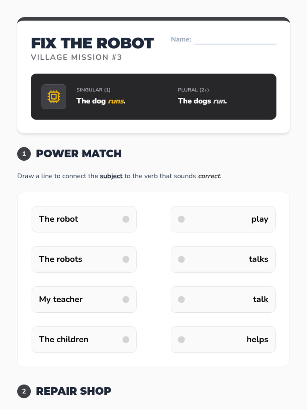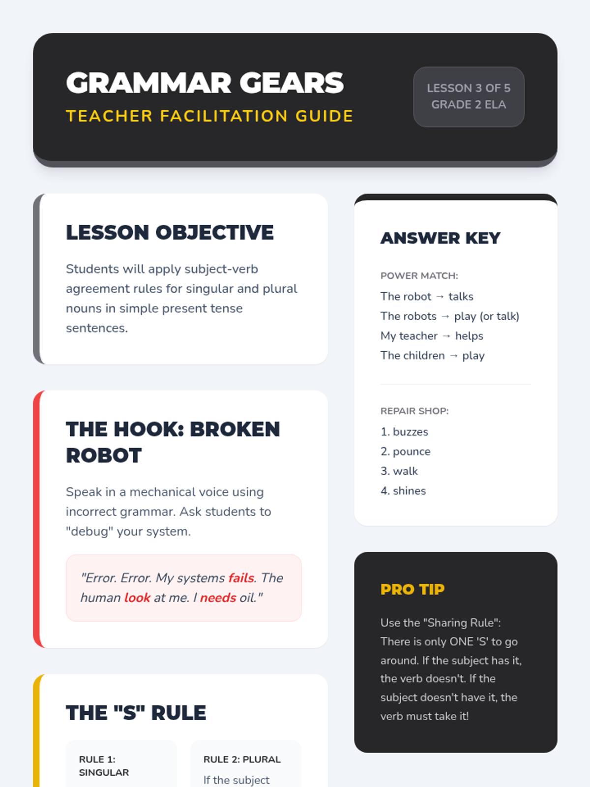 Students tackle the rules of singular and plural subjects through a 'Broken Robot' theme. They practice pairing subjects with the correct verb form to ensure grammatical accuracy in their writing.