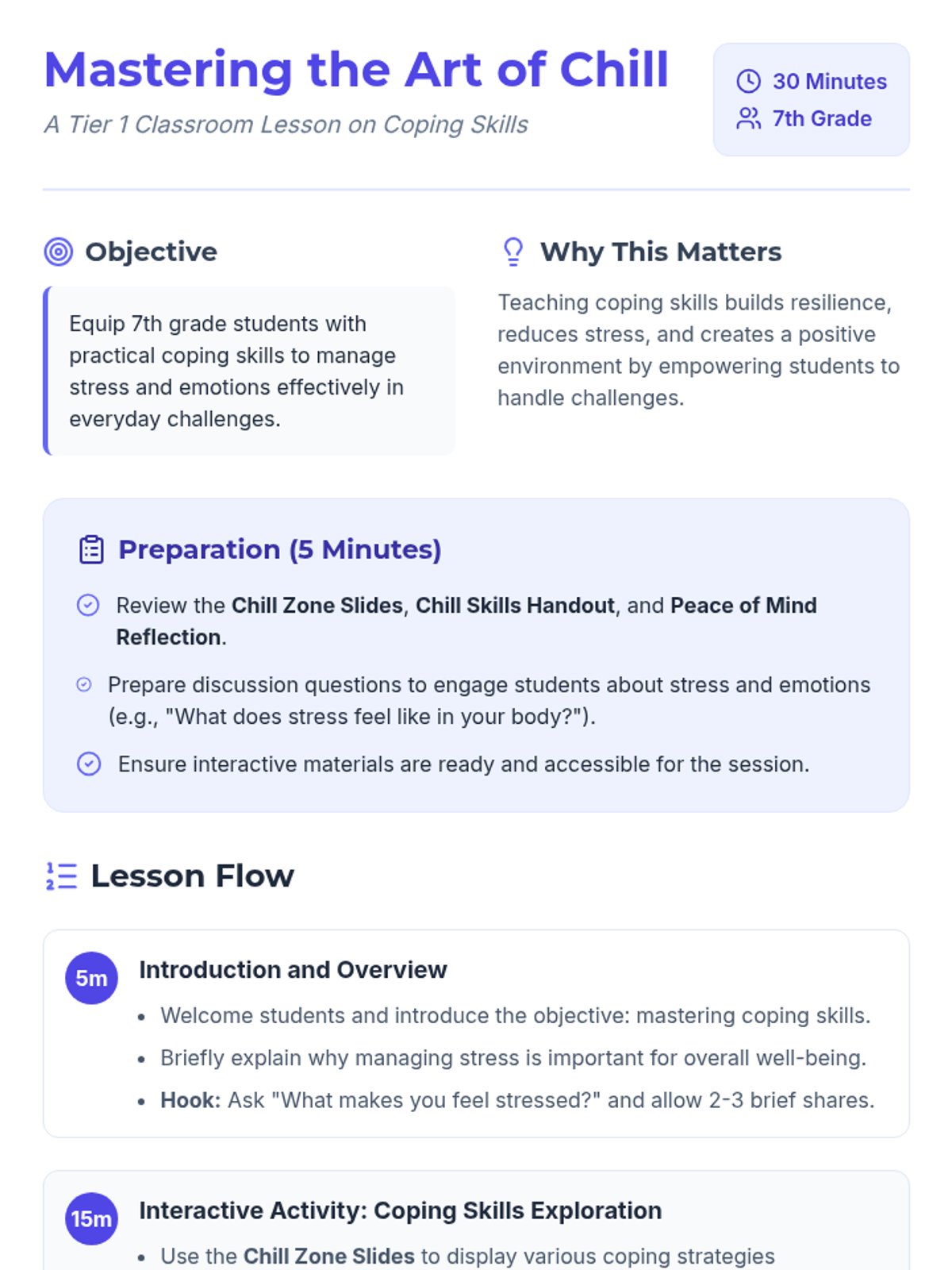 A 30-minute lesson for 7th graders focused on identifying and practicing practical coping skills like deep breathing, physical activity, and visualization to manage stress and emotions.
