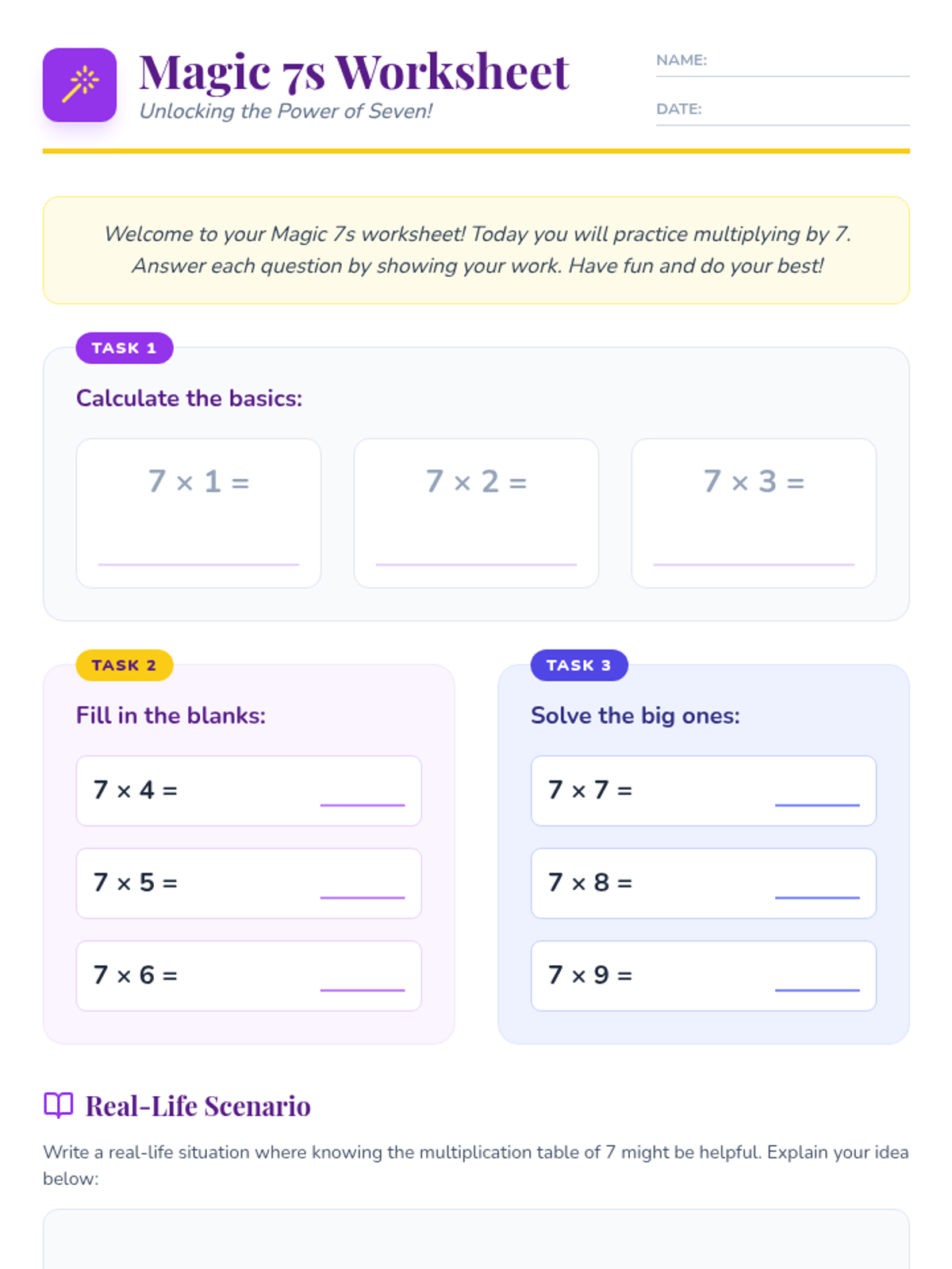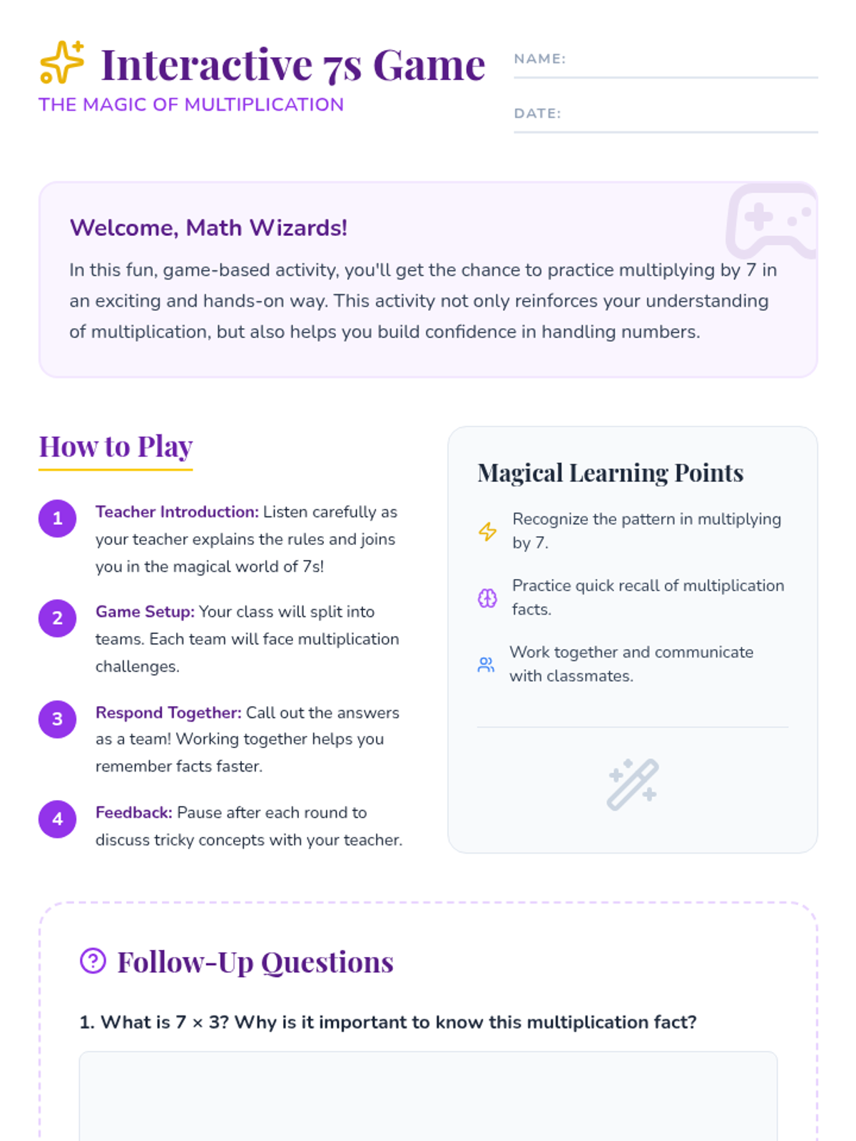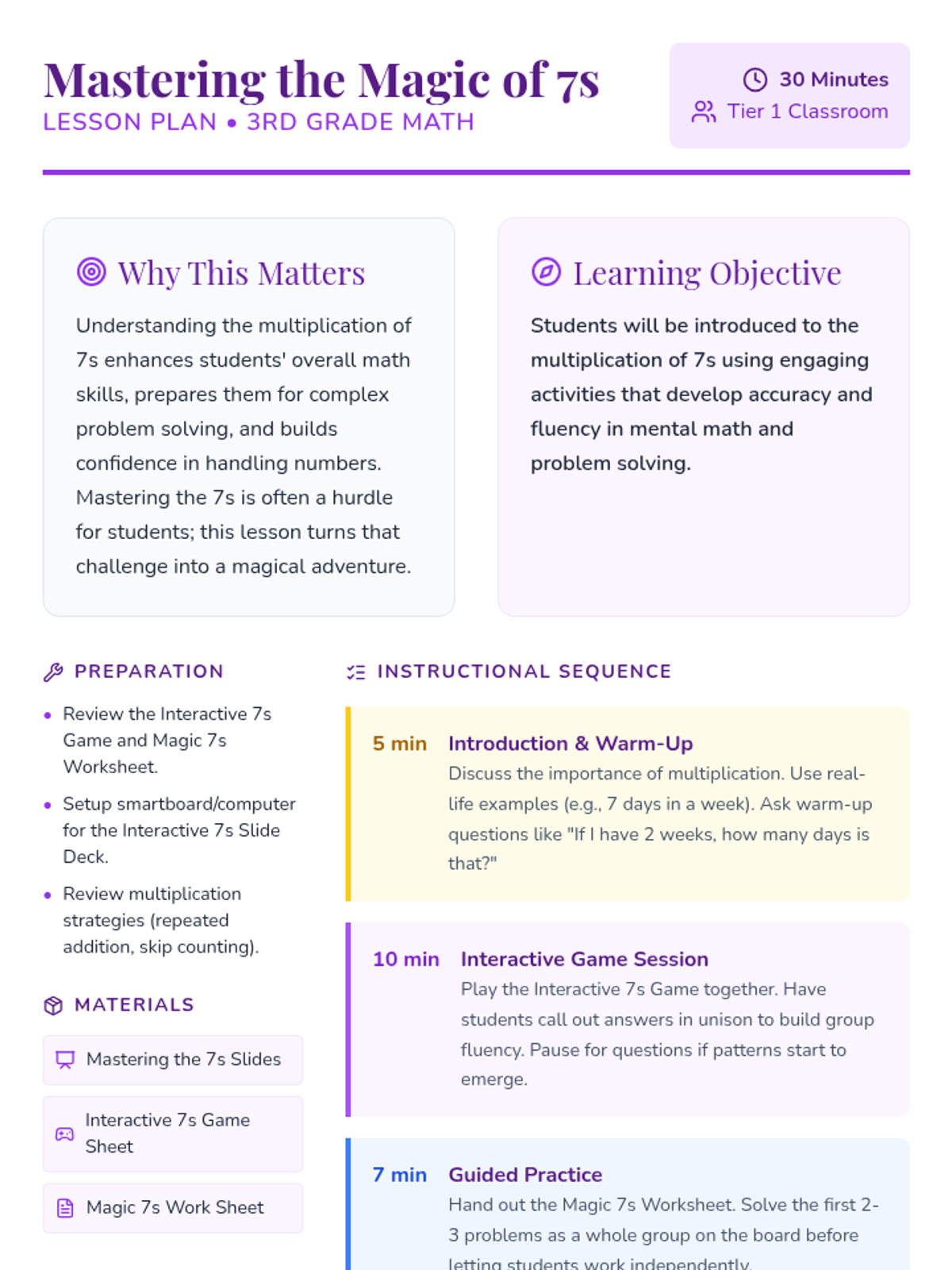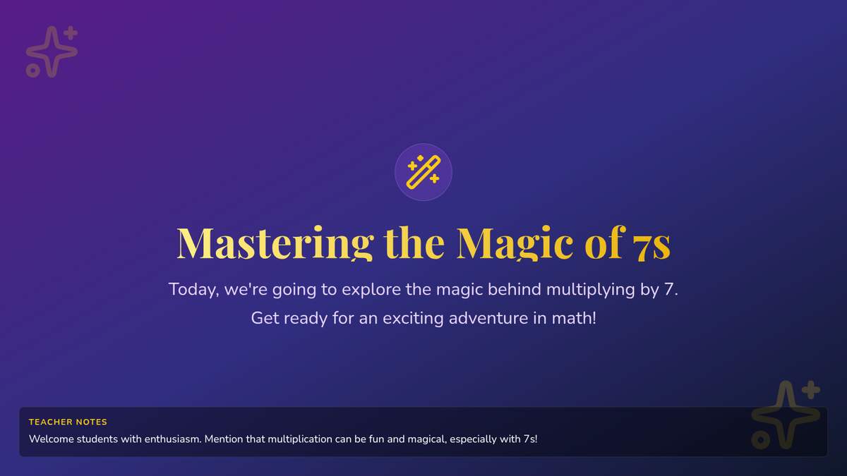 An engaging 30-minute lesson for 3rd graders to master the multiplication of 7s through magic-themed activities, interactive games, and guided practice.