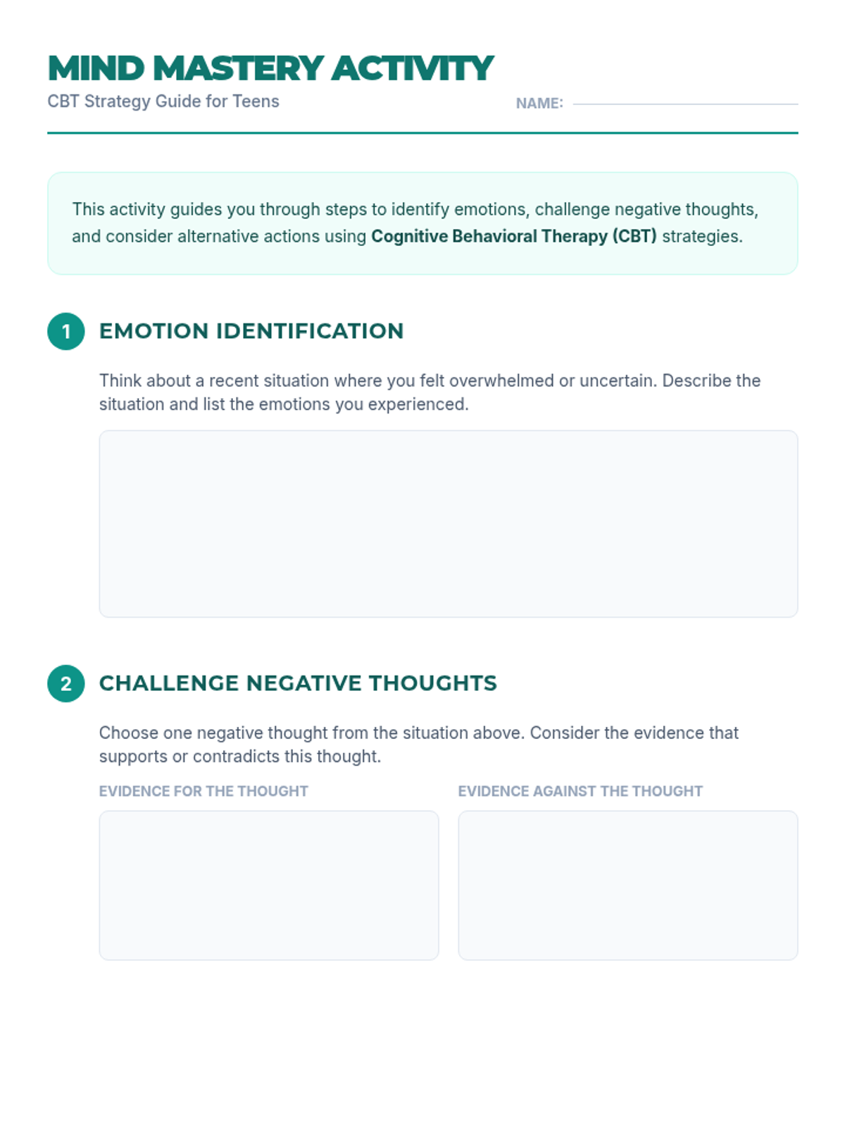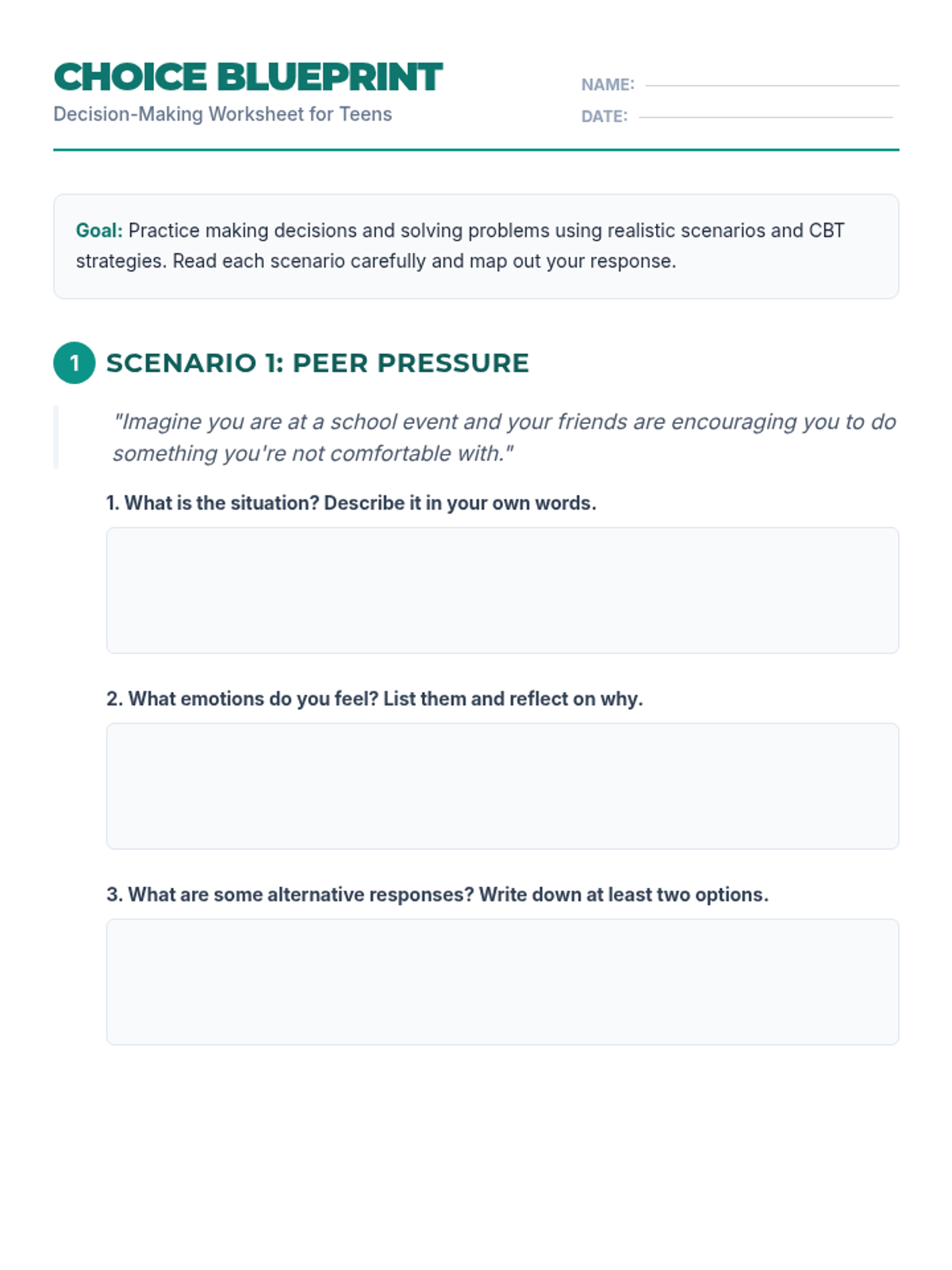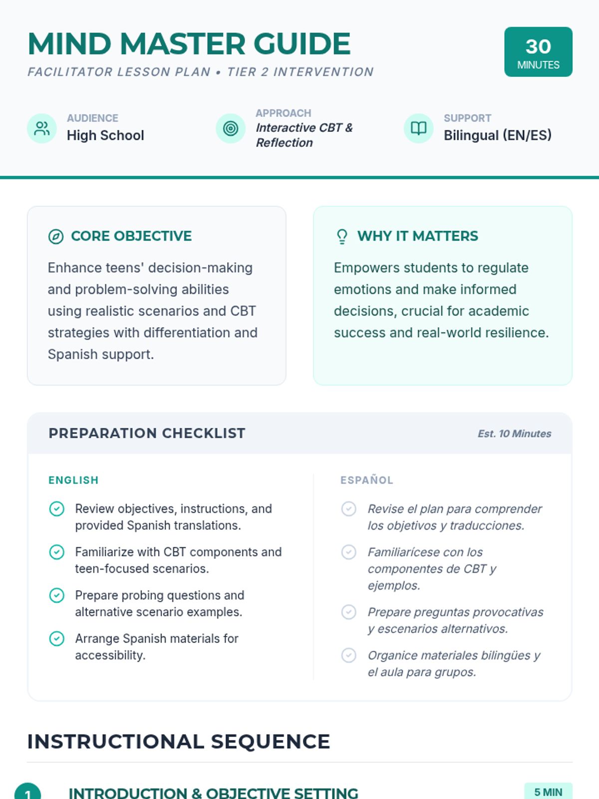 A Tier 2 intervention lesson for high school students focusing on CBT strategies to improve decision-making and emotional regulation. Students explore realistic scenarios, identify emotional triggers, and develop alternative response strategies.