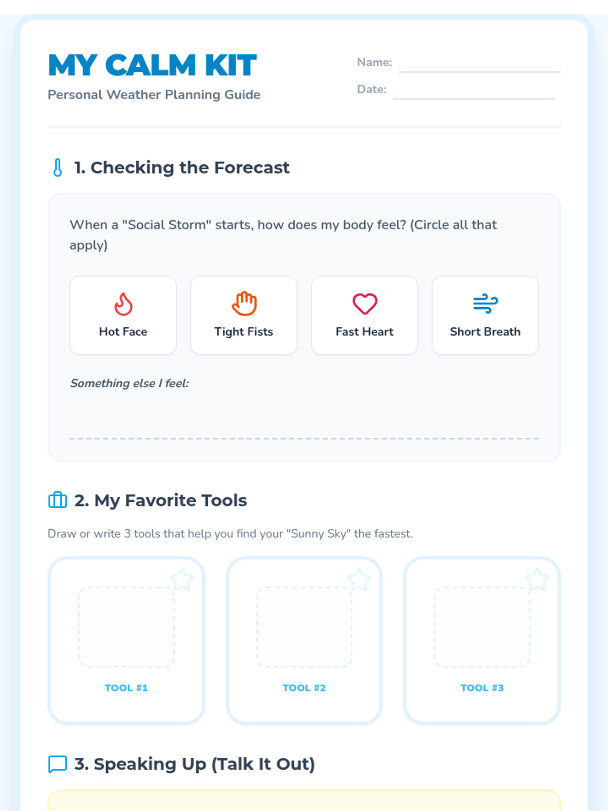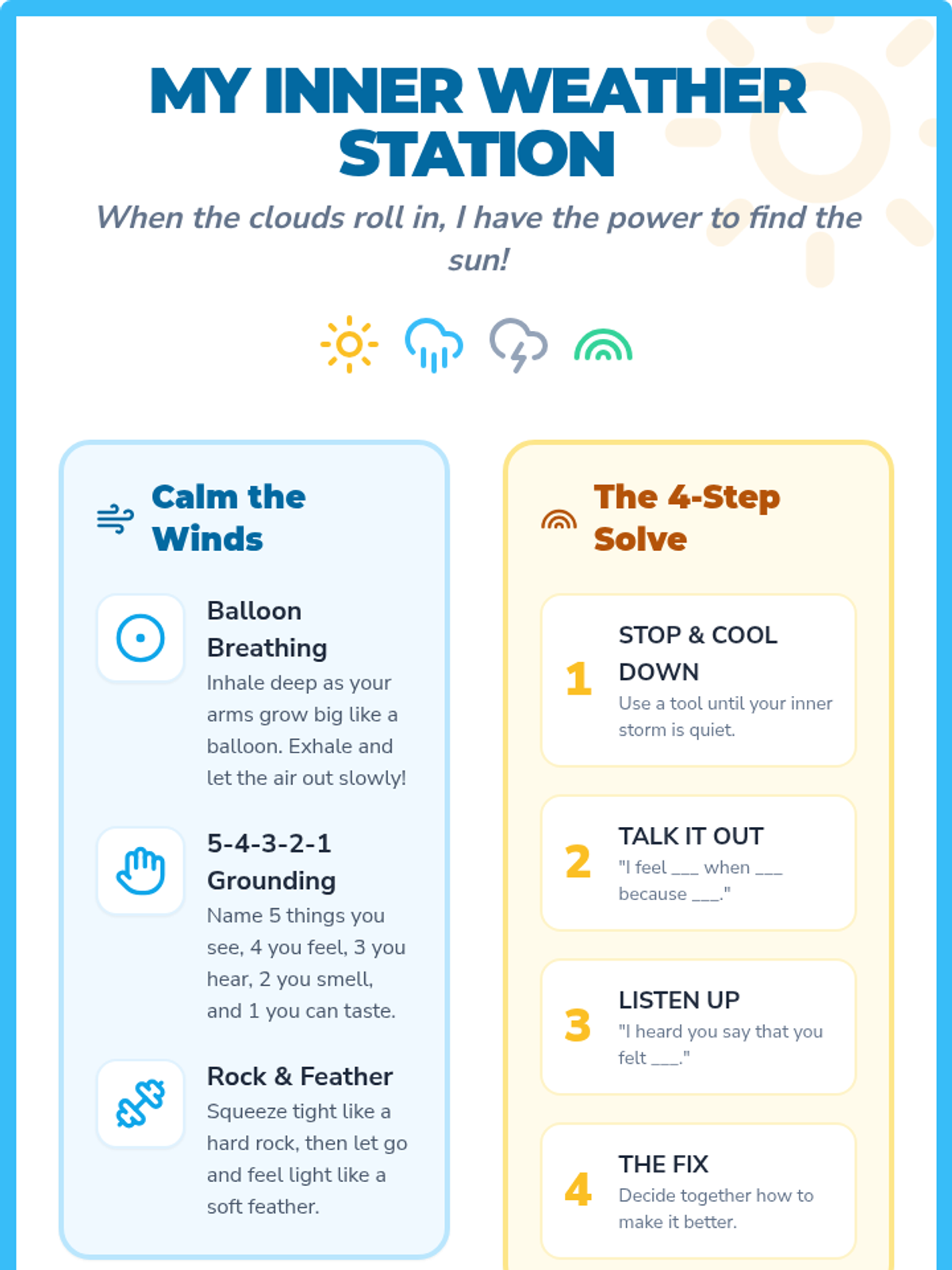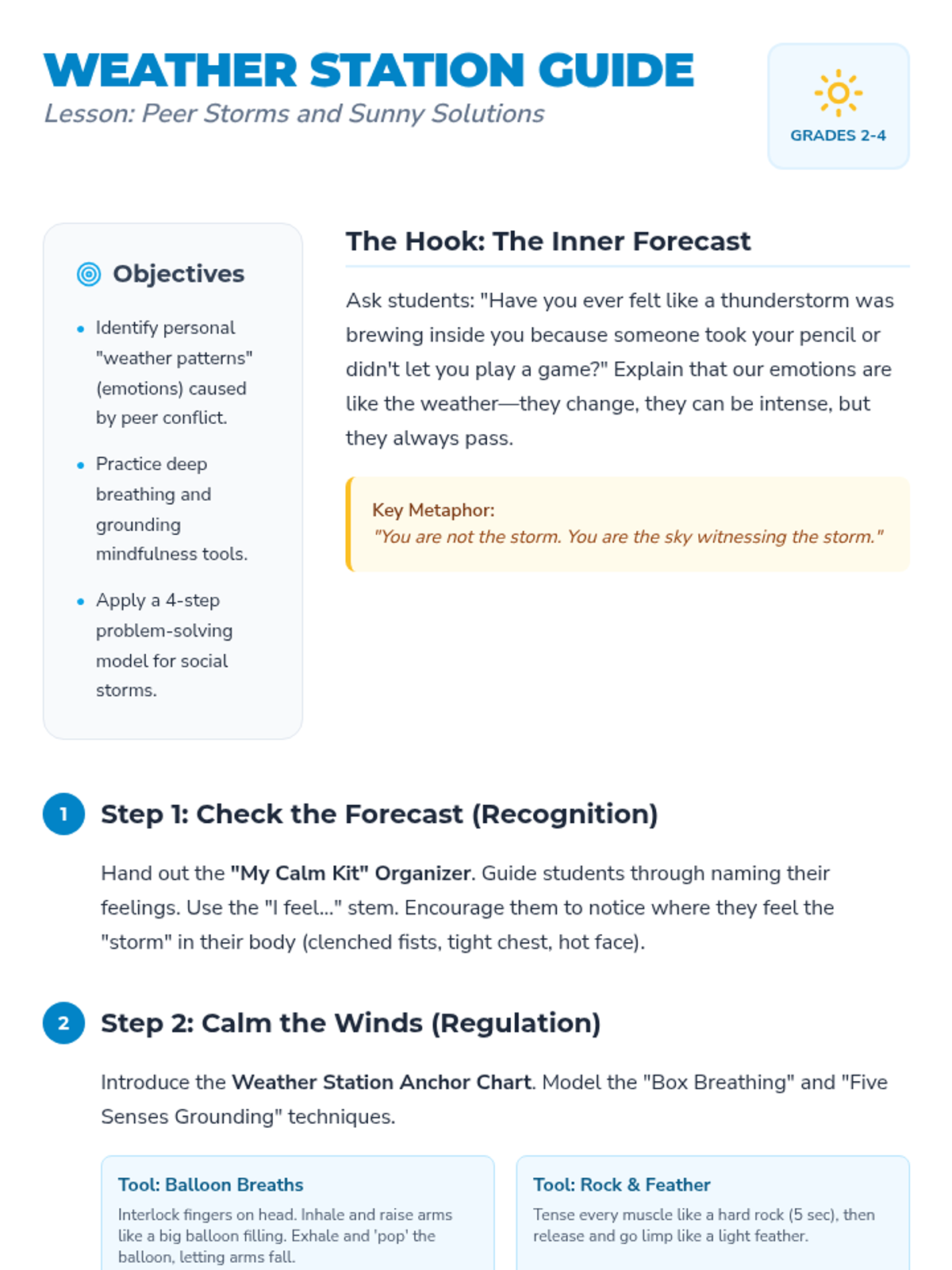 A lesson focused on teaching 3rd grade students how to navigate peer conflicts and emotional turbulence using the 'Inner Weather' metaphor and specific self-regulation tools.