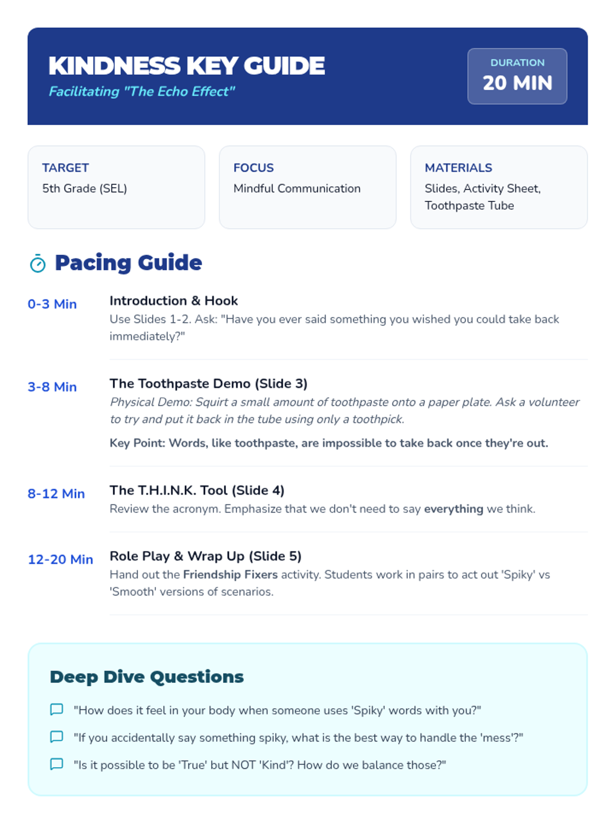 A 20-minute interactive lesson focused on the lasting impact of words on friendships, featuring a 'toothpaste' analogy and role-play scenarios to practice mindful communication.