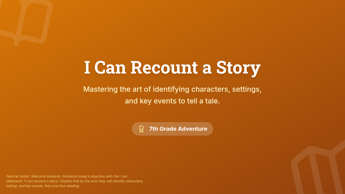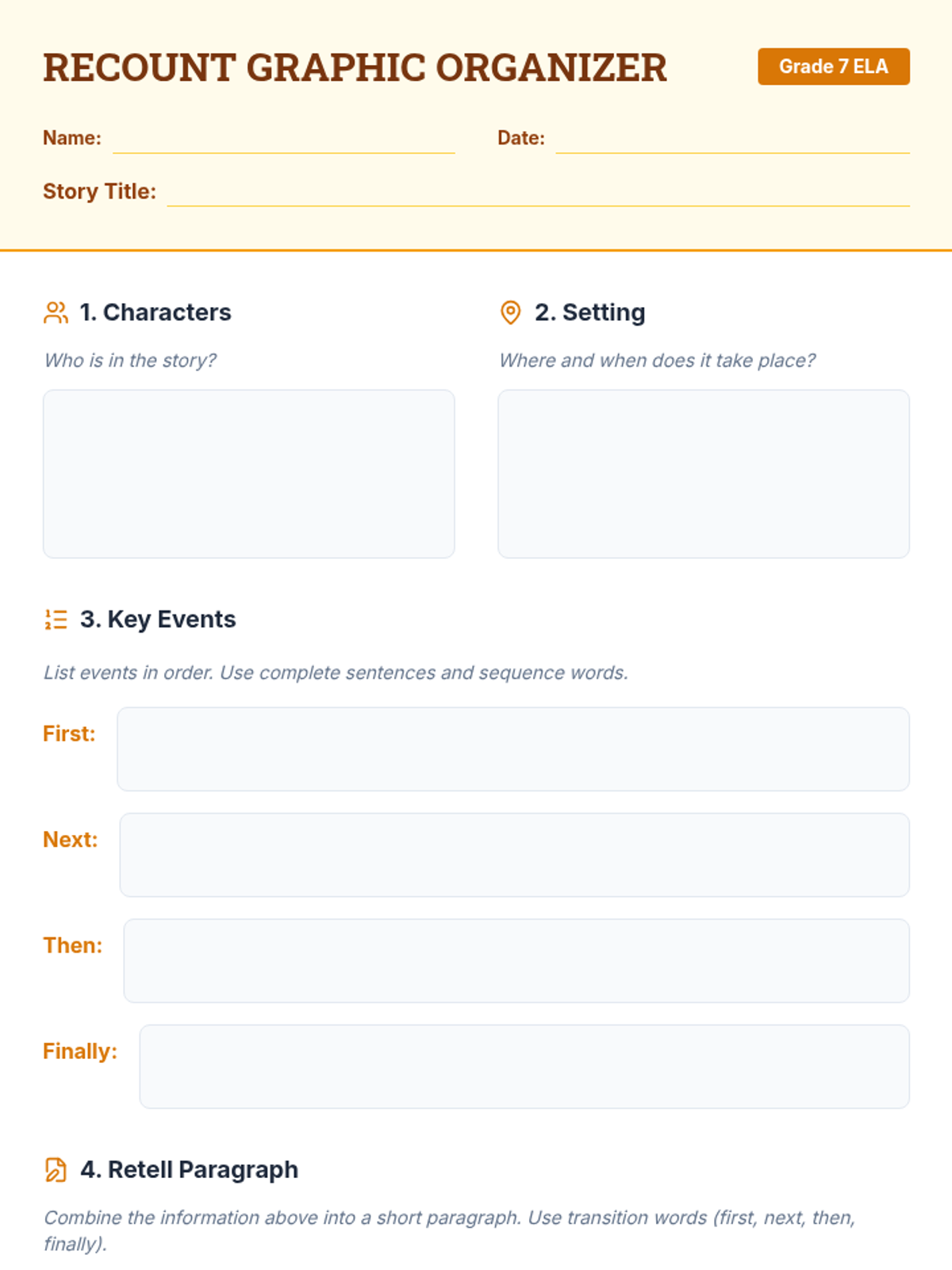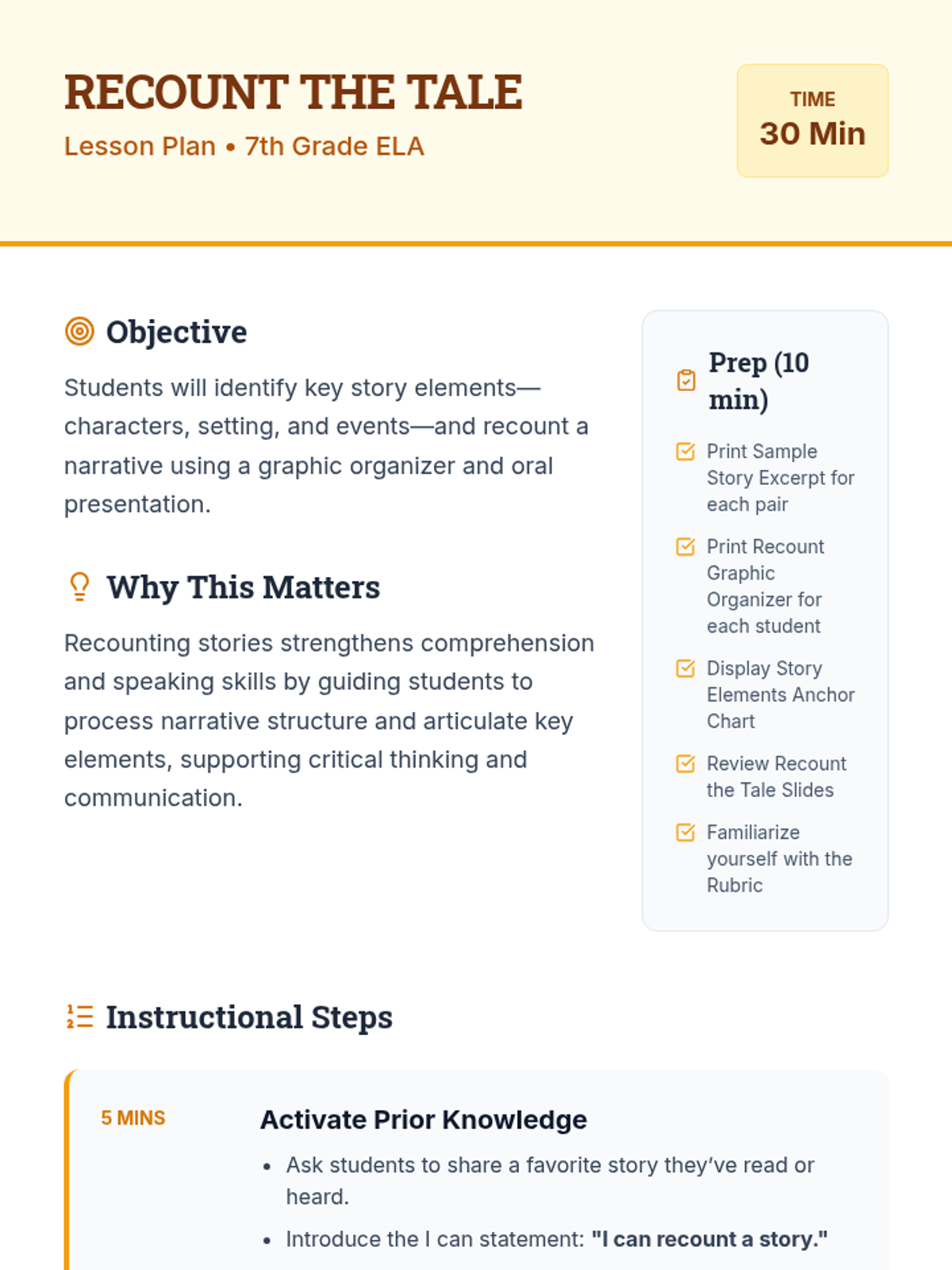 A 30-minute session for 7th graders focusing on analyzing story excerpts to identify complex characters, settings, and sequences of events. Students will practice transforming notes into structured oral and written recounts.