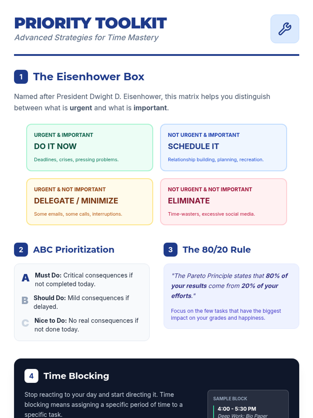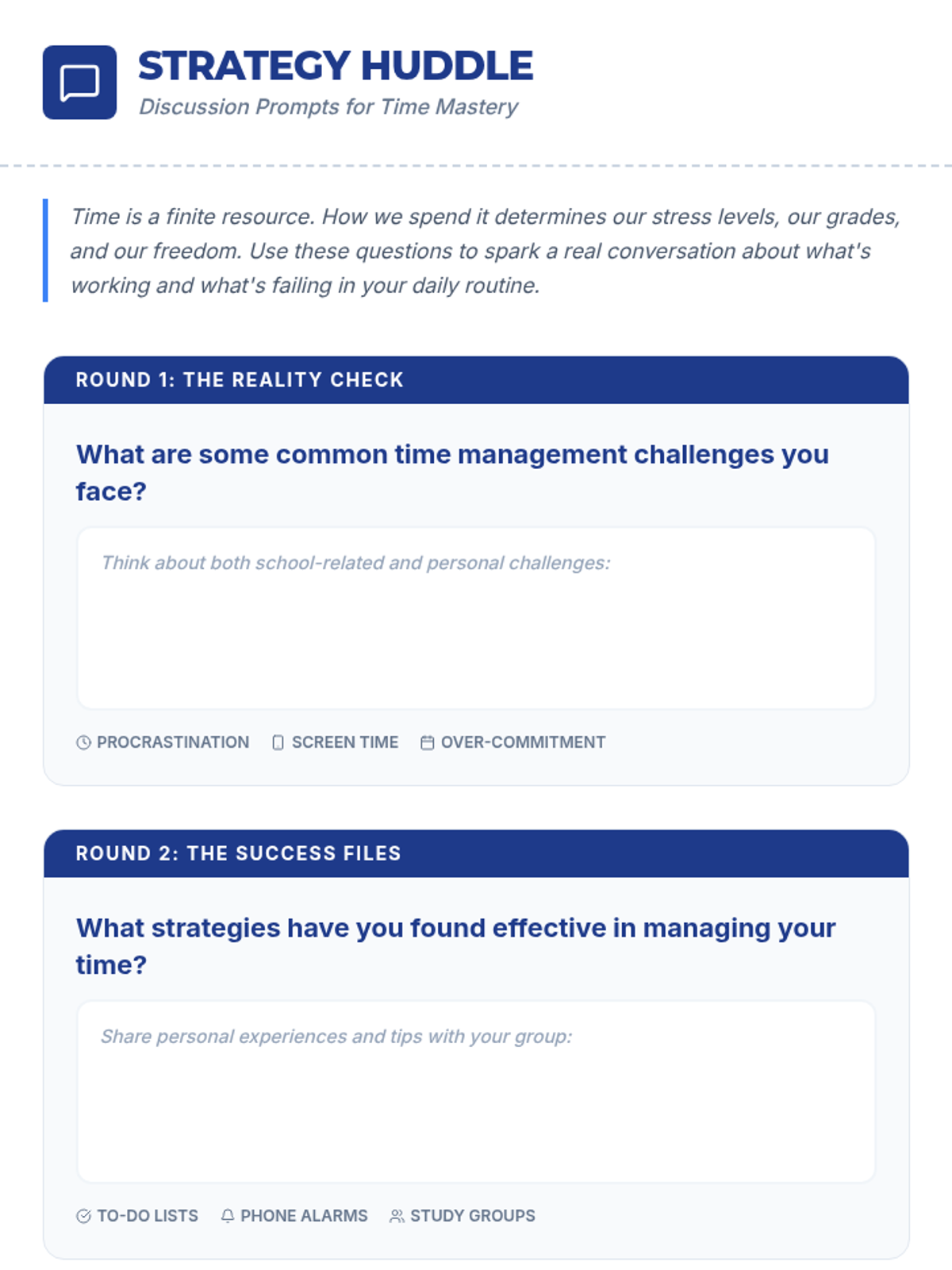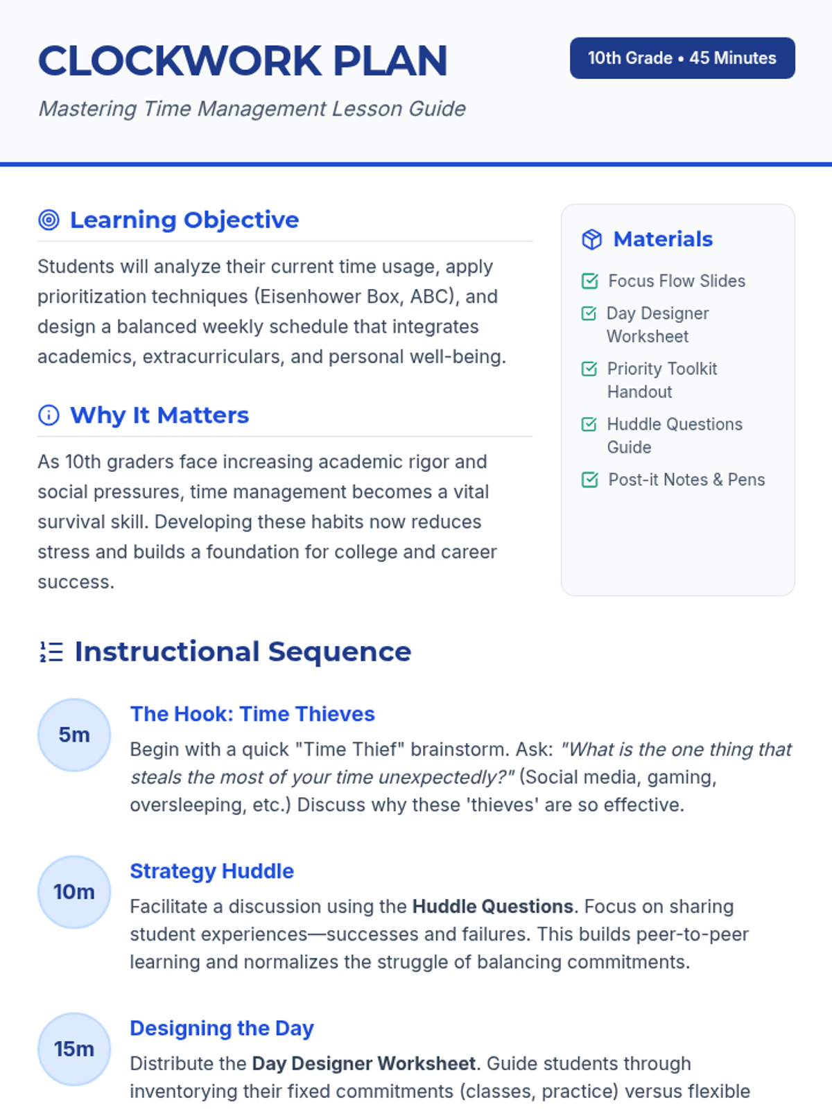 A comprehensive lesson for 10th-grade students on mastering time management through practical scheduling, task prioritization, and stress reduction strategies.