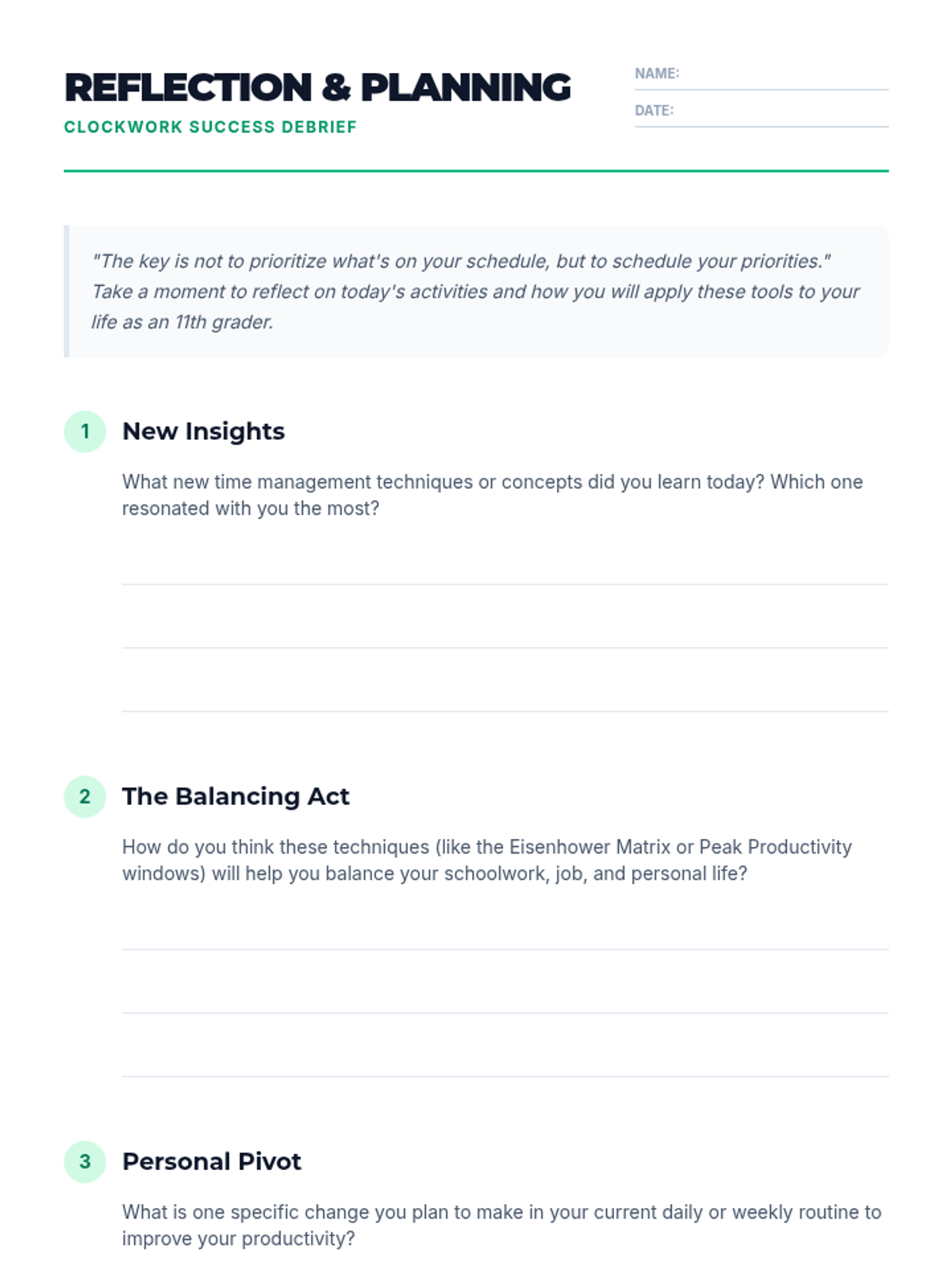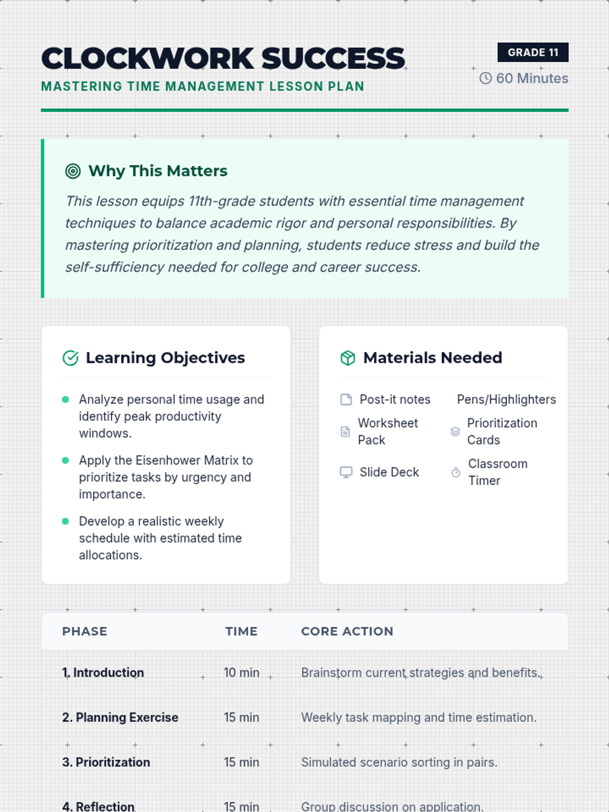 This lesson introduces 11th-grade students to essential time management techniques, helping them balance academic and personal responsibilities through practical exercises and prioritization strategies.