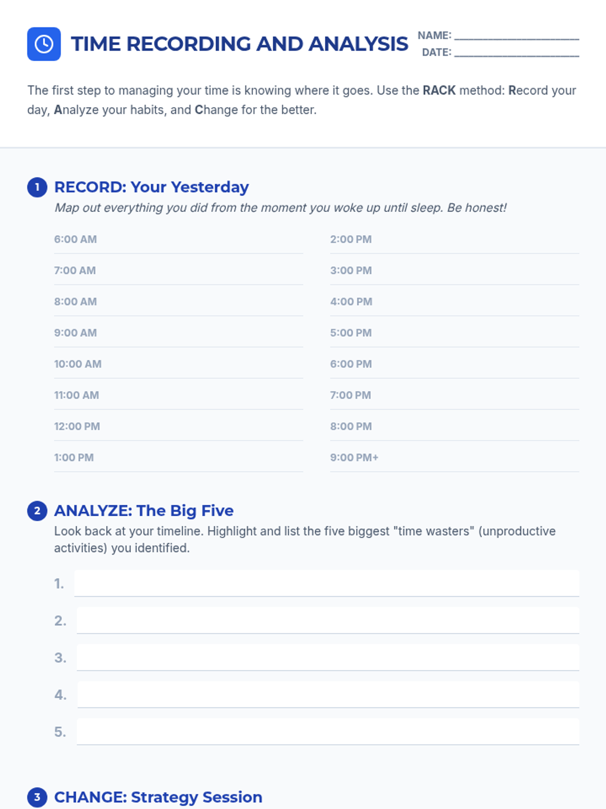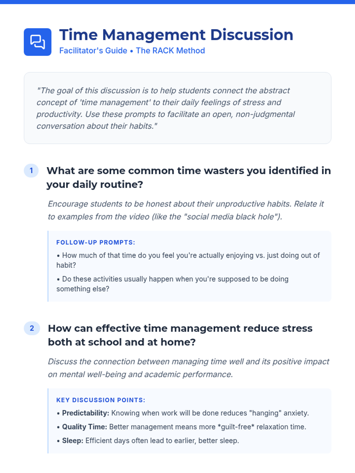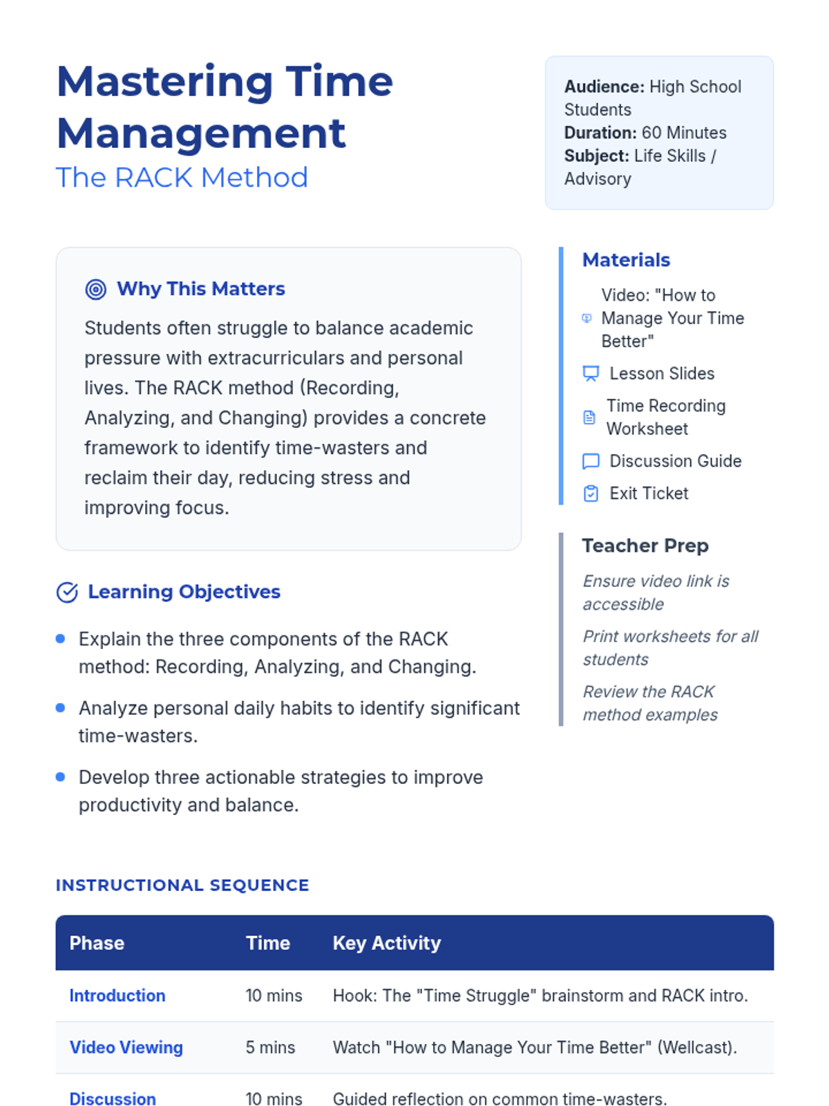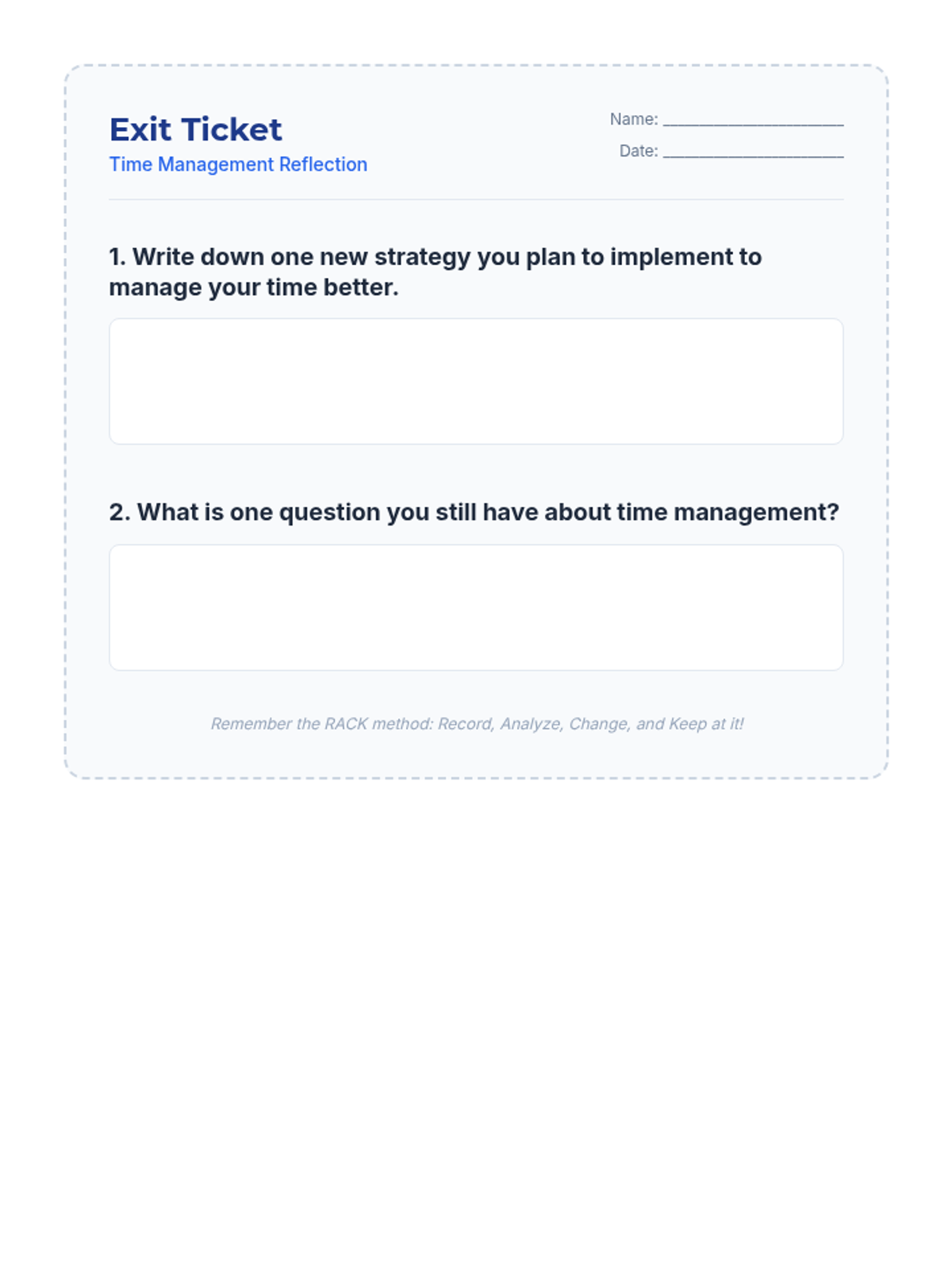 Students will learn strategies for effective time management using the RACK method (Recording, Analyzing, and Changing) based on the Wellcast strategy.