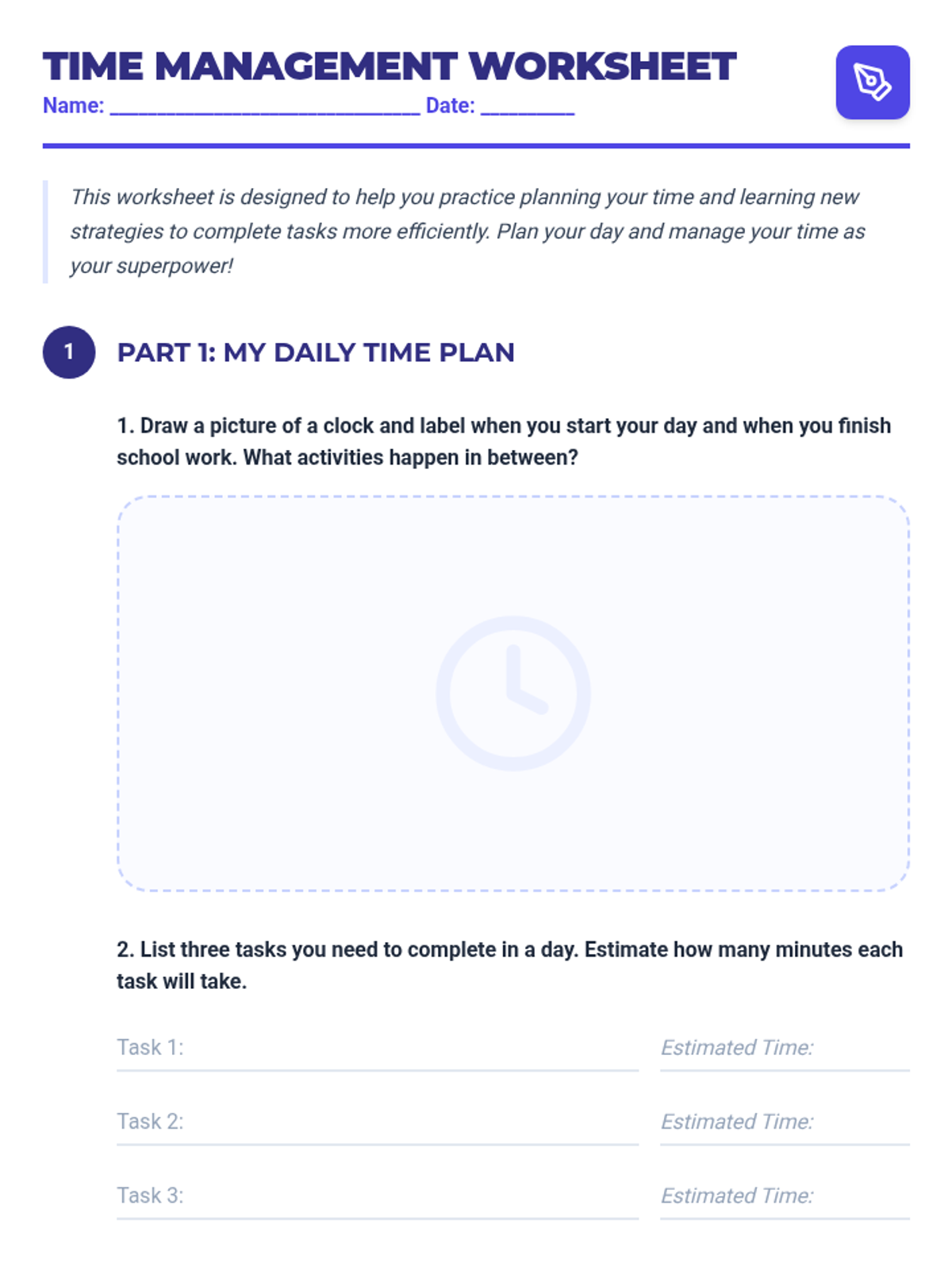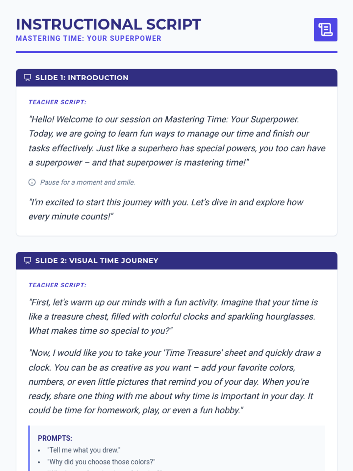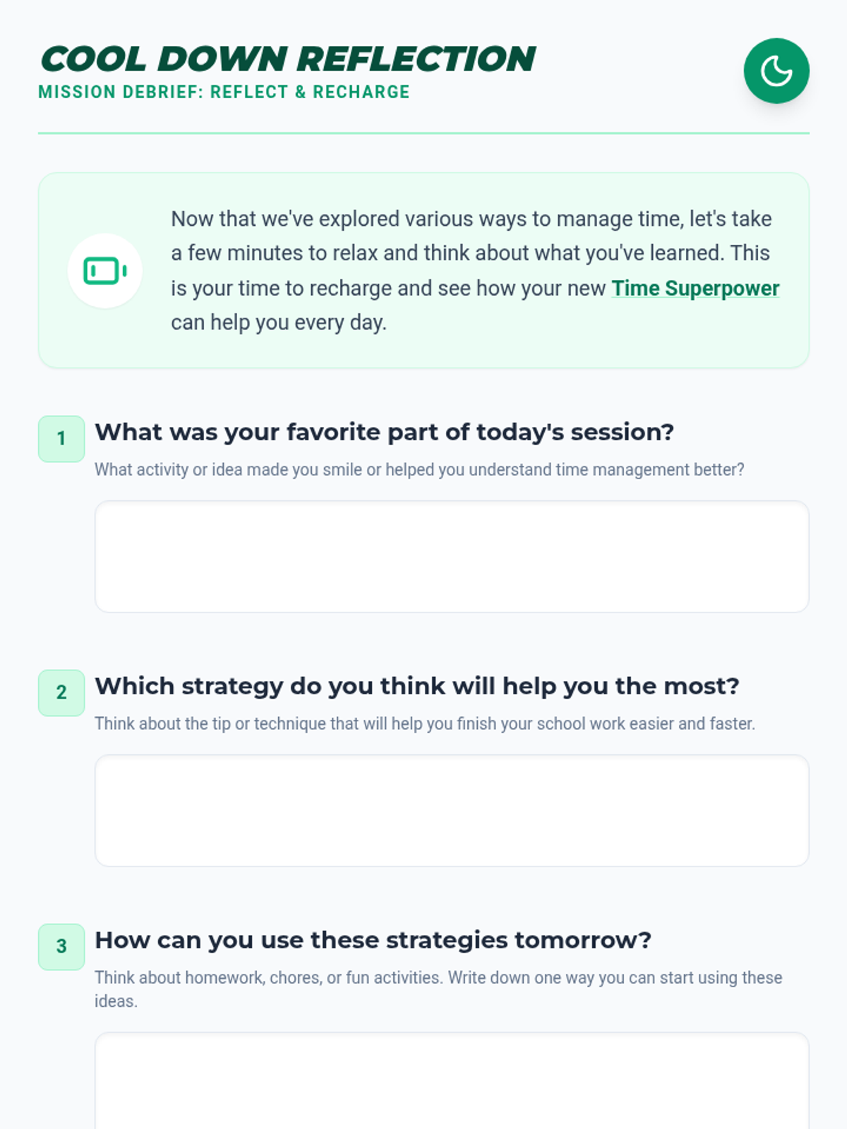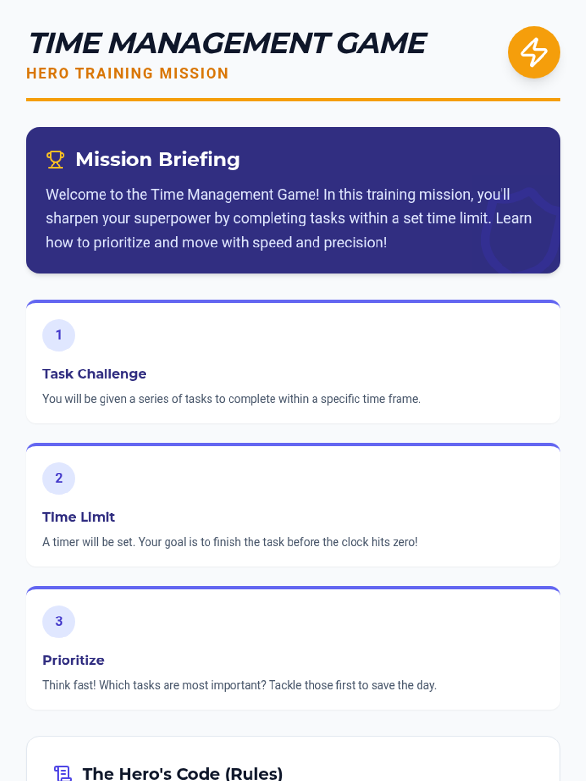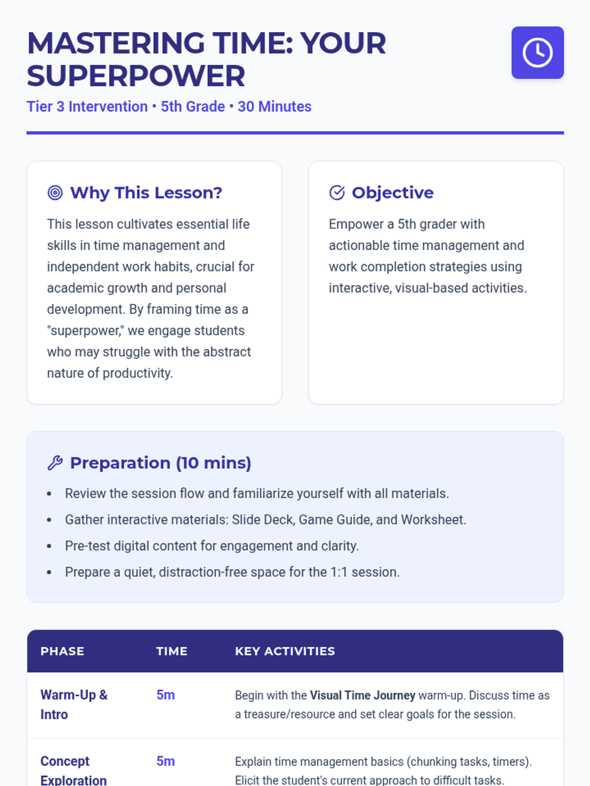A 30-minute Tier 3 intervention lesson for 5th graders focused on work completion and time management strategies through interactive, superhero-themed activities.