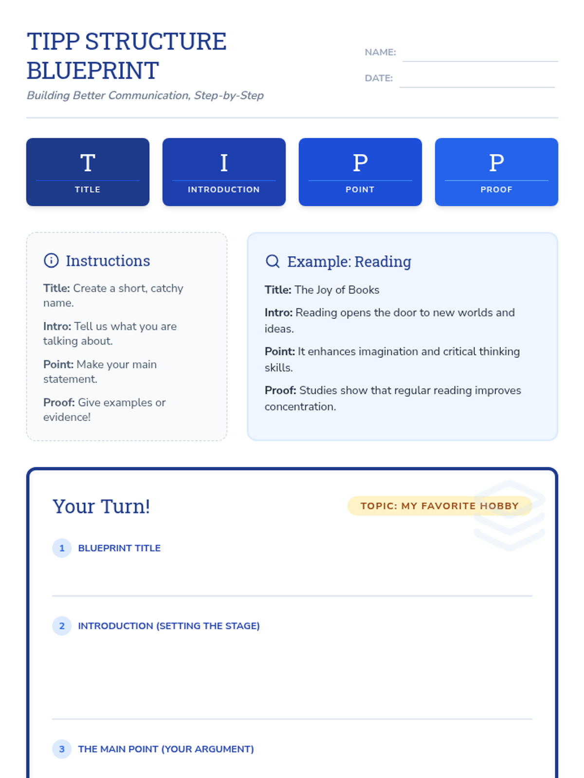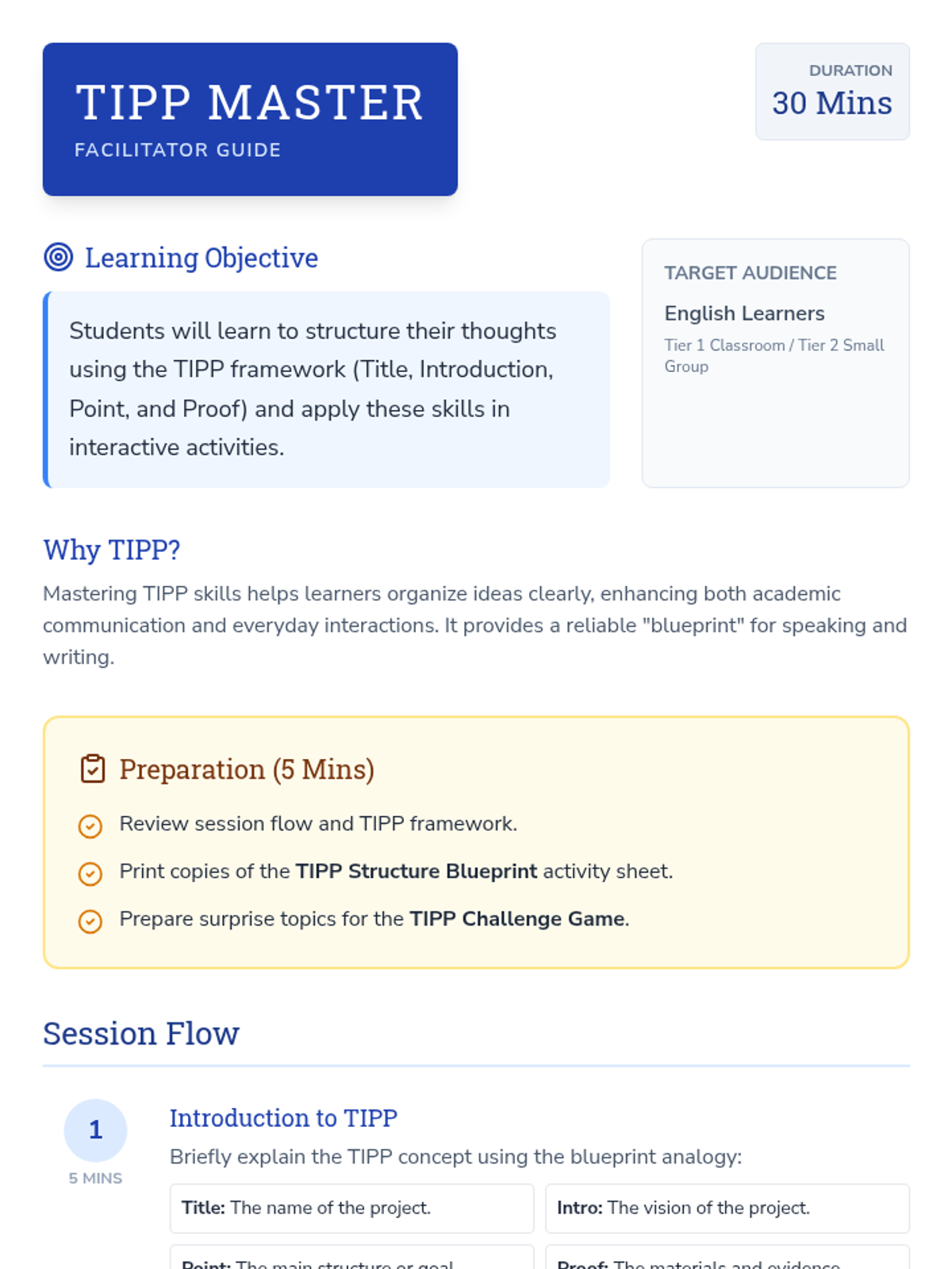 A concise, 30-minute session designed to help English Learners master the TIPP framework (Title, Introduction, Point, Proof) to organize their thoughts and improve communication.