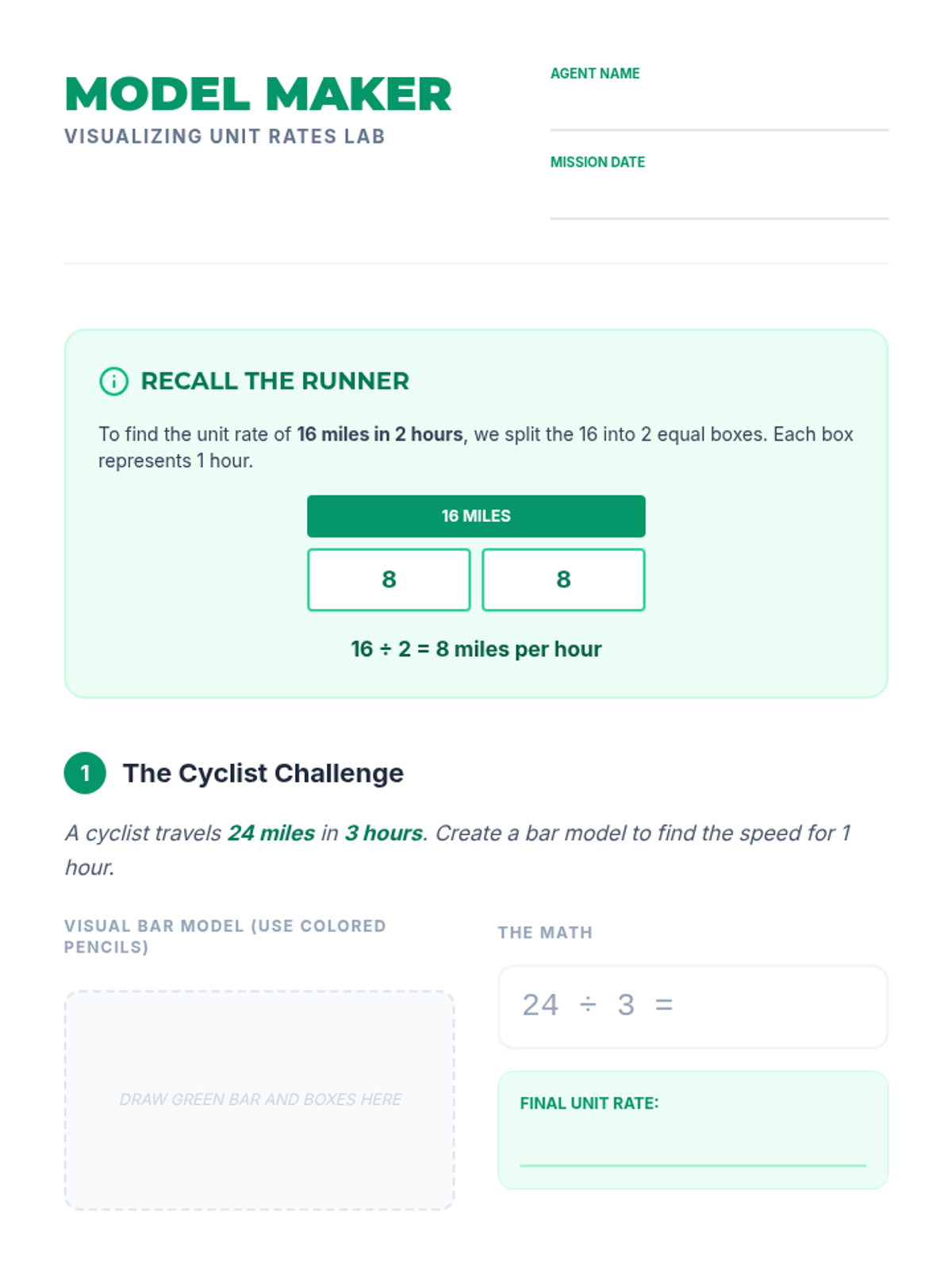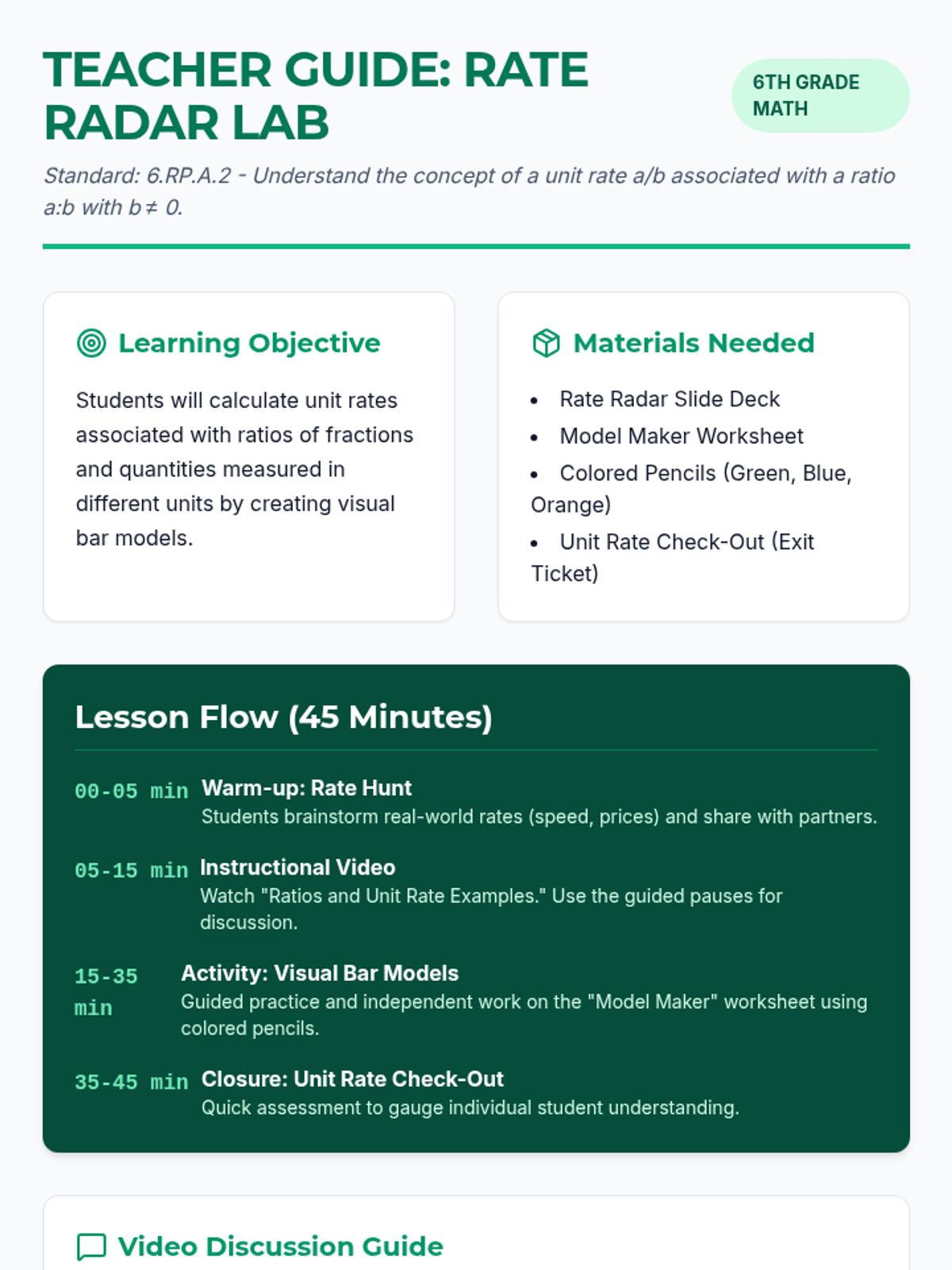 A 6th-grade lesson on calculating unit rates using visual representations like bar models and pie charts, featuring a real-world comparison activity.