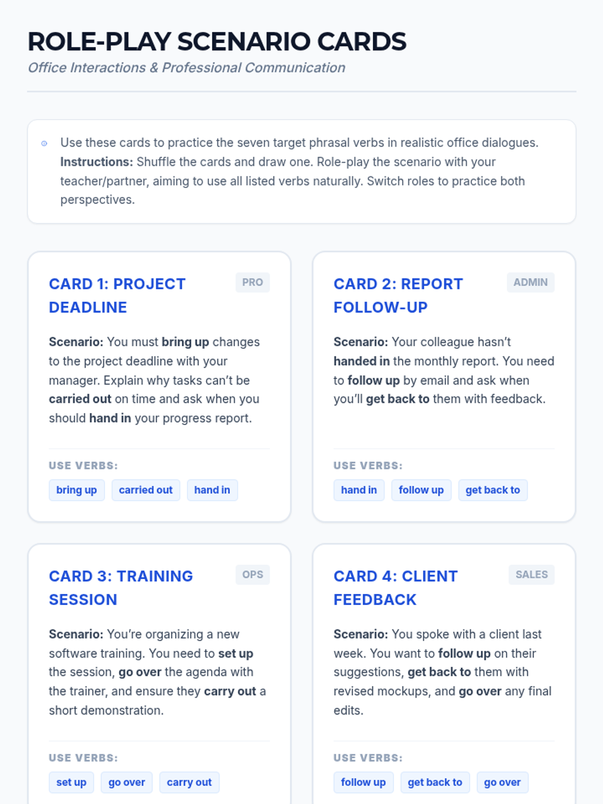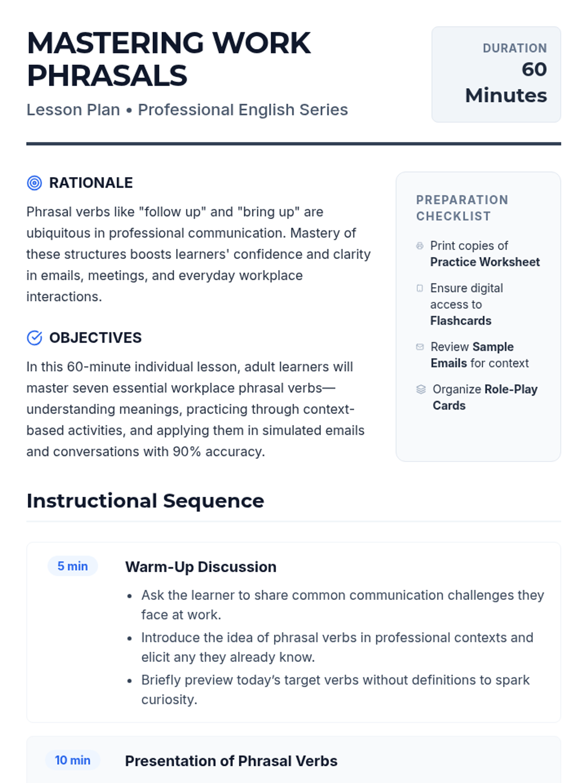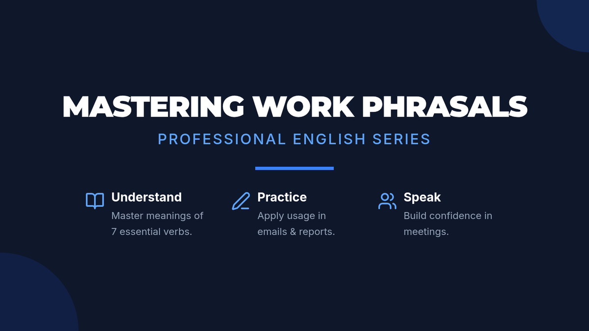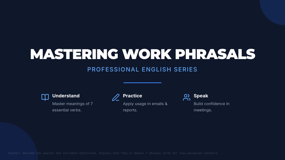 A 60-minute targeted session for adult English learners to master 7 essential phrasal verbs used in professional settings, featuring contextual practice and role-play activities.