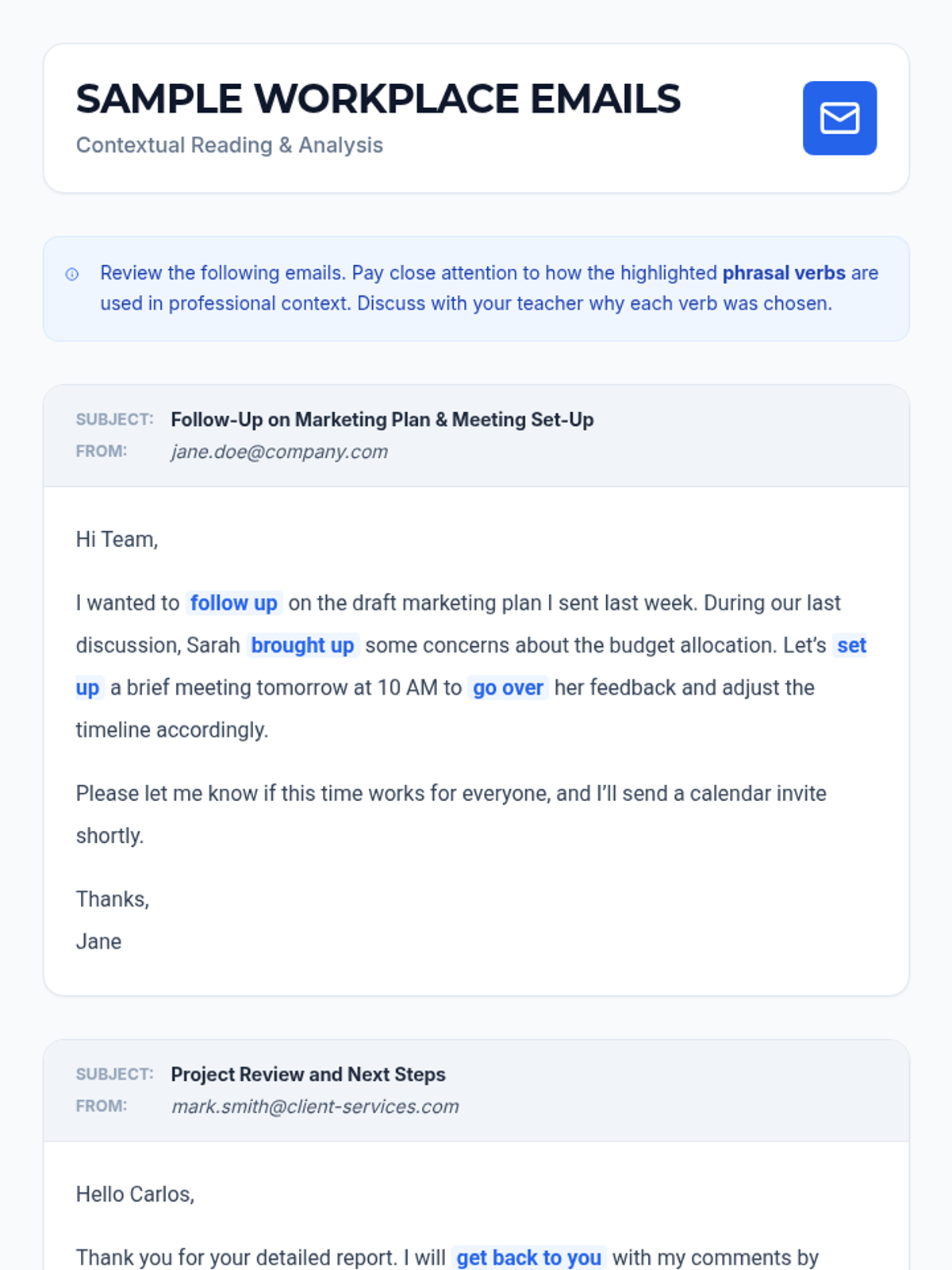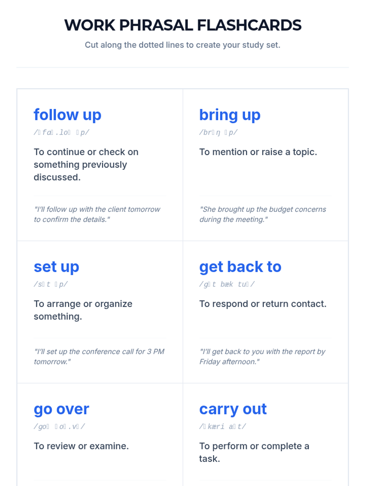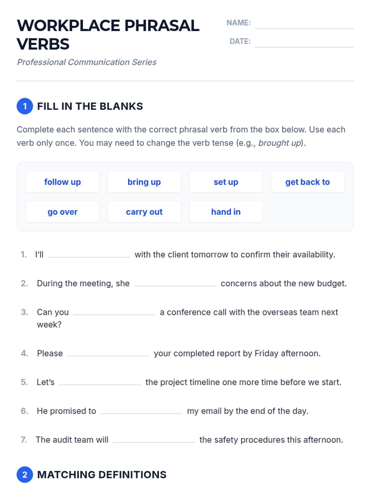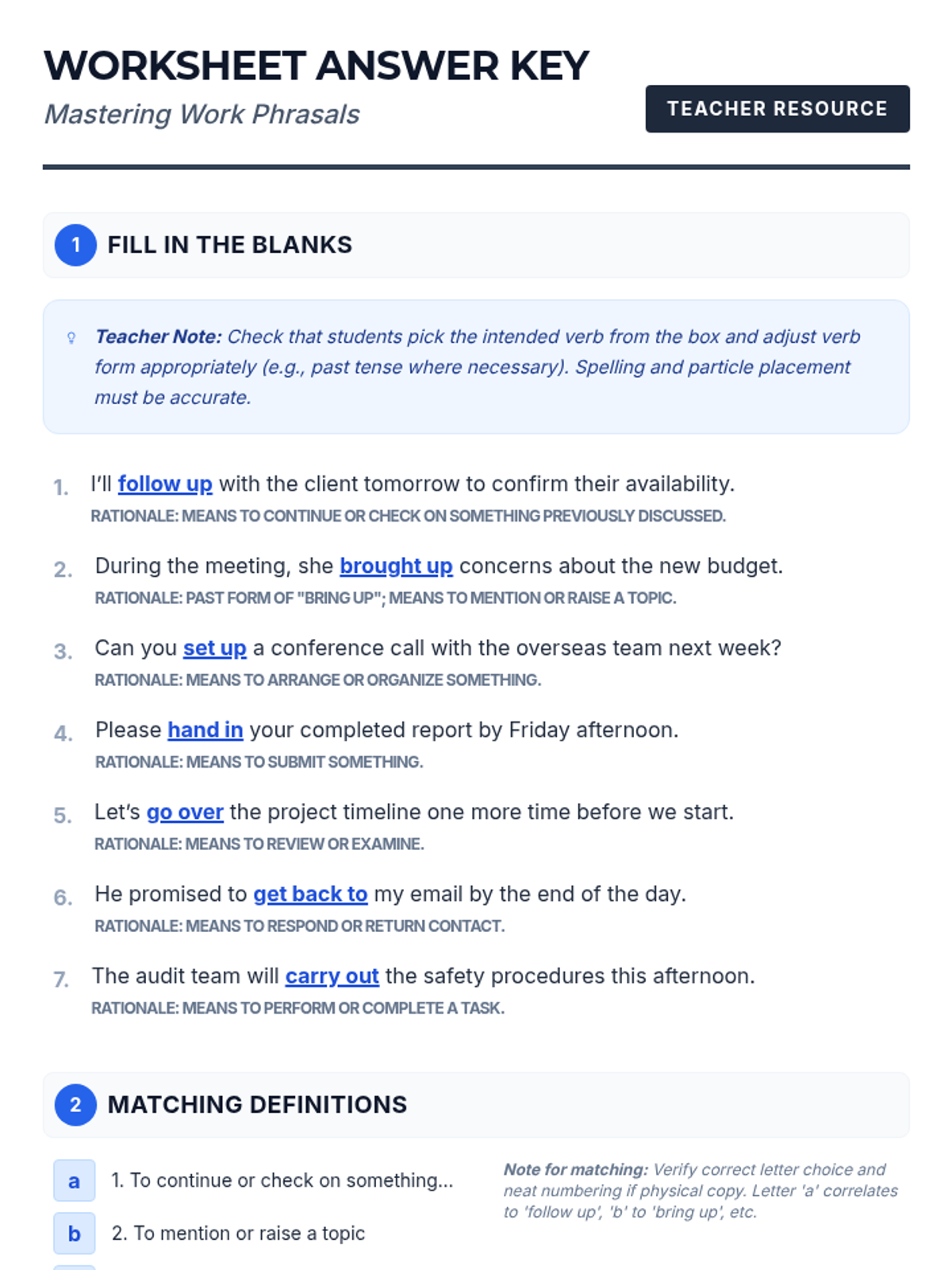 A 60-minute targeted session for adult English learners to master 7 essential phrasal verbs used in professional settings, featuring contextual practice and role-play activities.
