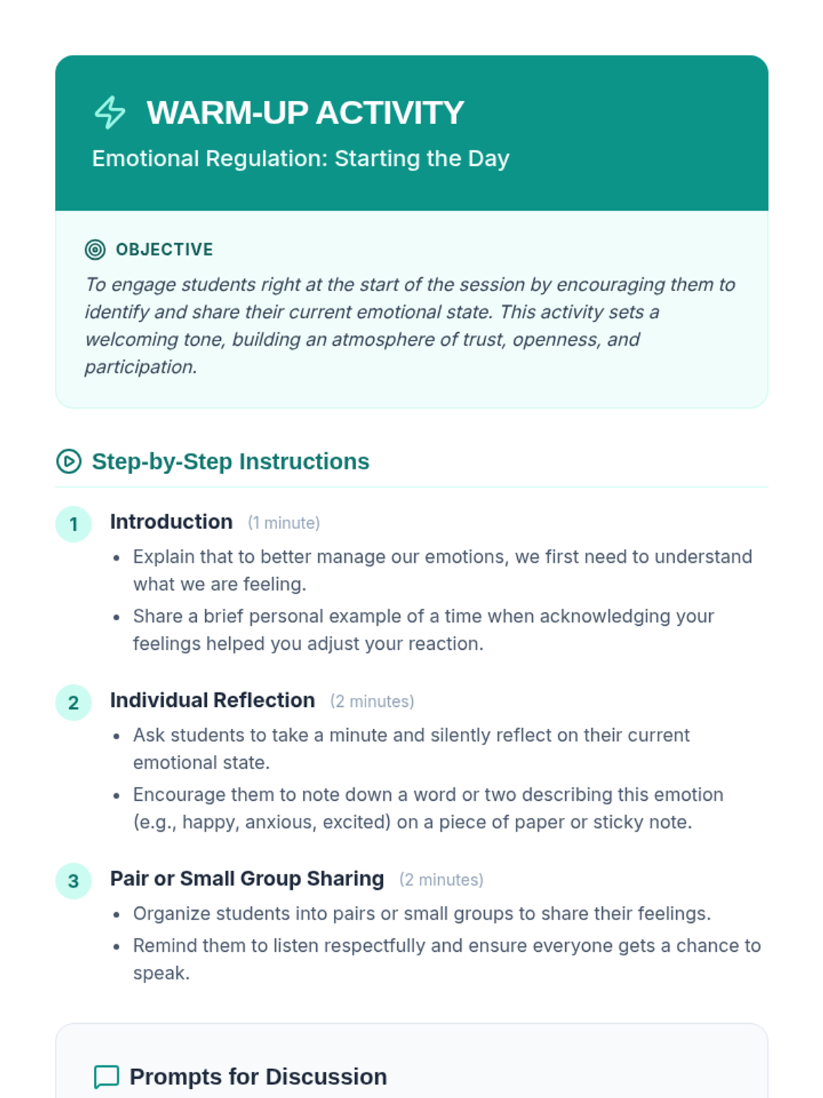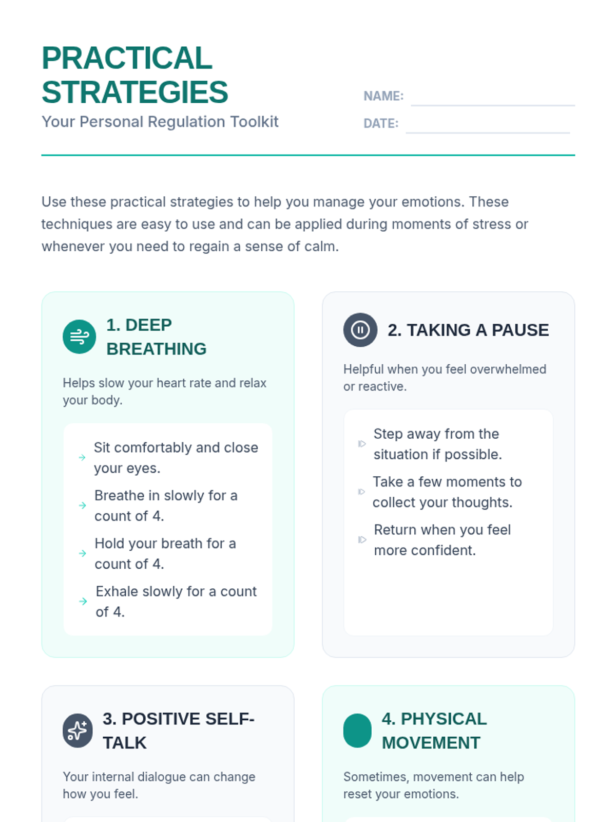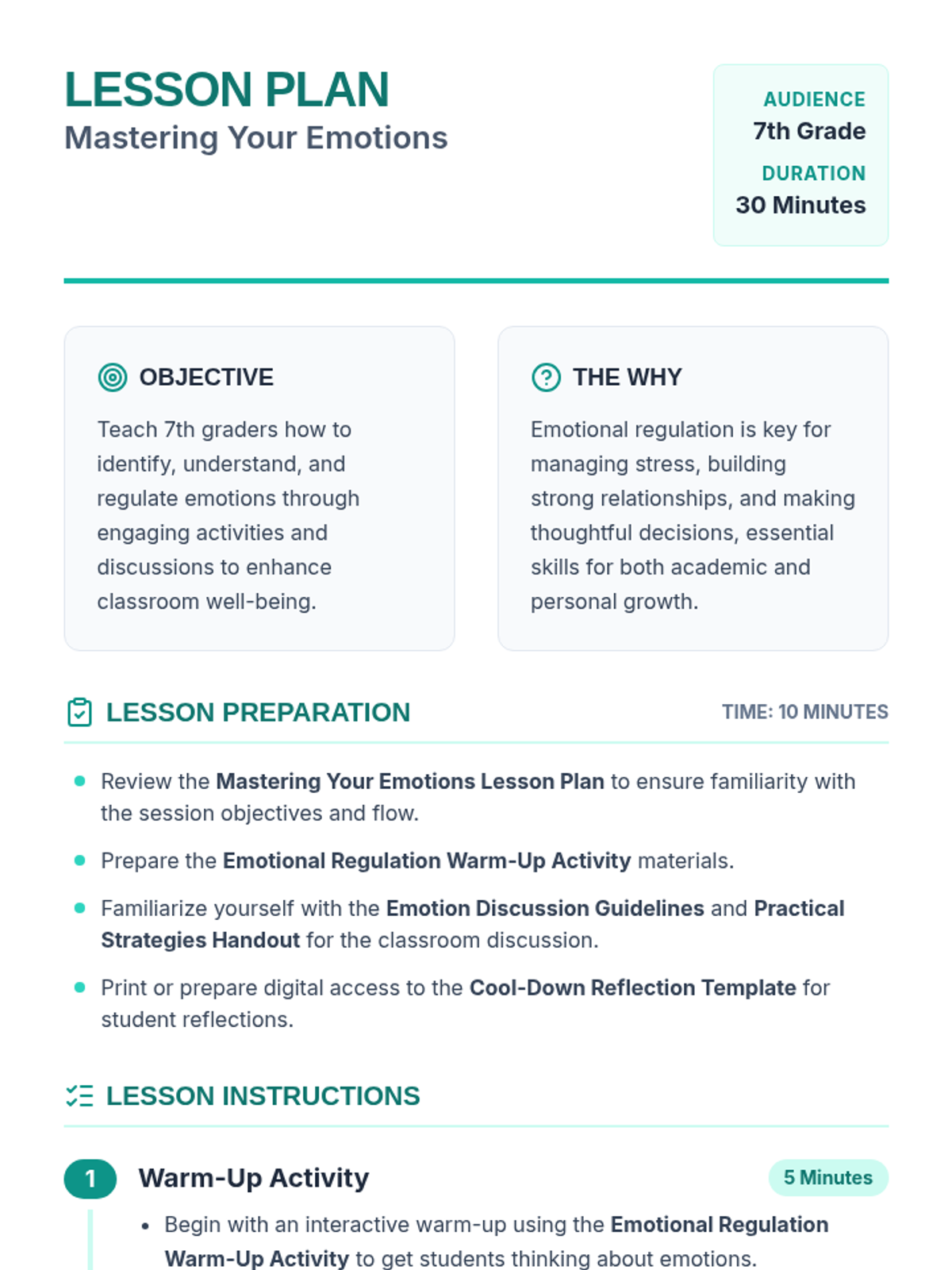 A 30-minute lesson for 7th-grade students on identifying and managing emotions through practical regulation strategies like deep breathing and positive self-talk.
