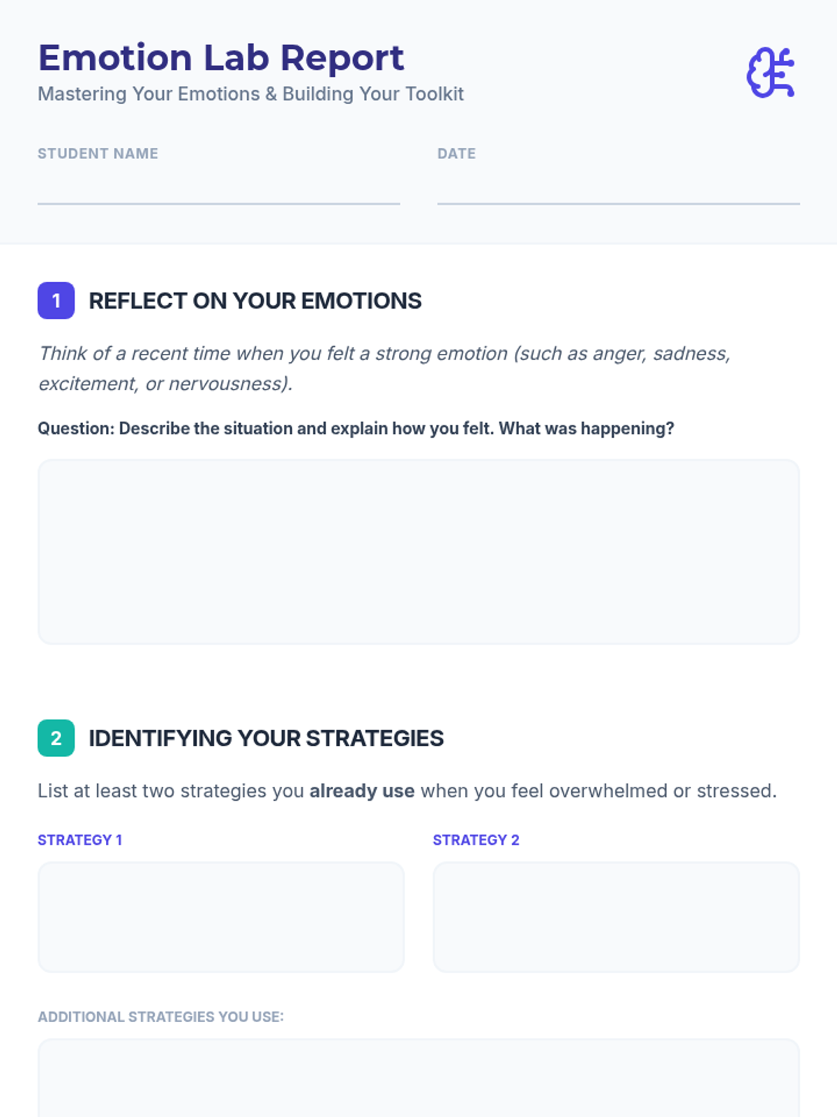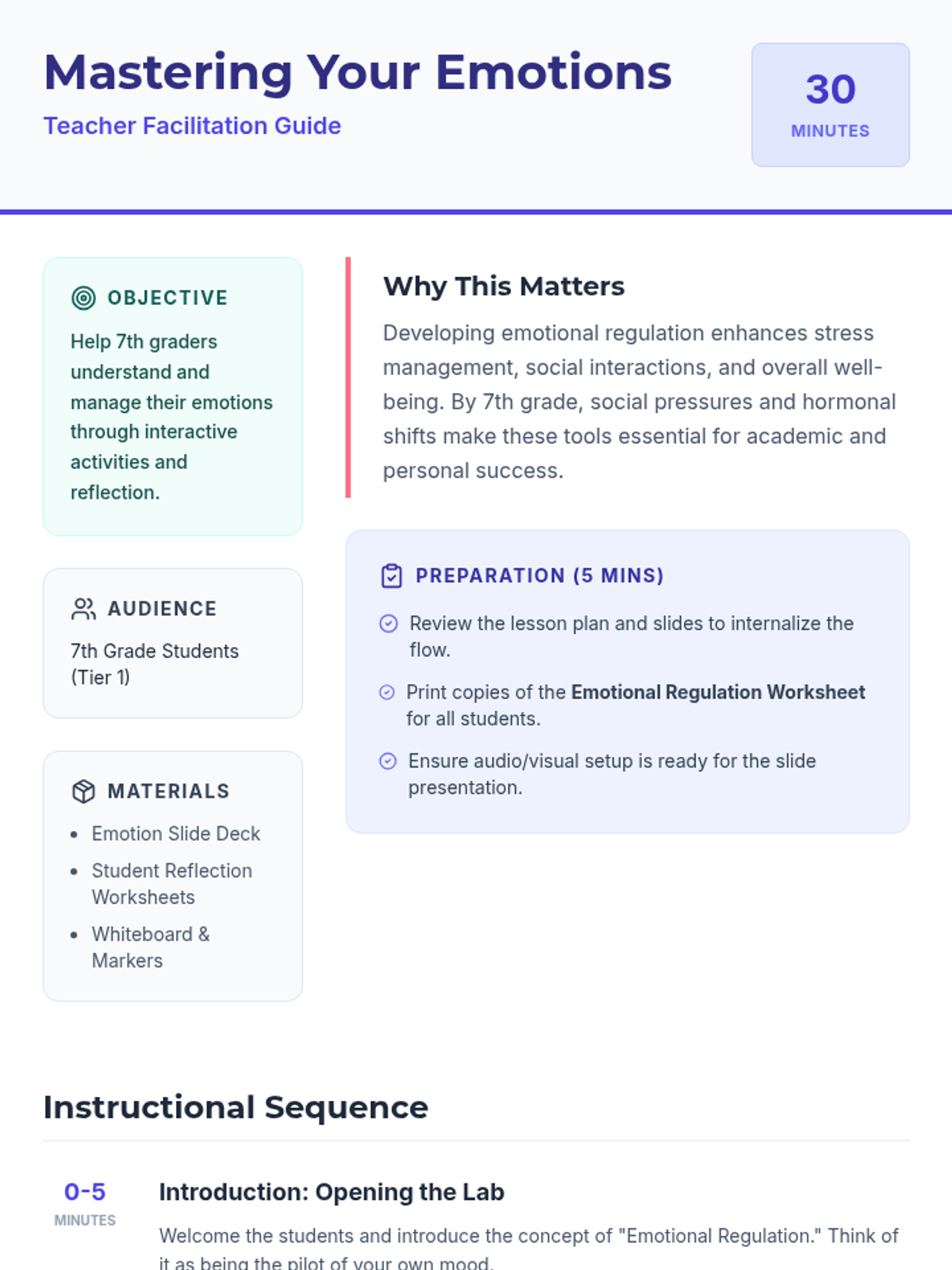 This lesson focuses on teaching 7th graders essential emotional regulation skills to help them manage stress and improve social interactions. Through discussion and reflection, students will build a toolkit of strategies for navigating strong feelings.